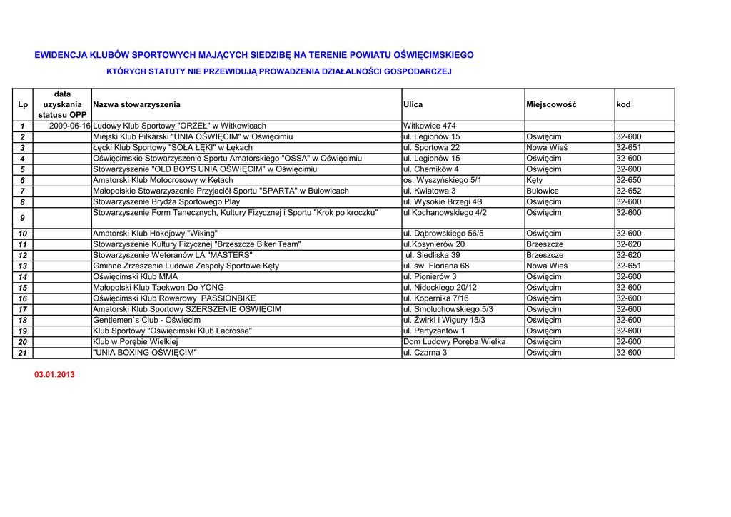 EWIDENCJA KLUBÓW SPORTOWYCH MAJĄCYCH SIEDZIBĘ NA TERENIE POWIATU OŚWIĘCIMSKIEGO KTÓRYCH STATUTY NIE PRZEWIDUJĄ PROWADZENIA DZIAŁALNOŚCI GOSPODARCZEJ Lp 1 2 3 4 5 6 7 8 9 data uzyskania Nazwa stowarzyszenia statusu OPP 2009-06-16 Ludowy Klub Sportowy "ORZEŁ" w Witkowicach Miejski Klub Piłkarski "UNIA OŚWIĘCIM" w Oświęcimiu Łęcki Klub Sportowy "SOŁA ŁĘKI" w Łękach Oświęcimskie Stowarzyszenie Sportu Amatorskiego "OSSA" w Oświęcimiu Stowarzyszenie "OLD BOYS UNIA OŚWIĘCIM" w Oświęcimiu Amatorski Klub Motocrosowy w Kętach Małopolskie Stowarzyszenie Przyjaciół Sportu "SPARTA" w Bulowicach Stowarzyszenie BrydŜa Sportowego Play Stowarzyszenie Form Tanecznych, Kultury Fizycznej i Sportu "Krok po kroczku" Amatorski Klub Hokejowy "Wiking" Stowarzyszenie Kultury Fizycznej "Brzeszcze Biker Team" Stowarzyszenie Weteranów LA "MASTERS" Gminne Zrzeszenie Ludowe Zespoły Sportowe Kęty Oświęcimski Klub MMA Małopolski Klub Taekwon-Do YONG Oświęcimski Klub Rowerowy PASSIONBIKE Amatorski Klub Sportowy SZERSZENIE OŚWIĘCIM Gentlemen`s Club - Oświecim Klub Sportowy "Oświęcimski Klub Lacrosse" Klub w Porębie Wielkiej "UNIA BOXING OŚWIĘCIM" 10 11 12 13 14 15 16 17 18 19 20 21 03.01.2013 Ulica Miejscowość kod Witkowice 474 ul. Legionów 15 ul. Sportowa 22 ul. Legionów 15 ul. Chemików 4 os. Wyszyńskiego 5/1 ul. Kwiatowa 3 ul. Wysokie Brzegi 4B ul Kochanowskiego 4/2 Oświęcim Nowa Wieś Oświęcim Oświęcim Kęty Bulowice Oświęcim Oświęcim 32-600 32-651 32-600 32-600 32-650 32-652 32-600 32-600 ul. Dąbrowskiego 56/5 ul.Kosynierów 20 ul. Siedliska 39 ul. św. Floriana 68 ul. Pionierów 3 ul. Nideckiego 20/12 ul. Kopernika 7/16 ul. Smoluchowskiego 5/3 ul. świrki i Wigury 15/3 ul. Partyzantów 1 Dom Ludowy Poręba Wielka ul. Czarna 3 Oświęcim Brzeszcze Brzeszcze Nowa Wieś Oświęcim Oświęcim Oświęcim Oświęcim Oświęcim Oświęcim Oświęcim Oświęcim 32-600 32-620 32-620 32-651 32-600 32-600 32-600 32-600 32-600 32-600 32-600 32-600