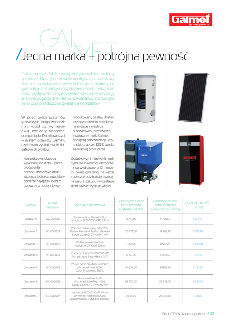GAL / Jedna marka – potrójna pewność MET Galmet wprowadził do swojej oferty kompletne systemy grzewcze. Dostępne w wielu konfiguracjach zestawy złożone są wyłącznie z własnych produktów firmy, co gwarantuje ich maksymalną niezawodność, funkcjonalność i wydajność. Nabywcy systemów Galmetu zyskują znaczną wygodę dzięki temu rozwiązaniu, promocyjne ceny oraz przedłużoną gwarancję kompletów. W skład takich systemów grzewczych mogą wchodzić m.in.: kocioł c.o., wymiennik c.w.u., kolektory słoneczne, pompa ciepła. Dzięki inwestycji w system grzewczy Galmetu użytkownik zyskuje wiele dodatkowych profitów: produkowany zestaw dostarczy bezpośrednio do Klienta na miejsce inwestycji, ·· autoryzowani, przeszkoleni instalatorzy marki Galmet podłączą całą instalację, która objęta będzie 100 % opieką serwisową producenta. ·· kompleksową obsługę wykonaną od A do Z przez producenta, ·· pomoc i doradztwo działu wsparcia technicznego, który dobierze najlepszy system grzewczy, a następnie wy- Dodatkowymi, niezwykle ważnymi dla inwestora elementami są wydłużony o 12 miesięcy okres gwarancji na każde z urządzeń oraz bardziej atrakcyjne warunki zakupu – w zestawie klient zawsze zyskuje więcej! Nazwa Nr kat. zestawu Specyfikacja zestawu Sumaryczna cena kat. urządzeń systemu (netto) Promocyjna kat. cena systemu grzewczego (netto) OSZCZĘDNOŚĆ (netto) Zestaw nr 1 SG-000001 Zestaw solarny Premium Plus Kocioł c.o. EKO-GT KWPD 22 kW 15 774,00 14 196,60 1 577,40 Zestaw nr 2 SG-000002 Zbiornik kombinowany 380/120 L Zestaw Premium Maxi bez zbiornika Kocioł c.o. EKO-GT KWP 17 kW 20 273,00 18 245,70 2 027,30 Zestaw nr 3 SG-000003 Zestaw solarny Premium Kocioł c.o. GT KWR 22 kW 9 958,00 8 557,20 1 400,80 Zestaw nr 4 SG-000004 Kocioł c.o. EKO-GT KWPD 16 kW Pompa ciepła EasyAirBasic 2GT 13 155,00 11 839,50 1 315,50 Zestaw nr 5 SG-000005 Pompa ciepła NewMiniLand 9 GT Wymiennik Maxi 300 L Zbiornik buforowy 380 L 24 225,00 21 802,50 2 422,50 Zestaw nr 6 SG-000006 Pompa AirMax 9 kW Wymiennik Maxi Plus 400 L Kocioł c.o. EKO-GT KWP 12 kW 33 270,00 29 943,00 3 327,00 Zestaw nr 7 SG-000007 Kocioł c.o. EKO-GT KWP 30 kW Wymiennik Multi Inox 1000 L Zestaw solarny 7 płyt, bez zbiornika 29 811,00 26 829,90 2 981,10 tadmar partner / 23