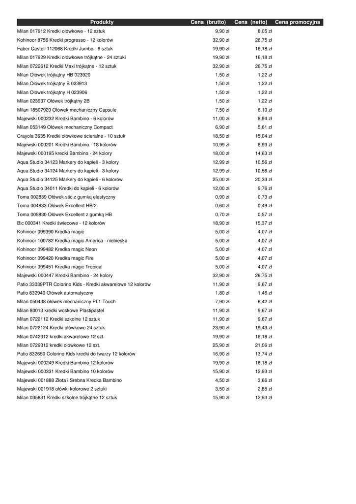 Produkty Milan 017912 Kredki ołówkowe - 12 sztuk Cena (brutto) Cena (netto) 9,90 zł 8,05 zł Kohinoor 8756 Kredki progresso - 12 kolorów 32,90 zł 26,75 zł Faber Castell 112068 Kredki Jumbo - 6 sztuk 19,90 zł 16,18 zł Milan 017929 Kredki ołówkowe trójkątne - 24 sztuki 19,90 zł 16,18 zł Milan 0722612 Kredki Maxi trójkątne - 12 sztuk 32,90 zł 26,75 zł Milan Ołówek trójkątny HB 023920 1,50 zł 1,22 zł Milan Ołówek trójkątny B 023913 1,50 zł 1,22 zł Milan Ołówek trójkątny H 023906 1,50 zł 1,22 zł Milan 023937 Ołówek trójkątny 2B 1,50 zł 1,22 zł Milan 18507920 Ołówek mechaniczny Capsule 7,50 zł 6,10 zł Majewski 000232 Kredki Bambino - 6 kolorów 11,00 zł 8,94 zł Milan 053149 Ołówek mechaniczny Compact 6,90 zł 5,61 zł Crayola 3635 Kredki ołówkowe ścieralne - 10 sztuk 18,50 zł 15,04 zł Majewski 000201 Kredki Bambino - 18 kolorów 10,99 zł 8,93 zł Majewski 000195 kredki Bambino - 24 kolory 18,00 zł 14,63 zł Aqua Studio 34123 Markery do kąpieli - 3 kolory 12,99 zł 10,56 zł Aqua Studio 34124 Markery do kąpieli - 3 kolory 12,99 zł 10,56 zł Aqua Studio 34125 Markery do kąpieli - 6 kolorów 25,00 zł 20,33 zł Aqua Studio 34011 Kredki do kąpieli - 6 kolorów 12,00 zł 9,76 zł Toma 002839 Ołówek stic z gumką elastyczny 0,90 zł 0,73 zł Toma 004833 Ołówek Excellent HB/2 0,60 zł 0,49 zł Toma 005830 Ołówek Excellent z gumką HB 0,70 zł 0,57 zł 18,90 zł 15,37 zł Kohinoor 099390 Kredka magic 5,00 zł 4,07 zł Kohinoor 100782 Kredka magic America - niebieska 5,00 zł 4,07 zł Kohinoor 099482 Kredka magic Neon 5,00 zł 4,07 zł Kohinoor 099420 Kredka magic Fire 5,00 zł 4,07 zł Bic 000341 Kredki świecowe - 12 kolorów Kohinoor 099451 Kredka magic Tropical 5,00 zł 4,07 zł Majewski 000447 Kredki Bambino - 24 kolory 32,90 zł 26,75 zł Patio 33039PTR Colorino Kids - Kredki akwarelowe 12 kolorów 11,90 zł 9,67 zł Patio 832940 Ołówek automatyczny 1,80 zł 1,46 zł Milan 050438 ołówek mechaniczny PL1 Touch 7,90 zł 6,42 zł Milan 80013 kredki woskowe Plastipastel 11,90 zł 9,67 zł Milan 0722112 Kredki szkolne 12 sztuk 11,90 zł 9,67 zł Milan 0722124 Kredki ołówkowe 24 sztuk 23,90 zł 19,43 zł Milan 0742312 kredki akwarelowe 12 szt. 19,90 zł 16,18 zł Milan 0729312 kredki ołówkowe 12 szt. 25,90 zł 21,06 zł Patio 832650 Colorino Kids kredki do twarzy 12 kolorów 16,90 zł 13,74 zł Majewski 000249 Kredki Bambino 12 kolorów 19,90 zł 16,18 zł Majewski 000331 Kredki Bambino 10 kolorów 15,90 zł 12,93 zł 4,50 zł 3,66 zł Majewski 001888 Złota i Srebna Kredka Bambino Majewski 001918 ołówki kolorowe 2 sztuki Milan 035831 Kredki szkolne trójkątne 12 sztuk 3,50 zł 2,85 zł 15,90 zł 12,93 zł Cena promocyjna