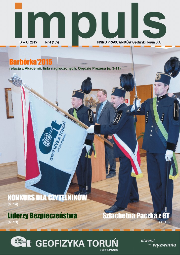 IX – XII 2015 Nr 4 (165) PISMO PRACOWNIKÓW Geofizyki Toruń S.A. Barbórka’2015 relacja z Akademii, lista nagrodzonych, Orędzie Prezesa (s. 3-11) KONKURS DLA CZYTELNIKÓW (s. 14) Liderzy Bezpieczeństwa Szlachetna Paczka z GT (s. 13) (s. 15) impuls 04 (165) strona 1 w numerze co Motto numeru Przyszła nareszcie chwila ciszy uroczystej, Stało się — między ludzi wszedł Mistrz Wiekuisty Barbórka’2015 Cyprian Kamil Norwid Koleżanki i Koledzy! Miesiąc grudzień jest bogaty w wydarzenia. Za nami uroczystości Barbórkowe, a przed nami Święta Bożego Narodzenia. Zawsze czekamy na nie z niecierpliwością, bo wnoszą one do naszego zabieganego życia klimat, który sprawia, że widzimy świat wolny od trosk, pełen ciepła, wzajemnej życzliwości i szacunku. Chciałbym Wam życzyć takich właśnie Świąt: pogodnych i beztroskich, spędzonych w towarzystwie kochanych i kochających ludzi. Niech przy choince zabrzmi tradycyjna kolęda, a pod nią pojawią się prezenty: symbol naszej uczynności i życzliwości. Niech podczas dzielenia się opłatkiem znikną urazy i pretensje - i niech już nie wracają! Spróbujmy zatrzymać ten magiczny wigilijny klimat na dłużej. Najlepiej byłoby, gdyby nam towarzyszył przez cały następny rok. A skoro o Nowym Roku mowa: pragnę Wam życzyć, aby był on dla Was dobry i pomyślny. To znaczy, aby życie toczyło się po Waszej myśli, biegło po zaplanowanej ścieżce. Za Waszym pośrednictwem pragnę przekazać także najserdeczniejsze życzenia świąteczne i noworoczne Waszym Rodzinom i Bliskim. gdzie pod znakiem trudnego roku Relacja z uroczystości Barbórkowych w GT. 3 Barbórkowa Msza św. 7 8 Fotorelacja z uroczystej Mszy św. Barbórka’2015 Lista odznaczonych Barbórka’2015 Orędzie Barbórkowe Prezesa Piotra Antonika. 9 Liderzy Bezpieczeństwa Sylwetki tegorocznych laureatów programu motywacyjnego w zakresie bezpieczeństwa pracy prezentuje Monika Ulman-Stanek. 13 Europejski Dzień Bez Samochodu w GT Promowanie roweru jako środka lokomocji pozwalającego na dotarcie do pracy w obiektywie Moniki Ulman-Stanek i Przemka Mazurka. Konkurs dla czytelników Barbórka‘1966 13 14 Pracownicy GT w Drużynie Szlachetnej Paczki! Drodzy Czytelnicy! zdrowych, radosnych, pełnych rodzinnego ciepła Świąt Bożego Narodzenia, pomyślności, sukcesów, spełnienia planów i marzeń w nadchodzącym Nowym Roku życzy Impuls Pismo pracowników GEOFIZYKI TORUŃ S.A. Korekta: Sylwia Śliczner-Koślacz, tel. 340 Redakcja: Maciej Stawinoga, tel. 102 [email protected] Zapraszamy do współpracy! impuls 04 (165) strona 2 Dzięki zaangażowaniu Pracowników GT, w Toruniu, w Pile i w grupach sejsmicznych zebrano 4 000 zł dla wsparcia ojca samotnie wychowującego czwórkę dzieci. 15 XL Rajd Barbórkowy im. Czesława Szatko Relacja z Rajdu Barbórkowego organizowanego od lat dla dzieci i młodzieży przez GT i Oddział Miejski PTTK. 18 Na okładce: Poczet Sztandarowy GT Fot. Piotr Ziembikiewicz Relacja: Maciej Stawinoga Foto: Piotr Ziembikiewicz Barbórka’2015 Pod znakiem trudnego roku Tegoroczne Święto Górnika celebrowaliśmy 3 grudnia i 4 grudnia. Pierwszego dnia miała miejsce Akademia Barbórkowa, która odbyła się w Sali Parterowej w Biurowcu Spółki. Następnego dnia o godz. 18.00 uczestniczyliśmy w tradycyjnej barbórkowej Mszy św. odprawionej w Parafii pw. Chrystusa Króla. Jest w orkiestrach dętych jakaś siła - szczególnie górniczych! Wejście pocztu sztandarowego GT, rozpoczynające uroczystości barbórkowe Naszą akademię swą obecnością zaszczycili m.in. Wicewojewoda województwa kujawskopomorskiego Pani Elżbieta Rusielewicz, Wicemarszałek województwa kujawsko-pomorskiego Pan Dariusz Kurzawa, Zastępca Prezydenta Torunia Pan Zbigniew Wasielewski. Nie mogło w takim dniu zabraknąć przedstawicieli PGNiG, które reprezentowali Pan Paweł Oziembłowski, Kierownik Działu Nadzoru Prac Geofizycznych oraz Pan Stanisław Bachnacki, Główny Specjalista Geofizyk. Jak zwykle nie zawiedli emerytowani szefowie Geofizyki Toruń: Pan Ernest Poleszak, Ludwik Król i w nowej dla siebie roli Maciej Górski. Obecny również był Prezes Stowarzyszenia Emerytów i Rencistów GT Pan Rudolf Lanc. Nie zawiedli też pracownicy Spółki, którzy szczelnie wypełnili Salę Parterową w Biurowcu. Akademia rozpoczęła się wprowadzeniem sztandaru i odegraniem hymnów: narodowego i górniczego. Prowadzący Akademię Barbórkową Maciej Stawinoga powitał zgromadzonych gości i pracowników GT. Następnie głos zabrał Prezes Zarządu, Pan Piotr Antonik, który skierował do uczestników Barbórkowe Orędzie. Publikujemy je na str. 9-12. Prezes wygłasza Orędzie Barbórkowe impuls 04 (165) strona 3 Po orędziu głos zabrali przedstawiciele władz województwa i miasta. Złożyli wyrazy uznania dla GT za pełnienie roli ambasadora miasta i województwa i życzyli sukcesów na bardzo trudnym rynku poszukiwań naftowych. Wicewojewoda Wicemarszałek Zastępca Prezydenta Torunia Paweł Oziembłowski, Przedstawiciel PGNiG Po tych wystąpieniach przyszedł czas na kolejny tradycyjny element Barbórkowej Akademii: wręczenie orderów i wyróżnień. Rok był bardzo trudny, lecz stanęliśmy na wysokości zadania. Stąd w trakcie tradycyjnej Akademii Barbórkowej wręczono liczne odznaczenia i nadano stopnie górnicze. Odznaczenia ministerialne wręczała Wicewojewoda województwa kujawsko-pomorskiego, pani Elżbieta Rusielewicz, której asystował Prezes Piotr Antonik. Była to odznaka Ministra Gospodarki „Zasłużony Dla Przemysłu Naftowego i Gazowniczego”. (Listę odznaczonych zamieszczamy na stronie 8) Odznaczenia branżowe „Zasłużony Dla Górnictwa Naftowego i Gazownictwa”, stopnie Inżyniera Górniczego, Technika Górniczego i Górnika) wręczał reprezentujący PGNiG Pan Paweł Oziembłowski, w asyście Prezesa Piotra Antonika. (Listę odznaczonych zamieszczamy na stronie 8) Po odznaczeniach ministerialnych i branżowych przys