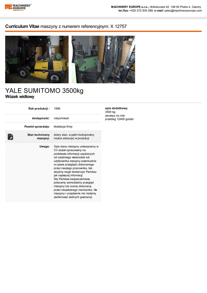 MACHINERY EUROPE s.r.o., Hněvkovská 42, 148 00 Praha 4, Czechy tel./fax: +420 272 935 288, e-mail: [email protected] Curriculum Vitae maszyny z numerem referencyjnym: X 12757 YALE SUMITOMO 3500kg Wózek widłowy Rok produkcji : dostępność: Powód sprzedaży: Stan techniczny maszyny: Uwaga: 1996 natychmiast likwidacja firmy dobry stan, w pełni funkcjonalny można zobaczyć w produkcji Opis stanu maszyny umieszczony w CV został opracowany na podstawie informacji uzyskanych od ostatniego właściciela lub użytkownika maszyny ewentualnie w czasie przeglądu dokonanego przez naszego pracownika, tak abyśmy mogli dostarczyć Państwu jak najwięcej informacji. Dla Państwa bezpieczeństwa polecamy samodzielny przegląd maszyny lub ocenę dokonaną przez niezależnego mechanika. Na maszyny i urządzenie nie możemy zaoferować żadnych gwarancji. opis dodatkowy: 3500 kg zaczepy na role przebieg 12400 godzin