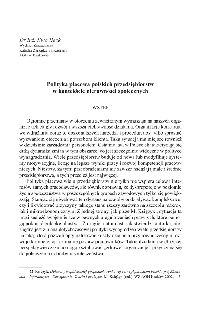 Dr inż. Ewa Beck Polityka płacowa polskich przedsiębiorstw w