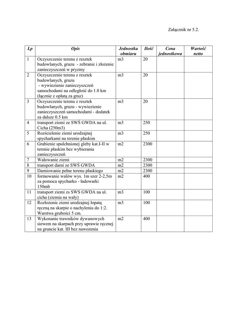 Załącznik nr 5.2. Lp 1 2 3 4 5 6 7 8 9 10 11 12 13 Opis Oczyszczenie terenu z resztek budowlanych, gruzu - zebranie i złożenie zanieczyszczeń w pryzmy Oczyszczenie terenu z resztek budowlanych, gruzu - wywiezienie zanieczyszczeń samochodami na odległość do 1.0 km (łącznie z opłatą za gruz) Oczyszczenie terenu z resztek budowlanych, gruzu - wywiezienie zanieczyszczeń samochodami - dodatek za dalsze 0.5 km transport ziemi ze SWŚ GWDA na ul. Cicha (250m3) Rozścielenie ziemi urodzajnej spycharkami na terenie płaskim Grabienie spulchnionej gleby kat.I-II w terenie płaskim bez wybierania zanieczyszczeń Wałowanie ziemi transport darni ze SWŚ GWDA Darniowanie pełne terenu płaskiego formowanie walów wys. 1m szer 2-2,5m za pomoca spycharko - ładowarki 150mb transport ziemi zs SWS GWDA na ul. cicha (ziemia na wały) Rozłożenie ziemi urodzajnej łopatą ręczną na skarpie o nachyleniu do 1:2. Warstwa grubości 5 cm. Wykonanie trawników dywanowych siewem na skarpach przy uprawie ręcznej na gruncie kat. III bez nawożenia Jednostka obmiaru m3 Ilość 20 m3 20 m3 20 m3 250 m3 250 m2 2300 m2 m2 m2 m2 2300 2300 2300 400 m3 100 m3 100 m2 400 Cena jednostkowa Wartość netto