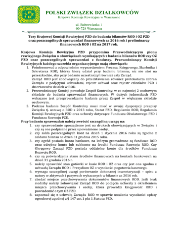 POLSKI ZWIĄZEK DZIAŁKOWCÓW Krajowa Komisja Rewizyjna w Warszawie ul. Bobrowiecka 1 00-728 Warszawa Tezy Krajowej Komisji Rewizyjnej PZD do badania bilansów ROD i OZ PZD oraz poszczególnych sprawozdań finansowych za 2016 rok i preliminarzy finansowych ROD i OZ na 2017 rok. Krajowa Komisja Rewizyjna PZD przypomina Przewodniczącym pionu rewizyjnego Związku o obowiązkach wynikających z badania bilansów ROD czy OZ PZD oraz poszczególnych sprawozdań z funduszy. Przewodniczący Komisji Rewizyjnych każdego szczebla organizacyjnego mają obowiązek: 1. Poinformować z odpowiednim wyprzedzeniem Prezesa, Księgowego, Skarbnika i Sekretarza ROD, którzy biorą udział przy badaniu bilansu; nic nie stoi na przeszkodzie, aby przy badaniu uczestniczył również cały Zarząd. Zarząd ROD jest zobowiązany do przedstawienia również protokolarza zebrań Zarządu z podjętymi uchwałami, rejestr uchwał oraz rejestr członków PZD i dzierżawców działek w ROD. 2. Przewodniczący Komisji powołuje Zespół Kontrolny, w co najmniej 2-osobowym składzie do badania sprawozdań finansowych. W dużych jednostkach PZD wskazane jest przeprowadzanie badania przez Zespół w większym składzie osobowym. 3. Podczas badania Zespół Kontrolny musi mieć w swojej dyspozycji przepisy Związku tj. ustawę o ROD z 2013 roku, Statut PZD, Regulamin ROD, Regulamin Komisji Rewizyjnych PZD oraz uchwały dotyczące Funduszu Oświatowego PZD i Funduszu Rozwoju PZD. Przy badaniu sprawozdań należy zwrócić szczególną uwagę na: 1. czy sprawozdanie sporządzone jest na drukach obowiązujących w Związku i czy są one podpisane przez upoważnione osoby., 2. czy salda poszczególnych kont na dzień 1 stycznia 2016 roku są zgodne z saldami bilansu na dzień 31 grudnia 2015 roku. 3. czy ogród posiada konto bankowe, na którym gromadzone są fundusze ROD oraz odrębne konto lub subkonto na środki Funduszu Rozwoju ROD. Czy Okręgowy Zarząd PZD posiada oddzielne konto dla środków Funduszu Rozwoju ROD. 4. czy są potwierdzenia stanu środków finansowych na kontach bankowych na dzień 31 grudnia 2016 r. 5. należy sprawdzić stan gotówki w kasie ROD i OZ oraz czy jest ona zgodna z uchwałą Zarządu ROD i Prezydium OZ o wysokości pogotowia kasowego. 6. wymaga szczególnej uwagi porównanie dokonanej inwentaryzacji – spisu z natury w aktywach i pasywach wykazanych w bilansie za 2016 rok. 7. zbadać miejsce przechowywania dokumentów finansowych ROD. Jeśli brak siedziby należy zobowiązać Zarząd ROD do podjęcia uchwały z określeniem miejsca przechowywania i osoby, która prowadzi księgowość ROD i powiadomić o tym OZ PZD. 8. zapoznać się z uchwałą Zarządu ROD w sprawie ustalenia wysokości opłaty ogrodowej zgodnej z § 147 ust.1 pkt 1 Statutu PZD. 9. sprawdzić czy ogród posiada aktualny Nr REGON i NIP. Większość ogrodów ma poprawiony Nr REGON, lecz nie zawsze NIP i należy zwrócić uwagę czy jest właściwa nazwa ogrodu tj. ROD a nie POD. 10. sprawdzić czy Zarząd ROD pobiera opłatę ogrodową zgodną z § 147 ust.1 pkt.2 Statutu PZD określoną w uchwale OZ PZD w tej sprawie oraz terminowość odprowadzania części należnej organom wyższym PZD. 11. zbadać zgodność wydatków z zatwierdzonymi preliminarzami finansowymi. 12. sprawdzić czy rozliczono prowadzone inwestycje i remonty zgodnie z przepisami związkowymi. 13. zbadać płatność składki członkowskiej i opłaty ogrodowej uchwalonej przez Walne Zebranie ROD. W przypadku występujących zaległości zbadać, jakie działania Zarząd podjął w tej sprawie. Zbadać terminowość odprowadzenia części opłaty ogrodowej-partycypacji do OZ PZD. 14. ubezpieczenie majątku ROD. 15. osoby materialnie odpowiedzialne za składniki majątkowe posiadają obowiązek złożenia oświadczenia o odpowiedzialności majątkowej. 16. sprawdzić terminowość odprowadzania gotówki na konto bankowe ROD przez Skarbnika ROD, odprowadzenie środków finansowych do OZ PZD i należnych podatków. 17. zbadać zobowiązania ROD i OZ , jeśli takie są to, z jakiego tytułu i ich przyczyny. 18. gospodarowanie środkami Funduszu Oświatowego i Rozwoju ROD, musi być zgodne z uchwałami Krajowej Rady PZD i zapisami Statutu PZD w tej sprawie. 19. Zbadać czy Zarząd ROD i Komisja Rewizyjna ROD posiadają pieczątki o właściwej treści. Przy sporządzaniu protokołu z badania sprawozdań finansowych należy bezwzględnie zapisać w ilu jednobrzmiących egzemplarzach go sporządzono i określić dla kogo jest on przeznaczony. Krajowa Komisja Rewizyjna Polskiego Związku Działkowców Warszawa, dnia 6 grudnia 2016 r. 2