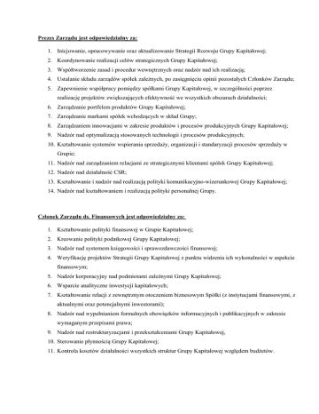 Prezes Zarządu jest odpowiedzialny za: 1. Inicjowanie, opracowywanie oraz aktualizowanie Strategii Rozwoju Grupy Kapitałowej; 2. Koordynowanie realizacji celów strategicznych Grupy Kapitałowej; 3. Współtworzenie zasad i procedur wewnętrznych oraz nadzór nad ich realizacją; 4. Ustalanie składu zarządów spółek zależnych, po zasięgnięciu opinii pozostałych Członków Zarządu; 5. Zapewnienie współpracy pomiędzy spółkami Grupy Kapitałowej, w szczególności poprzez realizację projektów zwiększających efektywność we wszystkich obszarach działalności; 6. Zarządzanie portfelem produktów Grupy Kapitałowej; 7. Zarządzanie markami spółek wchodzących w skład Grupy; 8. Zarządzaniem innowacjami w zakresie produktów i procesów produkcyjnych Grupy Kapitałowej; 9. Nadzór nad optymalizacją stosowanych technologii i procesów produkcyjnych; 10. Kształtowanie systemów wspierania sprzedaży, organizacji i standaryzacji procesów sprzedaży w Grupie; 11. Nadzór nad zarządzaniem relacjami ze strategicznymi klientami spółek Grupy Kapitałowej; 12. Nadzór nad działalność CSR; 13. Kształtowanie i nadzór nad realizacją polityki komunikacyjno-wizerunkowej Grupy Kapitałowej; 14. Nadzór nad kształtowaniem i realizacją polityki personalnej Grupy. Członek Zarządu ds. Finansowych jest odpowiedzialny za: 1. Kształtowanie polityki finansowej w Grupie Kapitałowej; 2. Kreowanie polityki podatkowej Grupy Kapitałowej; 3. Nadzór nad systemem księgowości i sprawozdawczości finansowej; 4. Weryfikację projektów Strategii Grupy Kapitałowej z punktu widzenia ich wykonalności w aspekcie finansowym; 5. Nadzór korporacyjny nad podmiotami zależnymi Grupy Kapitałowej; 6. Wsparcie analityczne inwestycji kapitałowych; 7. Kształtowanie relacji z zewnętrznym otoczeniem biznesowym Spółki (z instytucjami finansowymi, z aktualnymi oraz potencjalnymi inwestorami); 8. Nadzór nad wypełnianiem formalnych obowiązków informacyjnych i publikacyjnych w zakresie wymaganym przepisami prawa; 9. Nadzór nad restrukturyzacjami i przekształceniami Grupy Kapitałowej, 10. Sterowanie płynnością Grupy Kapitałowej; 11. Kontrola kosztów działalności wszystkich struktur Grupy Kapitałowej względem budżetów.