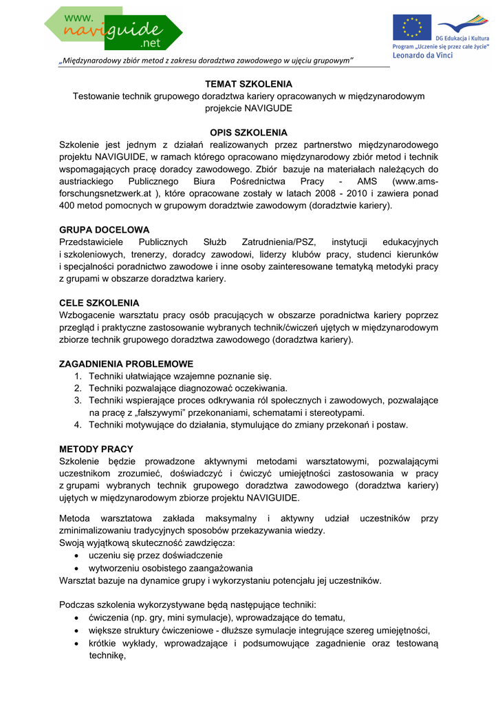 „Międzynarodowy zbiór metod z zakresu doradztwa zawodowego w ujęciu grupowym” TEMAT SZKOLENIA Testowanie technik grupowego doradztwa kariery opracowanych w międzynarodowym projekcie NAVIGUDE OPIS SZKOLENIA Szkolenie jest jednym z działań realizowanych przez partnerstwo międzynarodowego projektu NAVIGUIDE, w ramach którego opracowano międzynarodowy zbiór metod i technik wspomagających pracę doradcy zawodowego. Zbiór bazuje na materiałach należących do austriackiego Publicznego Biura Pośrednictwa Pracy AMS (www.amsforschungsnetzwerk.at ), które opracowane zostały w latach 2008 - 2010 i zawiera ponad 400 metod pomocnych w grupowym doradztwie zawodowym (doradztwie kariery). GRUPA DOCELOWA Przedstawiciele Publicznych Służb Zatrudnienia/PSZ, instytucji edukacyjnych i szkoleniowych, trenerzy, doradcy zawodowi, liderzy klubów pracy, studenci kierunków i specjalności poradnictwo zawodowe i inne osoby zainteresowane tematyką metodyki pracy z grupami w obszarze doradztwa kariery. CELE SZKOLENIA Wzbogacenie warsztatu pracy osób pracujących w obszarze poradnictwa kariery poprzez przegląd i praktyczne zastosowanie wybranych technik/ćwiczeń ujętych w międzynarodowym zbiorze technik grupowego doradztwa zawodowego (doradztwa kariery). ZAGADNIENIA PROBLEMOWE 1. Techniki ułatwiające wzajemne poznanie się. 2. Techniki pozwalające diagnozować oczekiwania. 3. Techniki wspierające proces odkrywania ról społecznych i zawodowych, pozwalające na pracę z „fałszywymi” przekonaniami, schematami i stereotypami. 4. Techniki motywujące do działania, stymulujące do zmiany przekonań i postaw. METODY PRACY Szkolenie będzie prowadzone aktywnymi metodami warsztatowymi, pozwalającymi uczestnikom zrozumieć, doświadczyć i ćwiczyć umiejętności zastosowania w pracy z grupami wybranych technik grupowego doradztwa zawodowego (doradztwa kariery) ujętych w międzynarodowym zbiorze projektu NAVIGUIDE. Metoda warsztatowa zakłada maksymalny i aktywny udział uczestników zminimalizowaniu tradycyjnych sposobów przekazywania wiedzy. Swoją wyjątkową skuteczność zawdzięcza: • uczeniu się przez doświadczenie • wytworzeniu osobistego zaangażowania Warsztat bazuje na dynamice grupy i wykorzystaniu potencjału jej uczestników. przy Podczas szkolenia wykorzystywane będą następujące techniki: • ćwiczenia (np. gry, mini symulacje), wprowadzające do tematu, • większe struktury ćwiczeniowe - dłuższe symulacje integrujące szereg umiejętności, • krótkie wykłady, wprowadzające i podsumowujące zagadnienie oraz testowaną technikę, „Międzynarodowy zbiór metod z zakresu doradztwa zawodowego w ujęciu grupowym” • plenarne dyskusje grupowe analizujące działania i ich możliwe konsekwencje. MATERIAŁY Uczestnicy otrzymują materiały do pracy w trakcie zajęć (źródło – platforma projektu www.naviguide.net ) DODATKOWE KORZYŚCI Osoby uczestniczące w warsztatach otrzymają: • darmowy dostęp do materiałów tematycznych opracowanych w ramach projektu przez partnerstwo sześciu krajów • certyfikat uczestnictwa w szkoleniu organizowanym w ramach międzynarodowego projektu. SZCZEGÓŁOWY PROGRAM GODZ. Sesja I ZAGADNIENIA 9 Wprowadzenie do tematu szkolenia, prezentacja międzynarodowej platformy projektu naviguide; 9 Wzajemnie poznanie – Wykorzystanie techniki opracowanej w projekcie naviguide – Wykonanie ćwiczenia, analiza i omówienie zastosowanej techniki w kontekście jej celu, grup docelowych, możliwych zastosowań. 9 Diagnoza oczekiwań - Wykorzystanie techniki opracowanej w projekcie naviguide – Wykonanie ćwiczenia, analiza i omówienie zastosowanej techniki w kontekście jej celu, grup docelowych, możliwych zastosowań. ŚRODKI DYDAKTYC ZNE Załączniki technik Platforma projektu naviguide do – Załączniki technik Platforma projektu naviguide do – Załączniki technik Platforma projektu naviguide do – Załączniki technik Platforma projektu naviguide do – Przerwa kawowa Sesja II 9 Techniki wspierające proces odkrywania ról społecznych i zawodowych oraz wartości, pozwalające na pracę z „fałszywymi” przekonaniami, schematami i stereotypami - Wykonanie ćwiczeń, analiza i omówienie zastosowanych technik w kontekście ich celu, grup docelowych, możliwych zastosowań. Przerwa lunchowa Sesja III 9 Techniki motywujące do działania, stymulujące do zmiany przekonań i postaw – Wykonanie ćwiczenia, analiza i omówienie zastosowanej techniki Przerwa kawowa Sesja IV 9 Techniki motywujące do działania, stymulujące do zmiany przekonań i postaw – Wykonanie ćwiczenia, analiza i omówienie zastosowanej techniki 9 Podsumowanie i zakończenie szkolenia – Wykorzystanie techniki opracowanej w projekcie naviguide – Wykonanie ćwiczenia, analiza i omówienie zastosowanej techniki 2