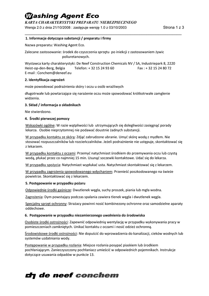 KARTA CHARAKTERYSTYKI PREPARATU NIEBEZPIECZNEGO Wersja 2.0 z dnia 21/10/2008 : zastępuje wersję 1.0 z 03/10/2003 Strona 1 z 3 ___________________________________________________________________ 1. Informacje dotyczące substancji / preparatu i firmy Nazwa preparatu: Washing Agent Eco. Zalecane zastosowanie: środek do czyszczenia sprzętu po iniekcji z zastosowaniem żywic poliuretanowych. Wystawca karty charakterystyki: De Neef Construction Chemicals NV / SA, Industriepark 8, 2220 Heist-op-den-Berg, Belgia Telefon: + 32 15 24 93 60 Fax : + 32 15 24 80 72 E-mail : [email protected] 2. Identyfikacja zagrożeo może powodowad podrażnienia skóry i oczu u osób wrażliwych długotrwałe lub powtarzające się narażenie oczu może spowodowad krótkotrwałe zamglenie widzenia. 3. Skład / informacja o składnikach Nie stwierdzono. 4. Środki pierwszej pomocy Wskazówki ogólne: W razie wątpliwości lub utrzymujących się dolegliwości zasięgnąd porady lekarza. Osobie nieprzytomnej nie podawad doustnie żadnych substancji. W przypadku kontaktu ze skórą: Zdjąd zabrudzone ubranie. Umyd skórę wodą z mydłem. Nie stosowad rozpuszczalników lub rozcieoczalników. Jeżeli podrażnienie nie ustępuje, skontaktowad się z lekarzem. W przypadku kontaktu z oczami: Przemyd natychmiast środkiem do przemywania oczu lub czystą wodą, płukad przez co najmniej 15 min. Usunąd soczewki kontaktowe. Udad się do lekarza. W przypadku spożycia: Natychmiast wypłukad usta. Natychmiast skontaktowad się z lekarzem. W przypadku zagrożenia spowodowanego wdychaniem: Przenieśd poszkodowanego na świeże powietrze. Skontaktowad się z lekarzem. 5. Postępowanie w przypadku pożaru Odpowiednie środki gaśnicze: Dwutlenek węgla, suchy proszek, piania lub mgła wodna. Zagrożenia: Dym powstający podczas spalania zawiera tlenek węgla i dwutlenek węgla. Specjalny sprzęt ochronny: Strażacy powinni nosid kombinezony ochronne oraz samodzielne aparaty oddechowe. 6. Postępowanie w przypadku niezamierzonego uwolnienia do środowiska Osobiste środki ostrożności: Zapewnid odpowiednią wentylację w przypadku wykonywania pracy w pomieszczeniach zamkniętych. Unikad kontaktu z oczami i nosid odzież ochronną. Środowiskowe środki ostrożności: Nie dopuścid do wprowadzenia do kanalizacji, cieków wodnych lub systemów uzdatniania wody. Postępowanie w przypadku rozlania: Miejsce rozlania posypad piaskiem lub środkiem pochłaniającym. Zanieczyszczony pochłaniacz umieścid w odpowiednich pojemnikach. Instrukcje dotyczące usuwania odpadów w punkcie 13. KARTA CHARAKTERYSTYKI PREPARATU NIEBEZPIECZNEGO Wersja 2.0 z dnia 21/10/2008 : zastępuje wersję 1.0 z 03/10/2003 Strona 2 z 3 ___________________________________________________________________ 7. Postępowanie z substancją/preparatem i magazynowanie Postępowanie z substancją/preparatem: Nie należy pid, jeśd lub palid w trakcie pracy z produktem. Używad wyłącznie w miejscach z odpowiednią wentylacją. Nie wdychad gazu/dymu/pary/rozpylonej cieczy. Magazynowanie: Produkt musi byd przechowywany w suchym miejscu, w szczelnie zamkniętych opakowaniach. Przechowywad w temperaturze 5 - 50 °C. 8. Kontrola narażenia i środki ochrony indywidualnej: Ochrona dróg oddechowych: Normalne warunki wentylacyjne są zwykle wystarczające. Należy używad maski ochronnej lub korzystad z lokalnych wyciągów wentylacyjnych podczas mieszania w zamkniętych przestrzeniach o niedostatecznej wentylacji. Ochrona rąk: Używad rękawic ochronnych. Odpowiednie są rękawice z PCW lub neoprenu. W razie wątpliwości zasięgnąd porady renomowanego producenta. . Mocno zabrudzona odzież ochronna powinna zostad usunięta, skóra przemyta wodą z mydłem lub odpowiednim środkiem czyszczącym. Ochrona oczu: Należy nosid ochronę oczu w celu zapewnienia osłony przed rozbryzgującymi się cieczami np. zabudowa pełna oka. Ochrona skóry: Bawełniane lub bawełniano-syntetyczne kombinezony są odpowiednie przy zwykłym użyciu. 9. Właściwości fizyczne i chemiczne wygląd: zielona ciecz zapach: słodki pH: brak danych temperatura wrzenia: 195 - 225°C temperatura topnienia: - 20°C temperatura zapłonu: 100°C samozapłon: 370°C prężnośd pary nasyconej: 0.02 mmHg w temp. 20°C gęstośd względna: 1,09 kg/l rozpuszczalnośd w wodzie: 53 g/l 10. Stabilnośd i reaktywnośd Stabilnośd: Stabilny w normalnych warunkach stosowania, magazynowania i transportu. Rozkłada się po podgrzaniu. Warunki, których należy unikad: Trzymad z dala od źródeł zapłonu. Materiały, których należy unikad: Utleniacze, kwasy, zasady. Niebezpieczne produkty rozkładu: Brak w normalnych warunkach stosowania, magazynowania i transportu. 11. Informacje toksykologiczne Toksycznośd ostra: LD 50 doustnie, szczur : 8181 mg/kg LD 50 skórnie, królik : > 2250 mg/kg Toksycznośd chroniczna: Nie wykazuje skutków mutagennych lub teratogennych. KARTA CHARAKTERYSTYKI PREPARATU NIEBEZPIECZNEGO Wersja 2.0 z dnia 21/10/2008 : zastępuje wersję 1.0 z 03/10/2003 Strona 3 z 3 ___________________________________________________________________ Skutki i objawy narażenia: Drogi oddechowe: Może powodowad podrażnienia. Skóra: Produkt może powodowad podrażnienia na skórze wrażliwej. Oczy: Może powodowad podrażnienia. Długotrwałe lub powtarzające się narażenie oczu może spowodowad krótkotrwałe zamglenie widzenia. Spożycie: Może powodowad dolegliwości żołądkowe i wymaga natychmiastowego rozcieoczenia dużą ilością wody. Jeśli produkt dostanie się do jamy ustnej, ale nie zostanie połknięty, wypłukad wodą. 12. Informacje ekologiczne Produkt jest słabo rozpuszczalny w wodzie (patrz również punkt 9.). Produkt podlega znacznej biodegradacji, powyżej 90 % (97 % po 18 dniach zgodnie z ISO 7827). Produkt nie został sklasyfikowany jako niebezpieczny dla środowiska. Produkt nie wykazuje potencjału do bioakumulacji. 13. Postępowanie z odpadami Produkt może zostad poddany rec