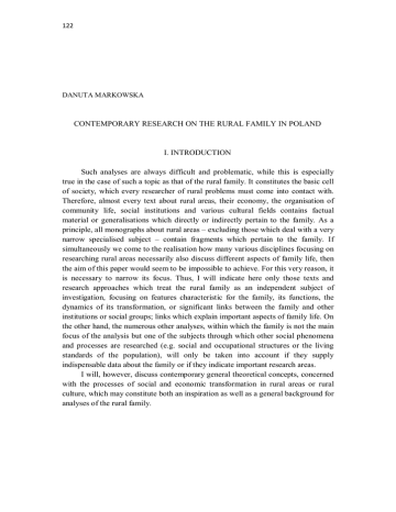 122 DANUTA MARKOWSKA CONTEMPORARY RESEARCH ON THE RURAL FAMILY IN POLAND I. INTRODUCTION Such analyses are always difficult and problematic, while this is especially true in the case of such a topic as that of the rural family. It constitutes the basic cell of society, which every researcher of rural problems must come into contact with. Therefore, almost every text about rural areas, their economy, the organisation of community life, social institutions and various cultural fields contains factual material or generalisations which directly or indirectly pertain to the family. As a principle, all monographs about rural areas – excluding those which deal with a very narrow specialised subject – contain fragments which pertain to the family. If simultaneously we come to the realisation how many various disciplines focusing on researching rural areas necessarily also discuss different aspects of family life, then the aim of this paper would seem to be impossible to achieve. For this very reason, it is necessary to narrow its focus. Thus, I will indicate here only those texts and research approaches which treat the rural family as an independent subject of investigation, focusing on features characteristic for the family, its functions, the dynamics of its transformation, or significant links between the family and other institutions or social groups; links which explain important aspects of family life. On the other hand, the numerous other analyses, within which the family is not the main focus of the analysis but one of the subjects through which other social phenomena and processes are researched (e.g. social and occupational structures or the living standards of the population), will only be taken into account if they supply indispensable data about the family or if they indicate important research areas. I will, however, discuss contemporary general theoretical concepts, concerned with the processes of social and economic transformation in rural areas or rural culture, which may constitute both an inspiration as well as a general background for analyses of the rural family. 123 II. AVAILABLE MATERIAL A researcher beginning studies of the contemporary rural family in Poland after World War II was faced with the difficult situation of both an abundance of material and…a lack of it. On the one hand, he had access to a vast amount of literature on the subject within world academic material, both ethnological which dealt primarily with primitive societies, as well as sociological, focused especially on the family within urban and industrial clusters, or generally analysing the transformation of the family in the conditions of industrial civilisation. On the other hand, he/she was faced with a sea of facts concerning the rural family and collected from the position of the research needs of various disciplines, incorporated into diverse interpretational trends, scattered across different publications. A theoretical trend which would explain specific features of rural families, the fundamental determinants of these features or development trends had not been developed to a comparable degree. Thus, there was a lack of an intermediary link between the general theoretical concepts or patterns of research and the sea of facts or fragmentary generalisations. How could the researcher make use of general ethnology? What strictly general statements could be utilised? What methodological guidelines? Inquiries into the family within ethnological studies began along with the very beginnings of the discipline itself. This is most probably a result of the fact that within the social structure of primitive families, the family and kinship system constituted the basis for the broader social organisation, including tribal and state organisms. In such conditions, the organisation of the family explained a lot of seemingly distant areas of collective life and culture. Therefore, the family constituted the point of departure for many analyses. 19th-century interest in the family within ethnological studies revolved around the genesis of the family and the stages of its development. The structure of the family and its internal organisation were at the centre of researchers’ focus. Today, such subject matter has yielded to investigations which are limited to a strictly specified empirical base, studies of a much more modest aim but more profoundly documented. The breakthrough in this aspect undoubtedly came with the works of Bronisław Malinowski and the monographs of his school of thought. Among Malinowski’s works, the ones which should primarily be mentioned are those dealing with complete monographic fieldwork on marriage, the family and kinship among the inhabitants of the Trobriand Islands, namely The Sexual Life of Savages in North-Western Melanesia1. On the example of a study of the family, the author presents the principles of the functionalist school of thought, limited to current circumstances and primarily researching the functions of the family, as well as 1 London 1929. 124 analysing the structural forms in connection to the tasks fulfilled by this institution. A continuation of research of a functionalist type about the family and kinship can be found in many fieldwork monographs by Malinowski’s students. From among other publications, those defined as being structuralist, RadcliffeBrown devoted many of his texts to family and kinship structures. The introduction to the collective work African Systems of Kinship and Marriage2 or On Social Structure3 and The Study of Kinship Systems4can be considered as being representative of this theoretical approach. An academic movement is concentrated around Prof. Radcliffe-Brown in Great Britain, which is developing the structuralist point of view on family and kinship. The main representatives of this approach are E. E. Evans-Pritchard and M. Fortes. In France, structuralist concepts concerning the researching of family and kinship are being develop