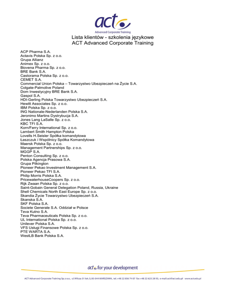 Lista klientów - szkolenia językowe ACT Advanced Corporate Training ACP Pharma S.A. Actavis Polska Sp. z o.o. Grupa Allianz Animex Sp. z o.o. Biovena Pharma Sp. z o.o. BRE Bank S.A. Castorama Polska Sp. z o.o. CEMET S.A. Commercial Union Polska – Towarzystwo Ubezpieczeń na śycie S.A. Colgate-Palmolive Poland Dom Inwestycyjny BRE Bank S.A. Gaspol S.A. HDI-Gerling Polska Towarzystwo Ubezpieczeń S.A. Hewitt Associates Sp. z o.o. IBM Polska Sp. z o.o. ING Nationale-Nederlanden Polska S.A. Jeronimo Martins Dystrybucja S.A. Jones Lang LaSalle Sp. z o.o. KBC TFI S.A. Korn/Ferry International Sp. z o.o. Lambert Smith Hampton Polska Lovells H.Seisler Spółka komandytowa Łaszczuk i Wspólnicy Spółka Komandytowa Maersk Polska Sp. z o.o. Management Partnerships Sp. z o.o. MGGP S.A. Penton Consulting Sp. z o.o. Polska Agencja Prasowa S.A. Grupa Pilkington Pioneer Pekao Investment Management S.A. Pioneer Pekao TFI S.A. Philip Morris Polska S.A. PricewaterhouseCoopers Sp. z o.o. Rijk Zwaan Polska Sp. z o.o. Saint-Gobain General Delegation Poland, Russia, Ukraine Shell Chemicals North East Europe Sp. z o.o. Skandia śycie Towarzystwo Ubezpieczeń S.A. Skanska S.A. SKF Polska S.A. Societe Generale S.A. Oddział w Polsce Teva Kutno S.A. Teva Pharmaceuticals Polska Sp. z o.o. UL International Polska Sp. z o.o. Unilever Polska S.A. VFS Usługi Finansowe Polska Sp. z o.o. PTE WARTA S.A. WestLB Bank Polska S.A.