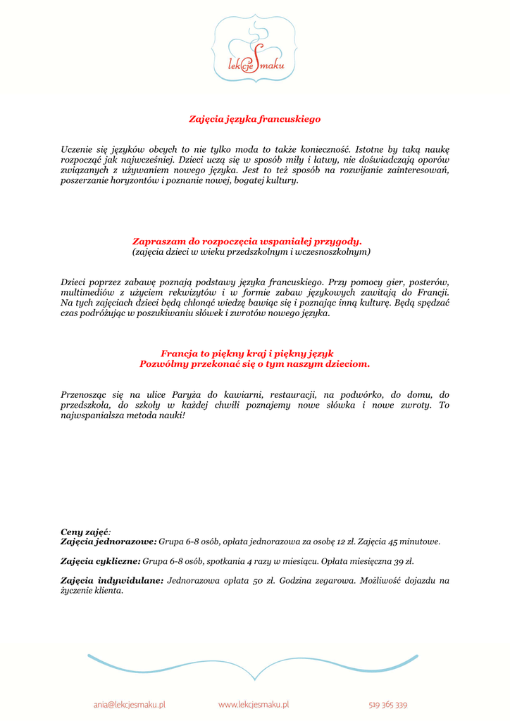 Zajęcia języka francuskiego Uczenie się języków obcych to nie tylko moda to także konieczność. Istotne by taką naukę rozpocząć jak najwcześniej. Dzieci uczą się w sposób miły i łatwy, nie doświadczają oporów związanych z używaniem nowego języka. Jest to też sposób na rozwijanie zainteresowań, poszerzanie horyzontów i poznanie nowej, bogatej kultury. Zapraszam do rozpoczęcia wspaniałej przygody. (zajęcia dzieci w wieku przedszkolnym i wczesnoszkolnym) Dzieci poprzez zabawę poznają podstawy języka francuskiego. Przy pomocy gier, posterów, multimediów z użyciem rekwizytów i w formie zabaw językowych zawitają do Francji. Na tych zajęciach dzieci będą chłonąć wiedzę bawiąc się i poznając inną kulturę. Będą spędzać czas podróżując w poszukiwaniu słówek i zwrotów nowego języka. Francja to piękny kraj i piękny język Pozwólmy przekonać się o tym naszym dzieciom. Przenosząc się na ulice Paryża do kawiarni, restauracji, na podwórko, do domu, do przedszkola, do szkoły w każdej chwili poznajemy nowe słówka i nowe zwroty. To najwspanialsza metoda nauki! Ceny zajęć: Zajęcia jednorazowe: Grupa 6-8 osób, opłata jednorazowa za osobę 12 zł. Zajęcia 45 minutowe. Zajęcia cykliczne: Grupa 6-8 osób, spotkania 4 razy w miesiącu. Opłata miesięczna 39 zł. Zajęcia indywidulane: Jednorazowa opłata 50 zł. Godzina zegarowa. Możliwość dojazdu na życzenie klienta.