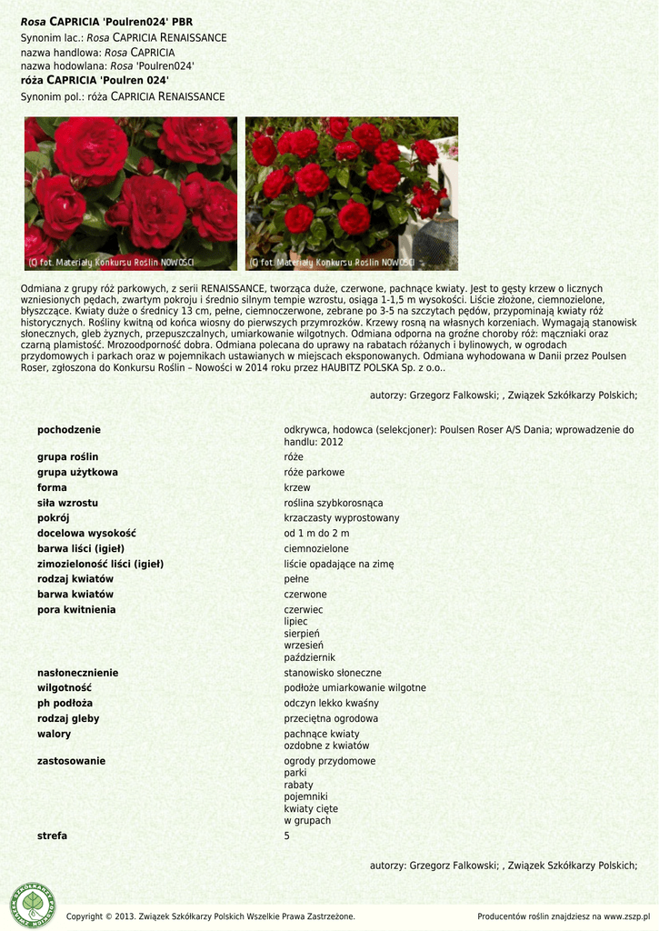 Rosa CAPRICIA 'Poulren024' PBR Synonim lac.: Rosa CAPRICIA RENAISSANCE nazwa handlowa: Rosa CAPRICIA nazwa hodowlana: Rosa 'Poulren024' róża CAPRICIA 'Poulren 024' Synonim pol.: róża CAPRICIA RENAISSANCE Odmiana z grupy róż parkowych, z serii RENAISSANCE, tworząca duże, czerwone, pachnące kwiaty. Jest to gęsty krzew o licznych wzniesionych pędach, zwartym pokroju i średnio silnym tempie wzrostu, osiąga 1-1,5 m wysokości. Liście złożone, ciemnozielone, błyszczące. Kwiaty duże o średnicy 13 cm, pełne, ciemnoczerwone, zebrane po 3-5 na szczytach pędów, przypominają kwiaty róż historycznych. Rośliny kwitną od końca wiosny do pierwszych przymrozków. Krzewy rosną na własnych korzeniach. Wymagają stanowisk słonecznych, gleb żyznych, przepuszczalnych, umiarkowanie wilgotnych. Odmiana odporna na groźne choroby róż: mączniaki oraz czarną plamistość. Mrozoodporność dobra. Odmiana polecana do uprawy na rabatach różanych i bylinowych, w ogrodach przydomowych i parkach oraz w pojemnikach ustawianych w miejscach eksponowanych. Odmiana wyhodowana w Danii przez Poulsen Roser, zgłoszona do Konkursu Roślin – Nowości w 2014 roku przez HAUBITZ POLSKA Sp. z o.o.. autorzy: Grzegorz Falkowski; , Związek Szkółkarzy Polskich; pochodzenie odkrywca, hodowca (selekcjoner): Poulsen Roser A/S Dania; wprowadzenie do handlu: 2012 grupa roślin róże grupa użytkowa róże parkowe forma krzew siła wzrostu roślina szybkorosnąca pokrój krzaczasty wyprostowany docelowa wysokość od 1 m do 2 m barwa liści (igieł) ciemnozielone zimozieloność liści (igieł) liście opadające na zimę rodzaj kwiatów pełne barwa kwiatów czerwone pora kwitnienia czerwiec lipiec sierpień wrzesień październik nasłonecznienie stanowisko słoneczne wilgotność podłoże umiarkowanie wilgotne ph podłoża odczyn lekko kwaśny rodzaj gleby przeciętna ogrodowa walory pachnące kwiaty ozdobne z kwiatów zastosowanie ogrody przydomowe parki rabaty pojemniki kwiaty cięte w grupach strefa 5 autorzy: Grzegorz Falkowski; , Związek Szkółkarzy Polskich; Copyright © 2013. Związek Szkółkarzy Polskich Wszelkie Prawa Zastrzeżone. Producentów roślin znajdziesz na www.zszp.pl