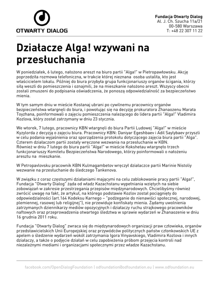 Fundacja Otwarty Dialog Al. J. Ch. Szucha 11a/21 00-580 Warszawa T: +48 22 307 11 22 Działacze Alga! wzywani na przesłuchania W poniedziałek, 6 lutego, nałożono areszt na biuro partii "Alga!" w Pietropawłowsku. Akcję poprzedziła rozmowa telefoniczna, w trakcie której nieznana osoba ustaliła, kto jest właścicielem lokalu. Później do biura przybyła grupa funkcjonariuszy organów ścigania, którzy siłą weszli do pomieszczenia i oznajmili, że na mieszkanie nałożono areszt. Wszyscy obecni zostali zmuszeni do podpisania oświadczenia, że ponoszą odpowiedzialność za bezpieczeństwo mienia. W tym samym dniu w mieście Kostanaj ubrani po cywilnemu pracownicy organów bezpieczeństwa wtargnęli do biura, i powołując się na decyzję prokuratora Zhanaozenu Marata Toyzhana, poinformowali o zajęciu pomieszczenia należącego do lidera partii "Alga!" Vladimira Kozlova, który został zatrzymany w dniu 23 stycznia. We wtorek, 7 lutego, pracownicy KBN wtargnęli do biura Partii Ludowej "Alga!" w mieście Kyzylorda z decyzją o zajęciu biura. Pracownicy KBN: Daniyar Egeshbaev i Adil Saylybaev przyszli w celu podania wyjaśnienia oraz sporządzenia protokołu dotyczącego zajęcia biura partii "Alga". Czterem działaczom partii zostały wręczone wezwania na przesłuchanie w KBN. Również w dniu 7 lutego do biura partii "Alga!" w mieście Kokshetau wtargnęło trzech funkcjonariuszy Komitetu Bezpieczeństwa Narodowego, którzy poinformowali o nałożeniu aresztu na mieszkanie. W Petropavlovsku pracownik KBN Kulmagambetov wręczył działaczce partii Marinie Nistoliy wezwanie na przesłuchanie do śledczego Tankenova. W związku z coraz częstszymi działaniami mającymi na celu zablokowanie pracy partii "Alga!", Fundacja "Otwarty Dialog" żąda od władz Kazachstanu wypełniania wziętych na siebie zobowiązań w zakresie przestrzegania przepisów międzynarodowych. Chcielibyśmy również zwrócić uwagę na fakt, że artykuł, na którego podstawie Kozlov został pociągnięty do odpowiedzialności (art.164 Kodeksu Karnego – "podżeganie do nienawiści społecznej, narodowej, plemiennej, rasowej lub religijnej"), nie przewiduje konfiskaty mienia. Żądamy uwolnienia zatrzymanych dziennikarzy mediów opozycyjnych i działaczy ruchu strajkowego pracowników naftowych oraz przeprowadzenia otwartego śledztwa w sprawie wydarzeń w Zhanaozenie w dniu 16 grudnia 2011 roku. Fundacja "Otwarty Dialog" zwraca się do międzynarodowych organizacji praw człowieka, organów przedstawicielskich Unii Europejskiej oraz przywódców politycznych państw członkowskich UE z apelem o śledzenie wydarzeń wokół zatrzymania Igora Vinyavskiego, Vladimira Kozlova i innych działaczy, a także o podjęcie działań w celu zapobieżenia próbom przejęcia kontroli nad niezależnymi mediami i organizacjami społecznymi przez władze Kazachstanu. facebook.com/OpenDialogFoundation | [email protected] | www.odfoundation.eu