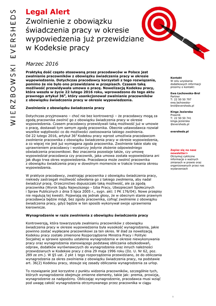 Legal Alert Zwolnienie z obowiązku świadczenia pracy w okresie wypowiedzenia już przewidziane w Kodeksie pracy Marzec 2016 Praktyką dość często stosowaną przez pracodawców w Polsce jest zwalnianie pracowników z obowiązku świadczenia pracy w okresie wypowiedzenia. Dotychczas pracodawcy korzystali z tego rozwiązania, pomimo że nie było ono przewidziane w przepisach. Czasem taką możliwość przewidywała umowa o pracę. Nowelizacją Kodeksu pracy, która weszła w życie 22 lutego 2016 roku, wprowadzono do tego aktu prawnego artykuł 362, który usankcjonował zwalnianie pracowników z obowiązku świadczenia pracy w okresie wypowiedzenia. Zwolnienie z obowiązku świadczenia pracy Dotychczas przyjmowano – choć nie bez kontrowersji – że pracodawcy mogą za zgodą pracownika zwolnić go z obowiązku świadczenia pracy w okresie wypowiedzenia. Czasem pracodawcy przewidywali taką możliwość już w umowie o pracę, dostawali tym samym zgodę pracownika. Obecnie ustawodawca rozwiał wszelkie wątpliwości co do możliwości zastosowania takiego zwolnienia. Od 22 lutego 2016, artykuł 362 Kodeksu pracy wprost umożliwia pracodawcom zwolnienie pracownika z obowiązku świadczenia pracy w okresie wypowiedzenia, a co więcej nie jest już wymagana zgoda pracownika. Zwolnienie takie stało się uprawnieniem pracodawcy i wystarczy jedynie złożenie odpowiedniego oświadczenia pracownikowi. Bez znaczenia pozostaje także, czy umowę wypowiedział pracodawca czy pracownik, jaka umowa została wypowiedziana ani jak długo trwa okres wypowiedzenia. Pracodawca może zwolnić pracownika z obowiązku świadczenia pracy w dowolnym momencie w trakcie trwania okresu wypowiedzenia. Kontakt W celu uzyskania dodatkowych informacji prosimy o kontakt: Ewa Łachowska-Brol Partner T: 22 50 50 797 [email protected] Kinga Jezierska Prawnik T: 22 50 50 741 kinga.jezierska @eversheds.pl eversheds.pl Zapisz się na nasz newsletter> Otrzymuj cykliczne informacje o ważnych zmianach w prawie oraz organizowanych przez nas wydarzeniach W praktyce pracodawcy, zwalniając pracownika z obowiązku świadczenia pracy, niekiedy zastrzegali możliwość odwołania go z takiego zwolnienia, aby nadal świadczył pracę. Orzecznictwo dopuszczało taką możliwość, ale za zgodą pracownika (Wyrok Sądu Najwyższego - Izba Pracy, Ubezpieczeń Społecznych i Spraw Publicznych z dnia 5 lipca 2005 r., sygn. akt: I PK 176/04). Nowe przepisy nie regulują tej kwestii. Pojawiają się jednak głosy, że w obecnym stanie prawnym pracodawca będzie mógł, bez zgody pracownika, cofnąć zwolnienie z obowiązku świadczenia pracy, gdyż będzie w ten sposób wykonywał swoje uprawnienia kierownicze. Wynagrodzenie w razie zwolnienia z obowiązku świadczenia pracy Kontrowersją, która towarzyszyła zwalnianiu pracowników z obowiązku świadczenia pracy w okresie wypowiedzenia była wysokość wynagrodzenia, jakie powinno zostać wypłacane pracownikowi za ten okres. W ślad za nowelizacją Kodeksu pracy zostało zmienione Rozporządzenie Ministra Pracy i Polityki Socjalnej w sprawie sposobu ustalenia wynagrodzenia w okresie niewykonywania pracy oraz wynagrodzenia stanowiącego podstawę obliczania odszkodowań, odpraw, dodatków wyrównawczych do wynagrodzenia oraz innych należności przewidzianych w Kodeksie pracy z dnia 29 maja 1996 roku (Dz. U. Nr 62, poz. 289 ze zm.). W §5 ust. 2 pkt 1 tego rozporządzenia przewidziano, że do obliczania wynagrodzenia za okres zwolnienia z obowiązku świadczenia pracy, na podstawie art. 36(2) Kodeksu pracy, stosuje się zasady obliczania wynagrodzenia za urlop. To rozwiązanie jest korzystne z punktu widzenia pracowników, szczególnie tych, których wynagrodzenie obejmuje zmienne elementy, takie jak: premia, prowizja, wynagrodzenie za nadgodziny. Obliczając wynagrodzenie, pracodawca musi wziąć pod uwagę całość wynagrodzenia otrzymywanego przez pracownika w ciągu 1 ostatnich 3 miesięcy, a gdy występują znaczne wahania wysokości zmiennych składników wynagrodzenia – nawet z ostatnich 12 miesięcy. Oznacza to w praktyce, że za czas zwolnienia z obowiązku świadczenia pracy pracownicy mogą otrzymać wynagrodzenie wyższe niż podstawowe, określone w stawce miesięcznej. Informacje zawarte w tym dokumencie nie stanowią porady prawnej. Osoby zainteresowane uzyskaniem porady prawnej lub bardziej szczegółowych informacji prosimy o bezpośredni kontakt ze wskazanym wyżej prawnikiem. Wierzbowski Eversheds jest członkiem Eversheds International Limited. Pełna lista biur Eversheds International Limited i dane kontaktowe na eversheds.com © Wierzbowski Eversheds 2016. 2