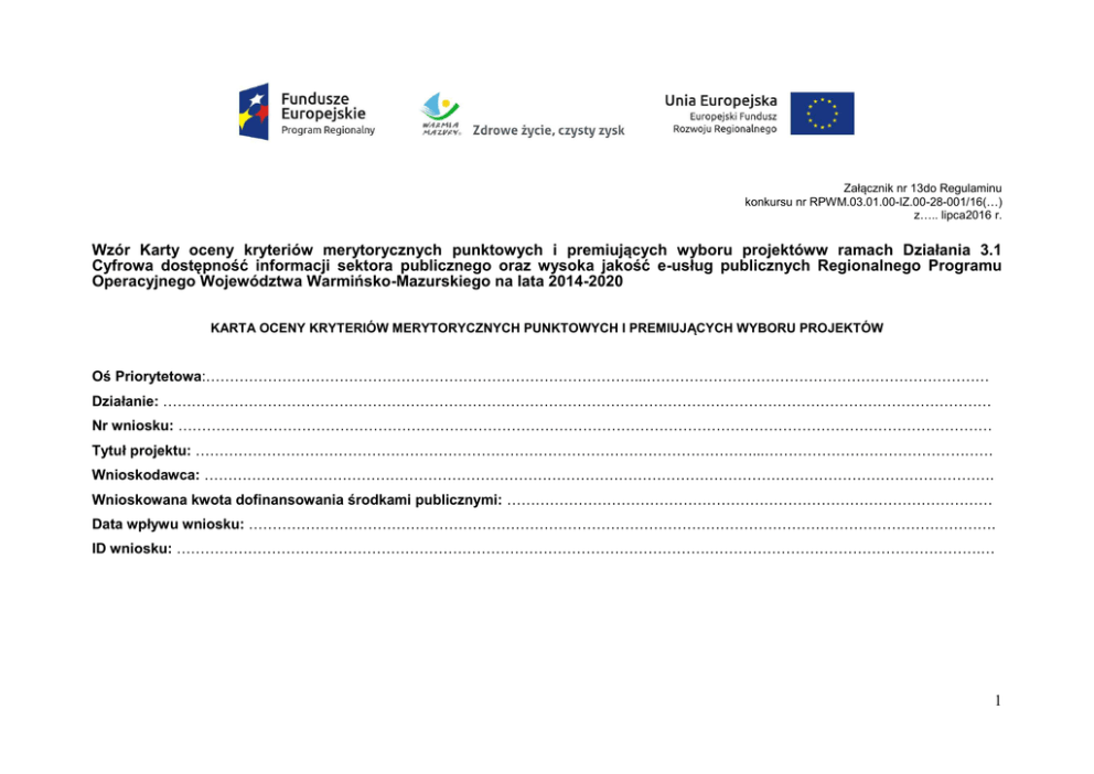 Załącznik nr 13do Regulaminu konkursu nr RPWM.03.01.00-IZ.00-28-001/16(…) z….. lipca2016 r. Wzór Karty oceny kryteriów merytorycznych punktowych i premiujących wyboru projektóww ramach Działania 3.1 Cyfrowa dostępność informacji sektora publicznego oraz wysoka jakość e-usług publicznych Regionalnego Programu Operacyjnego Województwa Warmińsko-Mazurskiego na lata 2014-2020 KARTA OCENY KRYTERIÓW MERYTORYCZNYCH PUNKTOWYCH I PREMIUJĄCYCH WYBORU PROJEKTÓW Oś Priorytetowa:………………………………………………………………………………...……………………………………………………………… Działanie: ………………………………………………………………………………………………………………………………………………………… Nr wniosku: ……………………………………………………………………………………………………………………………………………………… Tytuł projektu: ………………………………………………………………………………………………………...………………………………………… Wnioskodawca: …………………………………………………………………………………………………………………………………………………. Wnioskowana kwota dofinansowania środkami publicznymi: ………………………………………………………………………………………… Data wpływu wniosku: …………………………………………………………………………………………………………………………………………. ID wniosku: …………………………………………………………………………………………………………………………………………………….… 1 Lp. KRYTERIUM SKALA PUNKTOWA PRZYZNANA PUNKTACJA UZASADNIENIE EKSPERTA KRYTERIA MERYTORYCZNE PUNKTOWE Projekt może otrzymać od 0 do 3 pkt (maksymalnie) w ramach projektu powstanie usługa 1. Dostępność rezultatów projektu wewnątrzadministracyjna – A2A – 1 pkt w ramach projektu powstaną usługi w relacjach z obywatelami – A2C i/lub przedsiębiorcami A2B – 2 pkt cyfrowa dostępność zasobów objętych projektem realnie zwiększy się dzięki wykorzystaniu (wyłącznie lub dodatkowo) innych niż własna strona internetowa wnioskodawcy platform, repozytoriów, stron internetowych itp. – 3 pkt Projekt może otrzymać od 0 do 3 pkt(maksymalnie) 2. 3. Udostępnianie usług o wysokim poziomie edojrzałości 1 pkt – za 2-5 usługi; Wpływ na rozwiązanie wszystkich zdiagnozowanych problemów kluczowych interesariuszy. Projekt może otrzymać od 0 do 1 pkt(maksymalnie) 2 pkt – 6-10 usług; 3 pkt – za powyżej 10 usług. 0 pkt – projekt przyczynia się do rozwiązania wybranych problemów 2 kluczowych interesariuszy w obszarze objętym projektem 1 pkt – projekt przyczynia się do rozwiązania wszystkich zdiagnozowanych problemów kluczowych interesariuszy w obszarze objętym projektem Projekt może otrzymać od 0 do 1 pkt(maksymalnie) 4. Realizacja kilku komplementarnych celów. 0 pkt – projekt realizuje jeden cel 1 pkt – projekt realizuje kilka uzupełniających się celów wymagających odrębnych działań. Projekt może otrzymać od 0 do 3 pkt (maksymalnie) 5. e-usługi: korzystanie przez usługobiorcę z elektronicznych usług publicznych będzie możliwe różnymi kanałami Poziom zastosowania dostępu, niezależnie od miejsca metod projektowania przebywania i wykorzystywanej zorientowanego na technologii, a projektowane użytkownika w projekcie rozwiązania są zgodne z potrzebami interesariuszy usług – 1 pkt; poziom dostępności usług1 proponowany w ramach projektu jest zgodny z wynikami badań potrzeb usługobiorców a 1 Poziom dostępności: czas bezawaryjnego działania usługi (np. systemu teleinformatycznego, usługi sieciowej, itp.) w stosunku do całości czasu, w którym usługa powinna być świadczona usługobiorcom – wartość mierzona w skali roku. 3 prognozowane obciążenie systemu informatycznego (normalne i szczytowe) nie spowoduje utrudnień w dostępności – 1 pkt; zaplanowano działania polegające na monitorowaniu usług pod kątem dostępności i użyteczności graficznych interfejsów dla wszystkich interesariuszy, ciągłości działania i powszechności wykorzystania – 1 pkt. ISP: korzystanie z cyfrowo udostępnianych ISP objętych projektem będzie możliwe niezależnie od miejsca przebywania i wykorzystywanej technologii – 1 pkt; poziom dostępności ISP2 proponowany w ramach projektu jest zgodny z wynikami badań potrzeb grup docelowych – 1 pkt; zaplanowano działania polegające na monitorowaniu cyfrowego udostępniania ISP pod kątem dostępności i użyteczności graficznych interfejsów dla wszystkich grup docelowych, ciągłości działania i powszechności 2 Poziom dostępności: czas bezawaryjnego działania usługi (np. systemu teleinformatycznego, usługi sieciowej, itp.) w stosunku do całości czasu, w którym usługa powinna być świadczona usługobiorcom – wartość mierzona w skali roku. 4 wykorzystania oraz satysfakcji użytkowników – 1 pkt. Projekt może otrzymać od 0 do 6 pkt (maksymalnie) ISP udostępniane cyfrowo lub 6. Użyteczność efektów realizowanego projektu będące bazą dla usług oferowanych w ramach projektu wpisują się w przynajmniej 1z 5 kluczowych obszarów ISP, których udostępnienie do ponownego wykorzystania powinno być według Komisji Europejskiej priorytetem w całej Europie. Obszary te zostały wymienione w wytycznych CommissionNoticeGuidelines on recommended standard licenses, datasets and charging for reuse of documents(2014/C 240/01) i są to: 1) dane geoprzestrzenne; 2) dane środowiskowe; 3) dane transportowe; 4) statystyka publiczna w zakresie wskaźników demograficznych i