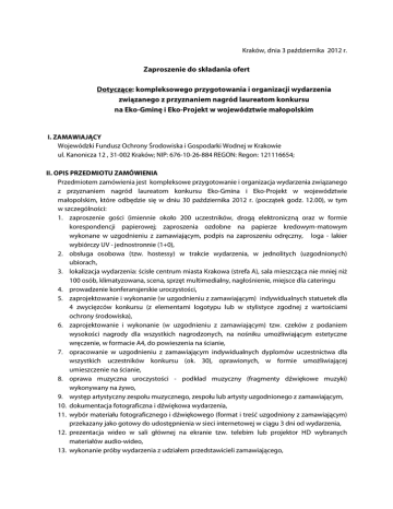 Kraków, dnia 3 października 2012 r. Zaproszenie do składania ofert Dotyczące: kompleksowego przygotowania i organizacji wydarzenia związanego z przyznaniem nagród laureatom konkursu na Eko-Gminę i Eko-Projekt w województwie małopolskim I. ZAMAWIAJĄCY Wojewódzki Fundusz Ochrony Środowiska i Gospodarki Wodnej w Krakowie ul. Kanonicza 12 , 31-002 Kraków; NIP: 676-10-26-884 REGON: Regon: 121116654; II. OPIS PRZEDMIOTU ZAMÓWIENIA Przedmiotem zamówienia jest kompleksowe przygotowanie i organizacja wydarzenia związanego z przyznaniem nagród laureatom konkursu Eko-Gmina i Eko-Projekt w województwie małopolskim, które odbędzie się w dniu 30 października 2012 r. (początek godz. 12.00), w tym w szczególności: 1. zaproszenie gości (imiennie około 200 uczestników, drogą elektroniczną oraz w formie korespondencji papierowej; zaproszenia ozdobne na papierze kredowym-matowym wykonane w uzgodnieniu z zamawiającym, podpis na zaproszeniu odręczny, loga - lakier wybiórczy UV - jednostronnie (1+0), 2. obsługa osobowa (tzw. hostessy) w trakcie wydarzenia, w jednolitych (uzgodnionych) ubiorach, 3. lokalizacja wydarzenia: ścisłe centrum miasta Krakowa (strefa A), sala mieszcząca nie mniej niż 100 osób, klimatyzowana, scena, sprzęt multimedialny, nagłośnienie, miejsce dla cateringu 4. prowadzenie konferansjerskie uroczystości, 5. zaprojektowanie i wykonanie (w uzgodnieniu z zamawiającym) indywidualnych statuetek dla 4 zwycięzców konkursu (z elementami logotypu lub w stylistyce zgodnej z wartościami ochrony środowiska), 6. zaprojektowanie i wykonanie (w uzgodnieniu z zamawiającym) tzw. czeków z podaniem wysokości nagrody dla wszystkich nagrodzonych, na nośniku umożliwiającym estetyczne wręczenie, w formacie A4, do powieszenia na ścianie, 7. opracowanie w uzgodnieniu z zamawiającym indywidualnych dyplomów uczestnictwa dla wszystkich uczestników konkursu (ok. 30), oprawionych, w formie umożliwiającej umieszczenie na ścianie, 8. oprawa muzyczna uroczystości - podkład muzyczny (fragmenty dźwiękowe muzyki) wykonywany na żywo, 9. występ artystyczny zespołu muzycznego, zespołu lub artysty uzgodnionego z zamawiającym, 10. dokumentacja fotograficzna i dźwiękowa wydarzenia, 11. wybór materiału fotograficznego i dźwiękowego (format i treść uzgodniony z zamawiającym) przekazany jako gotowy do udostępnienia w sieci internetowej w ciągu 3 dni od wydarzenia, 12. prezentacja wideo w sali głównej na ekranie tzw. telebim lub projektor HD wybranych materiałów audio-wideo, 13. wykonanie próby wydarzenia z udziałem przedstawicieli zamawiającego, 14. obsługa cateringowa i catering wydarzenia (ok. 100 osób), koszt cateringu na jednego uczestnika - 60 zł (bufet szwedzki z zimną płytą, gorącymi daniami, napojami - do uzgodnienia z zamawiającym), 15. przygotowanie i poprowadzenie konferencji prasowej (briefingu prasowego) na 15 minut przed rozpoczęciem wydarzenia - w uzgodnieniu z przedstawicielami mediów lokalnych, regionalnych i ogólnopolskich oraz monitoring udziału mediów, 16. przygotowanie materiałów prasowych, w tym ulotek w ilości około 200 szt. oraz krótkiej prezentacji o każdym z laureatów, 17. przygotowanie (zaprojektowanie i wykonanie w uzgodnieniu z zamawiającym) 2 banerów reklamowych (standardowy tzw. roll-up) oraz baneru o wymiarach około 1 metr x 2 metry z logotypem pełnym i hasłem informacyjnym funduszu “finansujemy ochronę środowiska w Małopolsce” (w kolorystyce właściwej dla logotypów w książce znaku, wyrazy: finansujemy, w Małopolsce - w kolorze niebieskim, ochronę środowiska - w kolorze zielonym), 18. przygotowanie gotowych stron internetowych zgodnie ze stylistyką strony głównej www.wfos.krakow.pl (nie mniej niż 5 gotowych materiałów: zaproszenie na wydarzenie, z podstawowymi danymi np. mapką, materiał z wynikami konkursu, materiały o zwycięzcach konkursu). Zamawiający nie dopuszcza możliwości składania ofert częściowych. Zamówienie poniżej 14 tys. euro. III. TERMIN WYKONANIA ZAMÓWIENIA - do dnia 30 października 2012 r. Planowany czas trwania wydarzenia około 120 min IV. OPIS SPOSOBU PRZYGOTOWANIA OFERTY Elementy formalne oferty (oferta musi): 1. zawierać cenę całkowitą realizacji zamówienia – netto i brutto w złotych; 2. wskazywać termin związania ofertą – nie krótszy niż do 30 października 2012 r.; 3. zawierać adres lub siedzibę oferenta, numer telefonu, numer NIP; 4. wskazywać dane osoby do kontaktu w sprawie oferty z podaniem numeru telefonu i adresu email; 5. podpisana czytelnie przez wykonawcę (osobę uprawnioną do reprezentowania); 6. oferta musi być sporządzona w języku polskim; 7. zawierać pisemne rekomendacje od co najmniej 15 zleceniodawców; 8. projekt umowy na realizację przedsięwzięcia; 9. oświadczenie oferenta do gotowości zawarcia oferty z klauzulą przekazania praw autorskich do wykonanego dzieła na wszystkich polach eksploatacji; 10. oferta winna zawierać także inne elementy, o których mowa w niniejszym zapytaniu ofertowym, w tym w szczególności projekty graficzne elementów o których mowa w zapytaniu. V. MIEJSCE ORAZ TERMIN SKŁADANIA OFERT 1. Oferta powinna być przesłana za pośrednictwem: poczty elektronicznej na adres: [email protected] lub dostarczona do siedziby zamawiającego w terminie do dnia 8 października 2012 r. do godz. 15.00. 2. Oferty złożone po terminie nie będą rozpatrywane. VI. OCENA OFERT Zamawiający dokona oceny ważnych ofert na podstawie kryterium zgodności formalnej z zapytaniem ofertowym. Kryterium merytoryczne oceny: cena =100% VII. DODATKOWE INFORMACJE Dodatkowych informacji udzielają: Beata Wójcik (telefon: 12 422 94 90) lub Paweł Soczek (telefon: 600 700 450) oraz pod adresem e-mail: beata.wojcik@@wfos.krakow.pl.