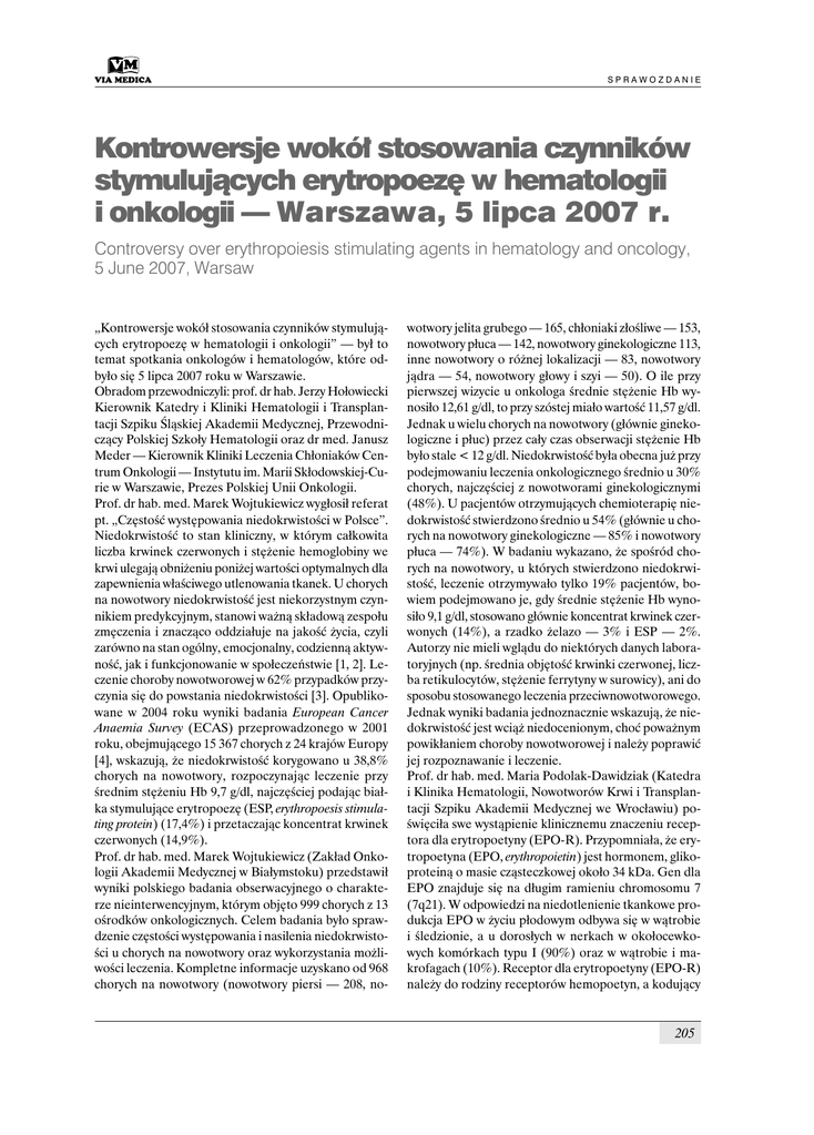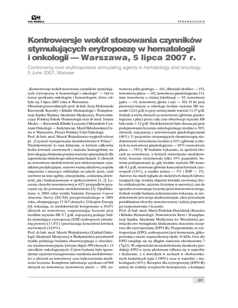 SPRAWOZDANIE Kontrowersje wokół stosowania czynników stymulujących erytropoezę w hematologii i onkologii — Warszawa, 5 lipca 2007 r. Controversy over erythropoiesis stimulating agents in hematology and oncology, 5 June 2007, Warsaw „Kontrowersje wokół stosowania czynników stymulujących erytropoezę w hematologii i onkologii” — był to temat spotkania onkologów i hematologów, które odbyło się 5 lipca 2007 roku w Warszawie. Obradom przewodniczyli: prof. dr hab. Jerzy Hołowiecki Kierownik Katedry i Kliniki Hematologii i Transplantacji Szpiku Śląskiej Akademii Medycznej, Przewodniczący Polskiej Szkoły Hematologii oraz dr med. Janusz Meder — Kierownik Kliniki Leczenia Chłoniaków Centrum Onkologii — Instytutu im. Marii Skłodowskiej-Curie w Warszawie, Prezes Polskiej Unii Onkologii. Prof. dr hab. med. Marek Wojtukiewicz wygłosił referat pt. „Częstość występowania niedokrwistości w Polsce”. Niedokrwistość to stan kliniczny, w którym całkowita liczba krwinek czerwonych i stężenie hemoglobiny we krwi ulegają obniżeniu poniżej wartości optymalnych dla zapewnienia właściwego utlenowania tkanek. U chorych na nowotwory niedokrwistość jest niekorzystnym czynnikiem predykcyjnym, stanowi ważną składową zespołu zmęczenia i znacząco oddziałuje na jakość życia, czyli zarówno na stan ogólny, emocjonalny, codzienną aktywność, jak i funkcjonowanie w społeczeństwie [1, 2]. Leczenie choroby nowotworowej w 62% przypadków przyczynia się do powstania niedokrwistości [3]. Opublikowane w 2004 roku wyniki badania European Cancer Anaemia Survey (ECAS) przeprowadzonego w 2001 roku, obejmującego 15 367 chorych z 24 krajów Europy [4], wskazują, że niedokrwistość korygowano u 38,8% chorych na nowotwory, rozpoczynając leczenie przy średnim stężeniu Hb 9,7 g/dl, najczęściej podając białka stymulujące erytropoezę (ESP, erythropoesis stimulating protein) (17,4%) i przetaczając koncentrat krwinek czerwonych (14,9%). Prof. dr hab. med. Marek Wojtukiewicz (Zakład Onkologii Akademii Medycznej w Białymstoku) przedstawił wyniki polskiego badania obserwacyjnego o charakterze nieinterwencyjnym, którym objęto 999 chorych z 13 ośrodków onkologicznych. Celem badania było sprawdzenie częstości występowania i nasilenia niedokrwistości u chorych na nowotwory oraz wykorzystania możliwości leczenia. Kompletne informacje uzyskano od 968 chorych na nowotwory (nowotwory piersi — 208, no- wotwory jelita grubego — 165, chłoniaki złośliwe — 153, nowotwory płuca — 142, nowotwory ginekologiczne 113, inne nowotwory o różnej lokalizacji — 83, nowotwory jądra — 54, nowotwory głowy i szyi — 50). O ile przy pierwszej wizycie u onkologa średnie stężenie Hb wynosiło 12,61 g/dl, to przy szóstej miało wartość 11,57 g/dl. Jednak u wielu chorych na nowotwory (głównie ginekologiczne i płuc) przez cały czas obserwacji stężenie Hb było stale < 12 g/dl. Niedokrwistość była obecna już przy podejmowaniu leczenia onkologicznego średnio u 30% chorych, najczęściej z nowotworami ginekologicznymi (48%). U pacjentów otrzymujących chemioterapię niedokrwistość stwierdzono średnio u 54% (głównie u chorych na nowotwory ginekologiczne — 85% i nowotwory płuca — 74%). W badaniu wykazano, że spośród chorych na nowotwory, u których stwierdzono niedokrwistość, leczenie otrzymywało tylko 19% pacjentów, bowiem podejmowano je, gdy średnie stężenie Hb wynosiło 9,1 g/dl, stosowano głównie koncentrat krwinek czerwonych (14%), a rzadko żelazo — 3% i ESP — 2%. Autorzy nie mieli wglądu do niektórych danych laboratoryjnych (np. średnia objętość krwinki czerwonej, liczba retikulocytów, stężenie ferrytyny w surowicy), ani do sposobu stosowanego leczenia przeciwnowotworowego. Jednak wyniki badania jednoznacznie wskazują, że niedokrwistość jest wciąż niedocenionym, choć poważnym powikłaniem choroby nowotworowej i należy poprawić jej rozpoznawanie i leczenie. Prof. dr hab. med. Maria Podolak-Dawidziak (Katedra i Klinika Hematologii, Nowotworów Krwi i Transplantacji Szpiku Akademii Medycznej we Wrocławiu) poświęciła swe wystąpienie klinicznemu znaczeniu receptora dla erytropoetyny (EPO-R). Przypomniała, że erytropoetyna (EPO, erythropoietin) jest hormonem, glikoproteiną o masie cząsteczkowej około 34 kDa. Gen dla EPO znajduje się na długim ramieniu chromosomu 7 (7q21). W odpowiedzi na niedotlenienie tkankowe produkcja EPO w życiu płodowym odbywa się w wątrobie i śledzionie, a u dorosłych w nerkach w okołocewkowych komórkach typu I (90%) oraz w wątrobie i makrofagach (10%). Receptor dla erytropoetyny (EPO-R) należy do rodziny receptorów hemopoetyn, a kodujący 205 ONKOLOGIA W PRAKTYCE KLINICZNEJ 2007, tom 3, nr 4 go gen jest umiejscowiony na chromosomie 19p. Receptor dla erytropoetyny występuje w układzie krwiotwórczym (w komórkach ukierunkowanych erytropoezy, czyli w dojrzalszych BFU-E, CFU-E oraz proerytroblastach i erytroblastach zasadochłonnych oraz w megakariocytach), a poza układem krwiotwórczym jest obecny, w znacznie mniejszym stężeniu, między innymi w: nadnerczach, wątrobie, nerkach, przełyku, śledzionie, żołądku, sercu, gruczole piersiowym. Prof. Podolak-Dawidziak zwróciła uwagę na możliwość koekspresji EPO-R z commonbR (bcR), czyli CD131 — podjednostką przekazującą sygnały, którą posiadają receptory dla czynnika stymulującego tworzenie kolonii granulocytów i makrofagów (GM-CSF, granulocyte-macrophage colony-stimulating factor), interleukina 3 i 5 (IL-3 i IL-5). W prawidłowej erytropoezie bcR nie odgrywa roli, ale może się uaktywnić w niedotlenieniu, po urazie, w stanach zapalnych oraz w chorobie nowotworowej [5]. Profesor wymieniła czynniki hamujące erytropoezę, jak Fas-FasL oraz TRAIL-R/TRAIL, czynnik martwicy nowotworów a (TNFa, tumor necrosis factor a), interferon g (IFNg, interferon g), tranformujący czynnik wzrostu