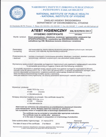 NARODOWY INSTYTUT ZDROWIA PUBLICZNEGO _ płŃsrwowy ZAKŁAD HIGIENy NAT|oNAL lNsTlTUTE oF PUBLlc HEALTH _ NAT|oNAL lNSTITUTE oF HYG|ENE ZAKŁAD H lG E Ny śnooowl sKA DEPARTMENT OF ENVIRONMENTAL HYGIENE ! 24 Chocimska 00-791 Warsaw o Phone (22) 542t354; (22) 5421349 o Fax (22) 5427287 AT§§T HIGIENi6ĘNY HYG!EN!c cERTlFIGATE wyrób / o e-mail: [email protected] HwBtu2g8tllt201,3 oRYGlNAŁ product: Drzwi przemysłowe, chłodnicze, mroźn-cze i gazoszczelne: pzesuwne typ DPS/DPK/DPSG/DPKG, rozwieralne typ DRE/DRSIDRK/DRG i DRU, wahadłowe typ DW; Modułowa komora chłodnicza I mroźnicza Zawierający containing: / Pueznaczony / destined: do stal kwasoodporną, blachę stalową obustronnie pokrytą lakierem poliestrowym, tworzywa sztuczne i inne materiały wg dokumentacji producenta montażu w komorach z kontrolowaną atmosferą, chłodniach, mroźniach, obiektach przemysłu spoźywczego, zakładach przetwórczych oraz placówkach słuzby zdrowia Wymieniony wyzej produkt odpowiada wymaganiom higienicznym przy spełnieniu następujących warunków / is acceptable according to hygienic criteria with the following conditions. W przypadku stosowania w obiektach służby zdrowia wyrób musi spełniać wymagania rozporządzenia Ministra Zdrowia z dnia26 czerwca 2012 (Dz. U.2012.739 z29 czel\Nca2012) w sprawie szczegółowych wymagań, jakim powinny odpowiadać pomieszczenia i urządzenia podmiotu wykonującego działalnośćleczniczą. Atest nie dotyczy bezpośredniego kontaktu wyrobu z żywnością. Atest jest wyłącznie oceną higieniczną i nie dotyczy parametrów technicznych i walorów użytkowych wyrobu a---_-. .:as.=:'' = Wytwórca / producer: . PaNELTECH Sp. z o 41-508 o, ul. Michałkowicka24 / this ceńificate issued for: PaNELTECHSp.zoo. 41-508 : .a Chorzów Niniejszy dokument wydano na wniosek = ż;':,.. ' :: : ź?ź>ł? '' ""?a:--., - ,, ,:?ź; _?Ż/;.:"'= ź/ź,' ,. .,?-.:ł:.. , , i?-.ź..: =,| ż<!_..4 ź=,?-_-., ą::: := ?ź)-.-, ' :,F:.zr:/.. /4-:: Chorzów ul. Michałkowicka24 Atest może być zmieniony lub unieważniony po przedstawieniu stosownych dowodów przez którąkolwiek stronę. Niniejszy atest traci ważnośćpo 2018-03-31 lub w przypadku zmian w receptufte albo w technologii wytwarzania wyrobu. The ceńificate may be corrected or cancelled after appropriate motivation. The ceńificate loses its validity after 2018_03-31 or in the case of changes in composition or in technology of production. Data wydania atestu higienicznego: 31 marca 2013 The date of issue of the ceńificate: 31st March kierownik 2013 Reprodukowanie, kopiowanie, fotografowanie, Skanowanie, digitalizacja Atestu Higienicznego w celach marketingowych bez zgody NlZP-PZH jest zabronione, www.pzh.gov.pl ZakłaQy Higieny