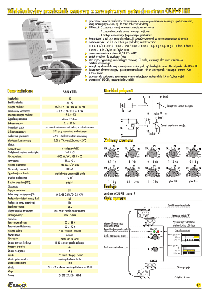Wielofunkcyjny przekaŸnik czasowy z zewnêtrznym potencjometrem CRM-91HE t przekaŸnik czasowy z mo¿liwoœci¹ sterowania czasu zewnêtrznym elementem steruj¹cym - potencjometrem, który mo¿na przymocowaæ np. do drzwi tablicy rozdzielczej t 10 funkcji - 5 czasowych funkcji sterowanych napiêciem steruj¹cym - 4 czasowe funkcje sterowane steruj¹cym wejœciem - 1 funkcja mapiêciowego (impulsowego) przekaŸnika t komfortowe i przejrzyste nastawianie funkcji i zakresów czasowych za pomoc¹ prze³¹czników obrotowych t nastawialny czas od 0.1 s do 10 dni jest podzielony na 10 zakresów (0.1 s - 1 s / 1 s - 10 s / 0.1 min - 1 min / 1 min - 10 min / 0.1 g - 1 g / 1 g - 10 g / 0.1 dnia - 1 dzieñ / 1 dzieñ - 10 dni / tylko ON / tylko OFF) t uniwersalne napiêcie zasilania AC/DC 12 - 240 V t zestyk wyjœciowy: 1x prze³¹czny 16 A t stan wyjœcia sygnalizujê wielofunkcyjna czerwon¹ LED dioda, która miga albo œwieci w zale¿noœci od stanu wyjœciowego t Zewnêtrzny element steruj¹cy - potencjometer mo¿na pod³¹czyæ do odleg³oœci maks. 10m od przeka¿nika CRM-91HE t Zewnêtrzny element steruj¹cy - potencjometer: ochrona IP65 ze strony panelu czo³owego , ochrona IP20 z tylnej strony t przewody dla pod³¹czenia zewnêtrznego elementu steruj¹cego maksymalnie 1.5 mm2 z/bez tulejki t wykonanie 1-MODU£, mocowanie do szyn DIN Dane techniczne CRM-91HE Iloœæ funkcji: Zaciski zasilania: Napiêcie zasilania: Znamionowy pobór mocy: Tolerancja napiêcia zasilania: Sygnalizacja zasilania: 10 Zakresy czasowe: Nastawianie czasu: Dok³adnoœæ czasowa: Rozbie¿noœæ powtórzeñ: Wspó³czynnik temperatury: Wyjœcie Iloœæ zestyków: Obci¹¿alnoœæ pr¹dowa trwa³a styku: Moc ³¹czeniowa: Przeci¹¿enie: Napiêcie ³¹czeniowe: Min. moc ³¹czeniowa DC: Sygnalizacja zadzia³ania: 0.01 % / o C, wartoœæ bazowa = 20 oC 1x prze³¹czny (AgNi) 16 A / AC1 4000 VA / AC1, 384 W / DC 30 A / <3 s 250 V AC1 / 24 V DC 500 mW wielofukcyjna czerwona LED dioda 0.7x10 Czas regeneracji: Inne dane Temperatura robocza: Temperatura sk³adowania: Napiêcie izolacji: Pozycja pracy: Mocowanie: Stopieñ ochrony obudowy: Kategoria przepiêæ: Stopieñ nieczystoœci: Zaciski: Wymiar potencjometru: Waga potencjometru: Wymiar: Waga: Normy: S zielona LED dioda 0.1 s - 10 dni prze³¹cznikami obrotowymi, externym potenciometrem 5 % - przy nastawianiu mechanicznym 0.2 % - stabilnoœæ wartoœci nastawionej 5 UNI AC 0.025-0.2VA / DC 0.1-0.7W Tak Nie A2 15 + A1 Un S A2 (maks) B2 B1 (min) 16 18 15 (maks) B2 B3 Zakresy czasowe m 10 1 g 1 10 1 d 10 10 S 1 m ON OFF m 10 1 g 1 10 1 d 10 10 S 1 ON OFF m 10 1 g 1 10 m 1 d 10 10 S 1 10 1 ON OFF III. 2 2.5 mm2/ z tulejk¹ 1.5 mm2 wymiary detaliczne str. 87 15 g 90 x 17.6 x 64 mm, wymiary detaliczne str. 86-88 68 g EN 61812-1, EN 61010-1 g 1 10 1 d 10 10 S 1 ON OFF 0.1 - 1 s 1 - 10 s 0.1 - 1 min 1 - 10 min g 1 10 g 1 10 g 1 10 g 1 10 10 1 1 d 10 10 S 1 ON OFF m 10 1 10 S1 1 - 10 g Funkcje 1 d 10 ON OFF m 10 1 m 1 d 10 10 S1 0.1 - 1 dzieñ 10 1 ON OFF 1 d 10 10 S1 ON OFF tylko ON 1 - 10 dni m 10 1 g 1 10 10 S 1 1 d 10 ON OFF 0.1 - 1 g m 10 1 g 1 10 10 S1 1 d 10 ON OFF tylko OFF zgodnoœæ z CRM-91H, strona 17 Opis aparatu Zaciski napiêcia zasilania max. 150 ms dowolna szyna DIN EN 60715 IP 40 ze strony panelu czo³owego B3 Zewnêtrzny element steruj¹cy A1-S min. 25 ms / maks. nieograniczona -20 .. +55 oC o -30 .. +70 C 4 kV (zasilanie - wyjœcie) (min) Zewnêtrzny element steruj¹cy AC 0.7 - 3 VA / DC 0.5 - 1.7 W -15 %; +10 % Trwa³oœæ ³¹czeniowa(AC1): Sterowanie Napiêcie sterowania: Pod³¹czenie lampy jarzeniowej: Zaciski sterowania: D³ugoœæ impulsu steruj¹cego: B1 A1 - A2 AC/DC 12 - 240 V (AC 50 - 60 Hz) 3x10 7 Pod³¹czenie obci¹¿enia miêdzy S-A2: 16 18 A1 Trwa³oœæ mechaniczna: Pobór mocy steruj¹cego wejœcia: Rozk³ad po³¹czeñ A1 Wejœcie dla externego sterowania czasu Sygnalizacja napiêcia zasilania Steruj¹ce wejœcie "S" S A2 Sygnalizacja zadzia³ania wielofunkcyjn¹ LED diod¹ B1 B3 B2 CRM-91HE Un m 10 1 Grube nastawianie czasu h 1 10 10 S1 Delikatne nastawianie czasu c Przyk³ady sygnalizacji 1 d 10 ON OFF d e b a f g j h i TIME FUNC Funkcja: a U 15-18 LED t Funkcja: e U S 15-18 LED t Wolna pozycja 15 16 18 Zestyki wyjœciowe 17