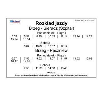Rozkład ważny od 01.10.2015r. Rozkład jazdy Brzeg - Sieradz (Szpital) Poniedziałek - Piątek 5:59 15:24 6:59 16:54 8:19 10:19 12:14 13:24 14:29 13:52 15:02 Sobota 6:07 10:07 13:07 17:17 Brzeg - Pęczniew Poniedziałek - Piątek 6:37 16:17 7:52 19:02 9:52 11:07 11:57 Sobota 7:53 11:33 14:58 18:48 UWAGA! Busy nie kursują w Niedziele i Święta oraz w Wigilię, Wielką Sobotę i Sylwestra.