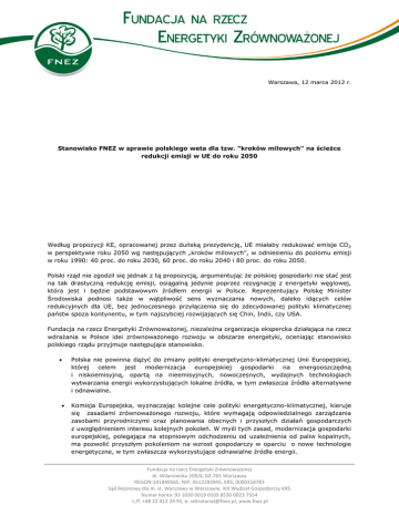 Warszawa, 12 marca 2012 r. Stanowisko FNEZ w sprawie polskiego weta dla tzw. "kroków milowych" na ścieżce redukcji emisji w UE do roku 2050 Według propozycji KE, opracowanej przez duńską prezydencję, UE miałaby redukować emisje CO 2 w perspektywie roku 2050 wg następujących „kroków milowych”, w odniesieniu do poziomu emisji w roku 1990: 40 proc. do roku 2030, 60 proc. do roku 2040 i 80 proc. do roku 2050. Polski rząd nie zgodził się jednak z tą propozycją, argumentując że polskiej gospodarki nie stać jest na tak drastyczną redukcję emisji, osiągalną jedynie poprzez rezygnację z energetyki węglowej, która jest i będzie podstawowym źródłem energii w Polsce. Reprezentujący Polskę Minister Środowiska podnosi także w wątpliwość sens wyznaczania nowych, daleko idących celów redukcyjnych dla UE, bez jednoczesnego przyłączenia się do zdecydowanej polityki klimatycznej państw spoza kontynentu, w tym najszybciej rozwijających się Chin, Indii, czy USA. Fundacja na rzecz Energetyki Zrównoważonej, niezależna organizacja ekspercka działająca na rzecz wdrażania w Polsce idei zrównoważonego rozwoju w obszarze energetyki, oceniając stanowisko polskiego rządu przyjmuje następujące stanowisko. Polska nie powinna dążyć do zmiany polityki energetyczno-klimatycznej Unii Europejskiej, której celem jest modernizacja europejskiej gospodarki na energooszczędną i niskoemisyjną, opartą na nieemisyjnych, nowoczesnych, wydajnych technologiach wytwarzania energii wykorzystujących lokalne źródła, w tym zwłaszcza źródła alternatywne i odnawialne. Komisja Europejska, wyznaczając kolejne cele polityki energetyczno-klimatycznej, kieruje się zasadami zrównoważonego rozwoju, które wymagają odpowiedzialnego zarządzania zasobami przyrodniczymi oraz planowania obecnych i przyszłych działań gospodarczych z uwzględnieniem interesu kolejnych pokoleń. W myśl tych zasad, modernizacja gospodarki europejskiej, polegająca na stopniowym odchodzeniu od uzależnienia od paliw kopalnych, ma pozwolić przyszłym pokoleniom na wzrost gospodarczy w oparciu o nowe technologie energetyczne, w tym zwłaszcza wykorzystujące odnawialne źródła energii. Fundacja na rzecz Energetyki Zrównoważonej Al. Wilanowska 208/4, 02-765 Warszawa REGON:141849565, NIP: 9512283945, KRS: 0000318783 Sąd Rejonowy dla m. st. Warszawy w Warszawie, XIII Wydział Gospodarczy KRS Numer konta: 93 1030 0019 0109 8530 0023 7554 t./f. +48 22 412 24 92, e: [email protected], www.fnez.pl Analizując stanowisko Komisji Europejskiej w sprawie nowych celów w zakresie redukcji emisji należy jednak wziąć także pod uwagę, że najważniejsze państwa UE od wielu lat rozwijają technologie nieemisyjne i wykorzystujące odnawialne źródła energii, widząc w tym nie tylko szansę na wdrażanie zasad zrównoważonego rozwoju, lecz przede wszystkim szansę na zwiększenie konkurencyjności gospodarczej oraz zagraniczną ekspansję technologiczną własnego przemysłu. Europejski rynek energetyki jądrowej i OZE zatrudnia setki tysięcy ludzi i generuje miliardowe przychody. U podstaw nowych propozycji KE stoi więc także świadomość, że tylko dalsze wspieranie ambitnych celów redukcyjnych na szczeblu międzynarodowym, pozwoli na dalszy rozwój tych sektorów. Taka motywacja, uwzględniająca partykularny interes poszczególnych państw członkowskich, umacnia na tyle silnie stanowisko KE, że próba jego zmiany jest skazana na niepowodzenie. Polska znajduje się w trudnej sytuacji, ze względu na dotychczasowe uzależnienie krajowej gospodarki od energetyki węglowej. Przyjęcie bezkrytyczne ambitnych celów redukcyjnych proponowanych przez Komisję Europejską na najbliższe dziesięciolecia, bez zapewnienia odpowiedniego oprzyrządowania pozwalającego na ich bezpieczne osiągnięcie przez polską gospodarkę, byłoby działaniem nieodpowiedzialnym. Z tego powodu FNEZ popiera stanowisko Rządu wyrażone podczas ostatniego posiedzenia Rady UE ds. środowiska. Argumentacja przedstawiana przez polski rząd, a przede wszystkim działania na szczeblu krajowym i międzynarodowym w obszarze polityki energetycznoklimatycznej są jednak nie do zaakceptowania i wymagają, w imię polskiej racji stanu, drastycznych i natychmiastowych zmian. Biorąc pod uwagę, że nowe cele zaproponowane przez KE dotyczą perspektywy roku 2050, polski rząd nie może opierać argumentacji w tej sprawie na obecnym uzależnieniu polskiej energetyki od węgla. Jeżeli bowiem rząd zamierza utrzymać w perspektywie roku 2050 ponad 50% udział źródeł węglowych w krajowym energy mix, to znaczy że nie myśli o przyszłych pokoleniach i nie próbuje, zgodnie z zasadą trwałego i zrównoważonego rozwoju, zapewnić im bezpieczeństwa energetycznego i gospodarczego. FNEZ zgadza się, że w interesie polskiej gospodarki jest jak najdłuższe wykorzystywanie węgla jako istotnego źródła energii. Aby jednak było to możliwe w okresie kolejnych 40-60 lat, już dziś niezbędna jest gruntowna zmiana podejścia do technologii węglowych. Niezbędne jest poszukiwanie i wdrażanie nowych, maksymalnie efektywnych metod wytwarzania energii z węgla, a także stopniowe racjonalizowanie jego udziału w strukturze źródeł energii. Należy pamiętać, że w kolejnych dziesięcioleciach wydobycie węgla będzie coraz bardziej kosztowne i technologie jego wykorzystania muszą być bardziej wydajne. Wszelkie scenariusze rozwoju polskiej energetyki, a tym samym wszelkie stanowiska w sprawie polityki energetyczno-klimatycznej, powinny być oparte na rzetelnych analizach krajowych zasobów energetycznych, a także studiach wykonalności niezbędnych inwestycji. Tymczasem polski rząd zbyt często opiera swoją politykę na niewystarczająco zweryfikowanych opiniach, publikacjach popularno-naukowych i stanowiskach pseudoekspertów, którzy za swoje teorie nie ponoszą żadnej odpowiedzialności. Skutkiem czego jest wkładani