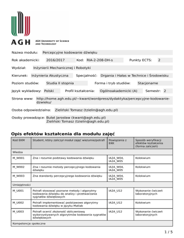 Nazwa modułu: Percepcyjne kodowanie dźwięku Rok akademicki: Wydział: Kierunek: 2016/2017 Kod: RIA-2-208-DH-s Punkty ECTS: 2 Inżynierii Mechanicznej i Robotyki Inżynieria Akustyczna Poziom studiów: Specjalność: Studia II stopnia Język wykładowy: Polski Drgania i Hałas w Technice i Środowisku Forma i tryb studiów: Profil kształcenia: Stacjonarne Ogólnoakademicki (A) Semestr: 2 Strona www: http://home.agh.edu.pl/~kwant/wordpress/dydaktyka/percepcyjne-kodowaniedzwieku/ Osoba odpowiedzialna: Zieliński Tomasz ([email protected]) Osoby prowadzące: Bułat Jarosław ([email protected]) Zieliński Tomasz ([email protected]) Opis efektów kształcenia dla modułu zajęć Kod EKM Student, który zaliczył moduł zajęć wie/umie/potrafi Powiązania z EKK Sposób weryfikacji efektów kształcenia (forma zaliczeń) M_W001 Zna i rozumie podstawy kodowania dźwięku IA2A_W04, IA2A_W05 Kolokwium M_W002 Zna i rozumie metody percepcyjnego kodowania dźwięku IA2A_W04, IA2A_W05 Kolokwium M_W003 Zna standardy percepcyjnego kodowania dźwięku IA2A_W04, IA2A_W05 Kolokwium M_U001 Potrafi stosować poznane metody i algorytmy kodowania dźwięku do analizy i przetwarzania sygnałów dźwiękowych IA2A_U12 Wykonanie ćwiczeń laboratoryjnych M_U002 Potrafi implementować podstawowe algorytmy kodowania dźwięku w języku Matlab IA2A_U12 Kolokwium M_U003 Potrafi ocenić złożoność obliczeniową wykorzystywanych algorytmów kodowania sygnałów dźwiękowych IA2A_U12 Wykonanie ćwiczeń laboratoryjnych Wiedza Umiejętności Kompetencje społeczne 1/5 Karta modułu - Percepcyjne kodowanie dźwięku M_K001 Rozumie potrzebę ciągłego dokształcania się i podnoszenia kwalifikacji zawodowych IA2A_K07 Udział w dyskusji Matryca efektów kształcenia w odniesieniu do form zajęć Konwersatori um Zajęcia seminaryjne Zajęcia praktyczne Zajęcia terenowe Zajęcia warsztatowe Zna i rozumie podstawy kodowania dźwięku + - + - - - - - - - - M_W002 Zna i rozumie metody percepcyjnego kodowania dźwięku + - + - - - - - - - - M_W003 Zna standardy percepcyjnego kodowania dźwięku + - + - - - - - - - - M_U001 Potrafi stosować poznane metody i algorytmy kodowania dźwięku do analizy i przetwarzania sygnałów dźwiękowych + - + - - - - - - - - M_U002 Potrafi implementować podstawowe algorytmy kodowania dźwięku w języku Matlab + - + - - - - - - - - M_U003 Potrafi ocenić złożoność obliczeniową wykorzystywanych algorytmów kodowania sygnałów dźwiękowych + - + - - - - - - - - + - + - - - - - - - - E-learning Ćwiczenia projektowe M_W001 Inne Ćwiczenia laboratoryjne Forma zajęć Ćwiczenia audytoryjne Student, który zaliczył moduł zajęć wie/umie/potrafi Wykład Kod EKM Wiedza Umiejętności Kompetencje społeczne M_K001 Rozumie potrzebę ciągłego dokształcania się i podnoszenia kwalifikacji zawodowych Treść modułu zajęć (program wykładów i pozostałych zajęć) Wykład Percepcyjne kodowanie dźwięku. Perceptual coding of audio. WYKŁADY (14 godz) 1. Podstawy bezstratnego (Huffmana) i stratnego (ADPCM) kodowania sygnałów. Introduction to lossless (Huffman) and lossy (ADPCM) audio coding. (2g) 2/5 Karta modułu - Percepcyjne kodowanie dźwięku 2. Percepcyjne właściwości ludzkiego słuchu. Modele psychoakustyczne 1 i 2 MPEG audio. Perceptual features of human hearing system. Psychoacoustic models of MPEG audio standard. (2g) 3. Zestawy filtrów: dekompozycja sygnału dźwiękowego w standardach MP2 i MP3. Filter banks: sub-band analysis and synthesis of audio in MP2 and MP3 standard. (2g) 4. Algorytm MP2 standardu MPEG-2 audio: alokacja bitów, formowanie ramki. Algorithm MP2 of MPEG-2 audio standard: bit allocation, bit-stream forming. (2g) 5. Algorytmy MP3 i AAC standardu kompresji MPEG-2 audio. Algorithms MP3 and AAC of MPEG-2 audio standard. (2g) 6. Algorytmy kodowania dźwięku standardu MPEG-4. Audio coding algorithms of MPEG-4 standard. (2g) 7. Algorytm AC3. Kodowanie dźwięku wielokanałowego. Bezstratne kodowanie dźwięku. Algorithm AC3. Multichannel audio coding. Lossless audio coding. (1g) 8. Kierunki rozwoju kodowania percepcyjnego dźwięku. Evolution directions of perceptual audio coding. (1g) Ćwiczenia laboratoryjne Percepcyjne kodowanie dźwięku. Perceptual coding of audio. ĆWICZENIA LABORATORYJNE (14 godz) W module prowadzone są zajęcia laboratoryjne (komputerowe) w języku Matlab, które ugruntowują i rozszerzają wiedzę przekazywaną podczas wykładów. 1. Bezstratne kodowanie Huffmana. Lossless Huffman coding. (2g) 2. Stratne kodowanie ADPCM. Lossy ADPCM coding. (2g) 3. Modele psychoakustyczne 1 i 2 standardu MPEG-2 audio. Psychoacoustic models 1 and 2 of MPEG-2 audio standard. (2g) 4. Zespół filtrów poziomu MP2 standardu MPEG audio. Filter bank of MP2 compression algorithm of MPEG-2 audio standard. (2g) 5. Alokacja bitów i formowanie ramki w standardzie MP2 standardu MPEG audio. Bit allocation and bitstream forming in MP2 algorithm of MPEG-2 audio standard. (2g) 6. Zespół filtrów poziomu MP3 standardu MPEG-2 audio. Filter bank in MP3 layer of MPEG-2 audio standard. (2g) 7. Kodowanie dźwięku wielokanałowego. Bezstratne kodowanie dźwięku. Multichannel audio coding. Lossless audio coding. (2g) Sposób obliczania oceny końcowej 1. Aby uzyskać pozytywną ocenę końcową niezbędne jest uzyskanie pozytywnej oceny z ćwiczeń laboratoryjnych oraz kolokwium z wykładu. 2. Obliczamy średnią arytmetyczną z ocen zaliczenia i kolokwium uzyskanych we wszystkich terminach. 3. Wyznaczmy ocenę końcową na podstawie zależności: if sr>4.75 then OK:=5.0 else if sr>4.25 then OK:=4.5 else if sr>3.75 then OK:=4.0 else if sr>3.25 then OK:=3.5 else OK:=3 4.Jeżeli pozytywną ocenę z ćwiczeń i kolokwium z wykładu uzyskano w pierwszym terminie oraz ocena końcowa jest mniejsza niż 5.0 to ocena końcowa jest podnoszona o 0.5 Wymagania wstępne i dodatkowe Znajomość podstaw cyfrowego przetwarzania sygnałów Zalecana literatura i pomoce nauko