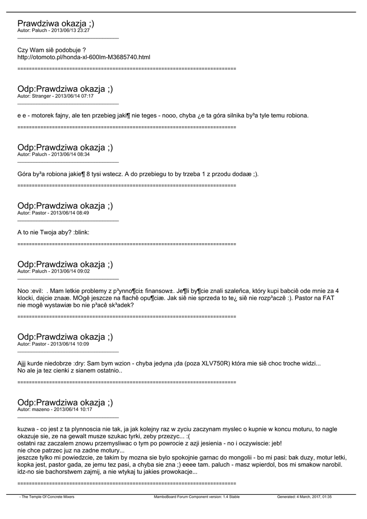 Prawdziwa okazja ;) Autor: Paluch - 2013/06/13 23:27 _____________________________________ Czy Wam siê podobuje ? http://otomoto.pl/honda-xl-600lm-M3685740.html ============================================================================ Odp:Prawdziwa okazja ;) Autor: Stranger - 2013/06/14 07:17 _____________________________________ e e - motorek fajny, ale ten przebieg jaki¶ nie teges - nooo, chyba ¿e ta góra silnika by³a tyle temu robiona. ============================================================================ Odp:Prawdziwa okazja ;) Autor: Paluch - 2013/06/14 08:34 _____________________________________ Góra by³a robiona jakie¶ 8 tysi wstecz. A do przebiegu to by trzeba 1 z przodu dodaæ ;). ============================================================================ Odp:Prawdziwa okazja ;) Autor: Pastor - 2013/06/14 08:49 _____________________________________ A to nie Twoja aby? :blink: ============================================================================ Odp:Prawdziwa okazja ;) Autor: Paluch - 2013/06/14 09:02 _____________________________________ Noo :evil: . Mam letkie problemy z p³ynno¶ci± finansow±. Je¶li by¶cie znali szaleñca, który kupi babciê ode mnie za 4 klocki, dajcie znaæ. MOgê jeszcze na flachê opu¶ciæ. Jak siê nie sprzeda to te¿ siê nie rozp³aczê :). Pastor na FAT nie mogê wystawiæ bo nie p³acê sk³adek? ============================================================================ Odp:Prawdziwa okazja ;) Autor: Pastor - 2013/06/14 10:09 _____________________________________ Ajjj kurde niedobrze :dry: Sam bym wzion - chyba jedyna ¡da (poza XLV750R) która mie siê choc troche widzi... No ale ja tez cienki z sianem ostatnio.. ============================================================================ Odp:Prawdziwa okazja ;) Autor: mazeno - 2013/06/14 10:17 _____________________________________ kuzwa - co jest z ta plynnoscia nie tak, ja jak kolejny raz w zyciu zaczynam myslec o kupnie w koncu moturu, to nagle okazuje sie, ze na gewalt musze szukac tyrki, zeby przezyc... :( ostatni raz zaczalem znowu przemysliwac o tym po powrocie z azji jesienia - no i oczywiscie: jeb! nie chce patrzec juz na zadne motury... jeszcze tylko mi powiedzcie, ze takim by mozna sie bylo spokojnie garnac do mongolii - bo mi pasi: bak duzy, motur letki, kopka jest, pastor gada, ze jemu tez pasi, a chyba sie zna ;) eeee tam. paluch - masz wpierdol, bos mi smakow narobil. idz-no sie bachorstwem zajmij, a nie wtykaj tu jakies prowokacje... ============================================================================ - The Temple Of Concrete Mixers MamboBoard Forum Component version: 1.4 Stable Generated: 4 March, 2017, 01:35 Odp:Prawdziwa okazja ;) Autor: Paluch - 2013/06/14 12:06 _____________________________________ Taajest kierowniku. W³a¶nie wracamy z Marysi± z czere¶ni od dziadka. Kurwa nawet czere¶nie mi w tym roku nie obrodzi³y. U te¶cia a¿ siê drzewo gnie :D. Spokojnie Mazeno. Znaj±c moje szczê¶cie i tak siê motór nie sprzeda(mo¿e dobrze), wiêc poczeka se u mnie jeszcze z rok. Co do Mongoli. Ma³o pali, wszêdzie wjedzie i o dziwo nie trzeba wypychaæ bo wyjedzie te¿. Zasiêg na baku zaaajebisty. No i jak siê wyeliminuje wady to niezawodna. Nie wiem jak z ch³odzeniem w Mongolii bo to powietrzak i bez ch³odnicy oleju. Du¿o ich je¼dzi³o po Australii i dawa³y radê. A kasa có¿. Rzecz nabyta raz jest raz jej nie ma. Na ten pierwszy przypadek wci±¿ czekam :silly: . ============================================================================ Odp:Prawdziwa okazja ;) Autor: Paluch - 2013/06/14 16:22 _____________________________________ Motocykl sprzedany kurwa maæ :(. Matjas znowu siê popisa³. Jaki¶ loko od niego z wioski siê znalaz³. Bêd± wakacje dla rodziny i tañszy motór bêdzie(czy mog± byæ tañsze jeszcze :D?). ============================================================================ Odp:Prawdziwa okazja ;) Autor: mazeno - 2013/06/14 17:03 _____________________________________ ty sie ciesz, a nie placz - tera obaj mamy strupa z glowy http://megaprzygoda.pl/_d/hehe.gif ============================================================================ Odp:Prawdziwa okazja ;) Autor: Pastor - 2013/06/18 07:19 _____________________________________ Temat wprawdzie ju¿ sie zdezaktualizowa³, ale tytu³ ma fajny wiêc sie dopnê: Panowie!! Szybka & gwa³towna akcja sprzedazowa - chce mój kajak opyliæ! Kto¶ ma ochote? Przypomnê: Szybka, lekka dwójka z laminatu, 535 cm, 2 bakisty, osobne kokpity. Foty gdzie¶ s± jakie¶. Bez uszkodzeñ strukturalnych ale mocno ¶ciorany wizualnie. Jakby co to dawaæ, bo w tym tygodniu musze mieæ jasno¶æ. Mam upatrzony okrêt z PE, ale cholera ani miejsca ani siana.. Druga rzecz - opyle rikszê w trybie przyspieszonym. Fotomateria³ mam jakis, ale wzbogacê na zyczenie. ============================================================================ Odp:Prawdziwa okazja ;) Autor: Stranger - 2013/06/18 07:29 _____________________________________ jowej to we¼ na Alledrogo wystaw - tam najszybciej opylisz. ============================================================================ Odp:Prawdziwa okazja ;) Autor: Pastor - 2013/06/18 09:29 _____________________________________ Nie mam konta tam¿e.. ============================================================================ - The Temple Of Concrete Mixers MamboBoard Forum Component version: 1.4 Stable Generated: 4 March, 2017, 01:35 Odp:Prawdziwa okazja ;) Autor: Stranger - 2013/06/18 10:09 _____________________________________ ja mam tam¿e konto - mogê wystawiæ jak mi dasz opis i zdjêcia ============================================================================ Odp:Prawdziwa okazja ;) Autor: Pastor - 2013/06/18 11:41 _____________________________________ Spokoloko - pofoce riksze po urlopie i bêdziemy dzia³aæ. Na razie mój kajak sprzedaj. Prowizjê przepijemy :) =====================================================================