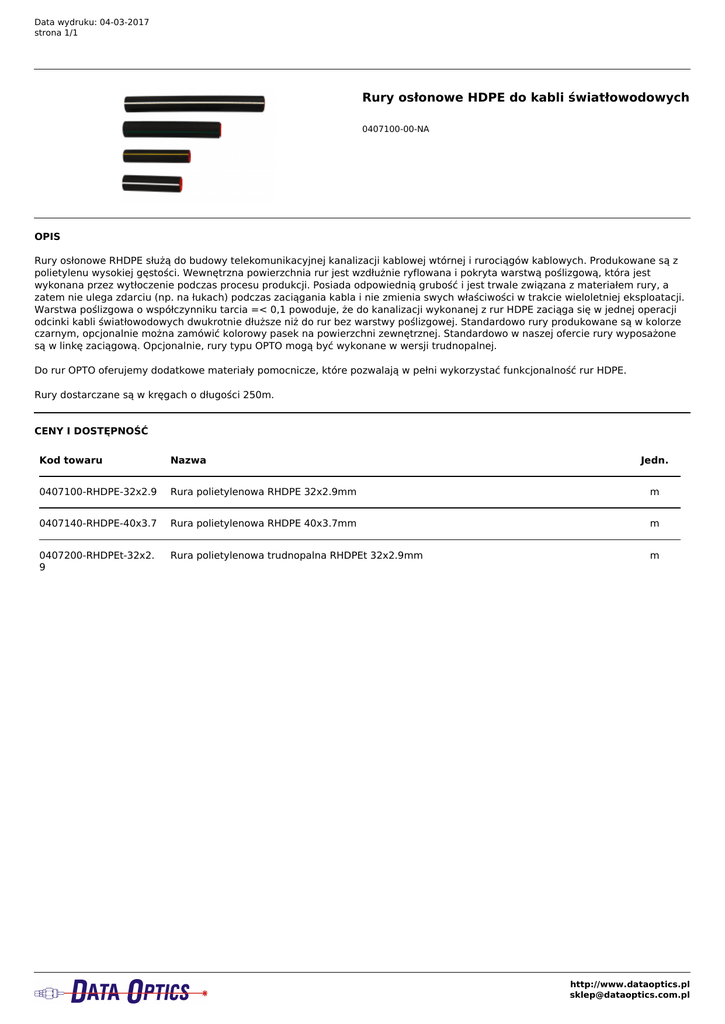 Data wydruku: 04-03-2017 strona 1/1 Rury osłonowe HDPE do kabli światłowodowych 0407100-00-NA OPIS Rury osłonowe RHDPE służą do budowy telekomunikacyjnej kanalizacji kablowej wtórnej i rurociągów kablowych. Produkowane są z polietylenu wysokiej gęstości. Wewnętrzna powierzchnia rur jest wzdłużnie ryflowana i pokryta warstwą poślizgową, która jest wykonana przez wytłoczenie podczas procesu produkcji. Posiada odpowiednią grubość i jest trwale związana z materiałem rury, a zatem nie ulega zdarciu (np. na łukach) podczas zaciągania kabla i nie zmienia swych właściwości w trakcie wieloletniej eksploatacji. Warstwa poślizgowa o współczynniku tarcia =< 0,1 powoduje, że do kanalizacji wykonanej z rur HDPE zaciąga się w jednej operacji odcinki kabli światłowodowych dwukrotnie dłuższe niż do rur bez warstwy poślizgowej. Standardowo rury produkowane są w kolorze czarnym, opcjonalnie można zamówić kolorowy pasek na powierzchni zewnętrznej. Standardowo w naszej ofercie rury wyposażone są w linkę zaciągową. Opcjonalnie, rury typu OPTO mogą być wykonane w wersji trudnopalnej. Do rur OPTO oferujemy dodatkowe materiały pomocnicze, które pozwalają w pełni wykorzystać funkcjonalność rur HDPE. Rury dostarczane są w kręgach o długości 250m. CENY I DOSTĘPNOŚĆ Kod towaru Nazwa Jedn. 0407100-RHDPE-32x2.9 Rura polietylenowa RHDPE 32x2.9mm m 0407140-RHDPE-40x3.7 Rura polietylenowa RHDPE 40x3.7mm m 0407200-RHDPEt-32x2. 9 Rura polietylenowa trudnopalna RHDPEt 32x2.9mm m http://www.dataoptics.pl [email protected] Powered by TCPDF (www.tcpdf.org)
