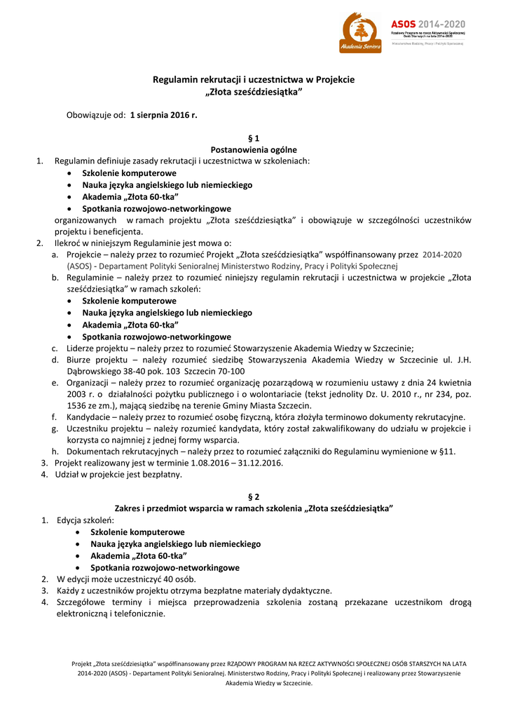 Regulamin rekrutacji i uczestnictwa w Projekcie „Złota sześćdziesiątka” Obowiązuje od: 1 sierpnia 2016 r. 1. 2. 3. 4. §1 Postanowienia ogólne Regulamin definiuje zasady rekrutacji i uczestnictwa w szkoleniach: Szkolenie komputerowe Nauka języka angielskiego lub niemieckiego Akademia „Złota 60-tka” Spotkania rozwojowo-networkingowe organizowanych w ramach projektu „Złota sześćdziesiątka” i obowiązuje w szczególności uczestników projektu i beneficjenta. Ilekroć w niniejszym Regulaminie jest mowa o: a. Projekcie – należy przez to rozumieć Projekt „Złota sześćdziesiątka” współfinansowany przez 2014-2020 (ASOS) - Departament Polityki Senioralnej Ministerstwo Rodziny, Pracy i Polityki Społecznej b. Regulaminie – należy przez to rozumieć niniejszy regulamin rekrutacji i uczestnictwa w projekcie „Złota sześćdziesiątka” w ramach szkoleń: Szkolenie komputerowe Nauka języka angielskiego lub niemieckiego Akademia „Złota 60-tka” Spotkania rozwojowo-networkingowe c. Liderze projektu – należy przez to rozumieć Stowarzyszenie Akademia Wiedzy w Szczecinie; d. Biurze projektu – należy rozumieć siedzibę Stowarzyszenia Akademia Wiedzy w Szczecinie ul. J.H. Dąbrowskiego 38-40 pok. 103 Szczecin 70-100 e. Organizacji – należy przez to rozumieć organizację pozarządową w rozumieniu ustawy z dnia 24 kwietnia 2003 r. o działalności pożytku publicznego i o wolontariacie (tekst jednolity Dz. U. 2010 r., nr 234, poz. 1536 ze zm.), mającą siedzibę na terenie Gminy Miasta Szczecin. f. Kandydacie – należy przez to rozumieć osobę fizyczną, która złożyła terminowo dokumenty rekrutacyjne. g. Uczestniku projektu – należy rozumieć kandydata, który został zakwalifikowany do udziału w projekcie i korzysta co najmniej z jednej formy wsparcia. h. Dokumentach rekrutacyjnych – należy przez to rozumieć załączniki do Regulaminu wymienione w §11. Projekt realizowany jest w terminie 1.08.2016 – 31.12.2016. Udział w projekcie jest bezpłatny. §2 Zakres i przedmiot wsparcia w ramach szkolenia „Złota sześćdziesiątka” 1. Edycja szkoleń: Szkolenie komputerowe Nauka języka angielskiego lub niemieckiego Akademia „Złota 60-tka” Spotkania rozwojowo-networkingowe 2. W edycji może uczestniczyć 40 osób. 3. Każdy z uczestników projektu otrzyma bezpłatne materiały dydaktyczne. 4. Szczegółowe terminy i miejsca przeprowadzenia szkolenia zostaną przekazane uczestnikom drogą elektroniczną i telefonicznie. Projekt „Złota sześćdziesiątka” współfinansowany przez RZĄDOWY PROGRAM NA RZECZ AKTYWNOŚCI SPOŁECZNEJ OSÓB STARSZYCH NA LATA 2014-2020 (ASOS) - Departament Polityki Senioralnej. Ministerstwo Rodziny, Pracy i Polityki Społecznej i realizowany przez Stowarzyszenie Akademia Wiedzy w Szczecinie. 1. 2. 3. 4. 5. 6. 1. 2. 1. 2. 3. §3 Zasady rekrutacji Nabór kandydatów do uczestnictwa w szkoleniach Szkolenie komputerowe Nauka języka angielskiego lub niemieckiego Akademia „Złota 60-tka” Spotkania rozwojowo-networkingowe prowadzony jest w dniach od 01 sierpnia 2015 r. do 30 września 2015 r. lub do wyczerpania limitu miejsc. Kandydaci zakwalifikowani do udziału w szkoleniach mają obowiązek uczestniczyć w całości szkolenia. Dokumenty rekrutacyjne należy złożyć w biurze projektu osobiście, drogą pocztową lub kurierem. Za termin złożenia dokumentów rekrutacyjnych przyjmuje się datę wpływu dokumentów do Biura Projektu. Złożone dokumenty rekrutacyjne podlegają ocenie składającej się z części formalnej. Ocena formalna obejmuje weryfikację: a. Kompletności, terminowości i poprawności dokumentów rekrutacyjnych złożonych przez kandydata, b. Braki formalne w dokumentach rekrutacyjnych mogą być uzupełniane przez kandydatów w terminie do 3 dni roboczych od daty otrzymania informacji o brakach formalnych. c. Jeżeli termin na poprawę braków formalnych określony w punkcie b) przekracza termin zakończenia rekrutacji określony w § 3 ust. 1 to należy je uzupełnić do dnia zakończenia rekrutacji określonego w § 3 ust. 1. Kurs Akademia „Złota 60-tka” będzie dostępna dla 20 osób zrekrutowanych na podstawie rozmowy kwalifikacyjnej – ocena motywacji, czym mogą się pochwalić: osiągnięcia, nagrody, własna twórczość, działalność społeczna. Rozmowę poprowadzi komisja rekrutacyjna w składzie: psycholog, trener z zakresu kompetencji miękkich i Koordynator projektu. Wyniki rekrutacji będą jawne dla wszystkich kandydujących osób. Po przeprowadzeniu rekrutacji, zostanie utworzona lista rankingowa. Po zakwalifikowaniu do udziału w projekcie Uczestnik podpisuje Załącznik nr 3a – Deklaracja uczestnictwa osoby fizycznej w projekcie. §4 Wyłączenia udziału w Projekcie W projekcie nie mogą uczestniczyć kandydaci, którzy poświadczyli nieprawdę w dokumentach rekrutacyjnych, oświadczeniach lub innych dokumentach składanych w ramach projektu. W przypadku rozpoczęcia udzielania wsparcia w ramach projektu na rzecz uczestnika projektu, który poświadcza nieprawdę, zostaje on obciążony wszystkimi, wynikającymi z jego udziału w projekcie kosztami wraz z odsetkami, naliczanymi, jak dla zaległości podatkowych. §5 Zasady monitoringu uczestników Uczestnicy projektu zobowiązani są do potwierdzania swojej obecności na zajęciach poprzez złożenie podpisu na liście obecności. Uczestnik wyraża zgodę na przeprowadzanie działań monitoringowych, kontrolnych (również w trakcie realizacji usługi) i ewaluacyjnych zakresu i produktów usługi przez Usługodawcę oraz inne instytucje lub jednostki organizacyjne uprawnione w następstwie zawarcia umowy na realizację Projektu zgodnie z wymogami wynikającymi z Zasad finansowania ASOS. Uczestnik wyraża zgodę na przeprowadzenie działań monitoringowych w zakresie badania jakości świadczonych usług. §6 Obowiązki organizatora 1. Na organizatorze szkolenia spoczywają następujące obowiąz