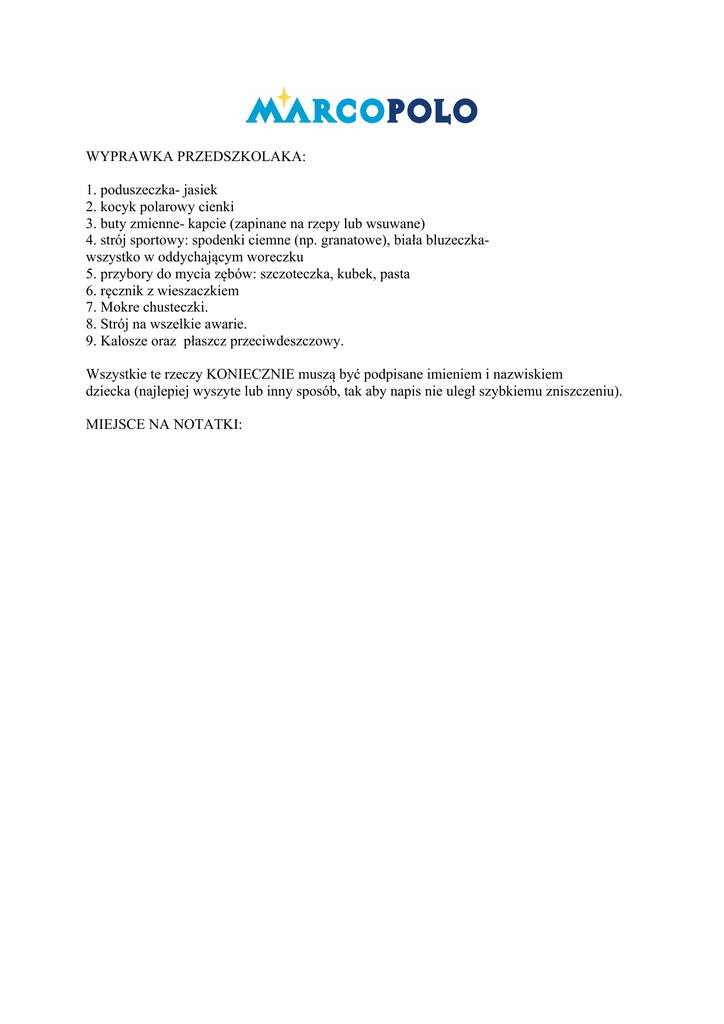 WYPRAWKA PRZEDSZKOLAKA: 1. poduszeczka- jasiek 2. kocyk polarowy cienki 3. buty zmienne- kapcie (zapinane na rzepy lub wsuwane) 4. strój sportowy: spodenki ciemne (np. granatowe), biała bluzeczkawszystko w oddychającym woreczku 5. przybory do mycia zębów: szczoteczka, kubek, pasta 6. ręcznik z wieszaczkiem 7. Mokre chusteczki. 8. Strój na wszelkie awarie. 9. Kalosze oraz płaszcz przeciwdeszczowy. Wszystkie te rzeczy KONIECZNIE muszą być podpisane imieniem i nazwiskiem dziecka (najlepiej wyszyte lub inny sposób, tak aby napis nie uległ szybkiemu zniszczeniu). MIEJSCE NA NOTATKI:
