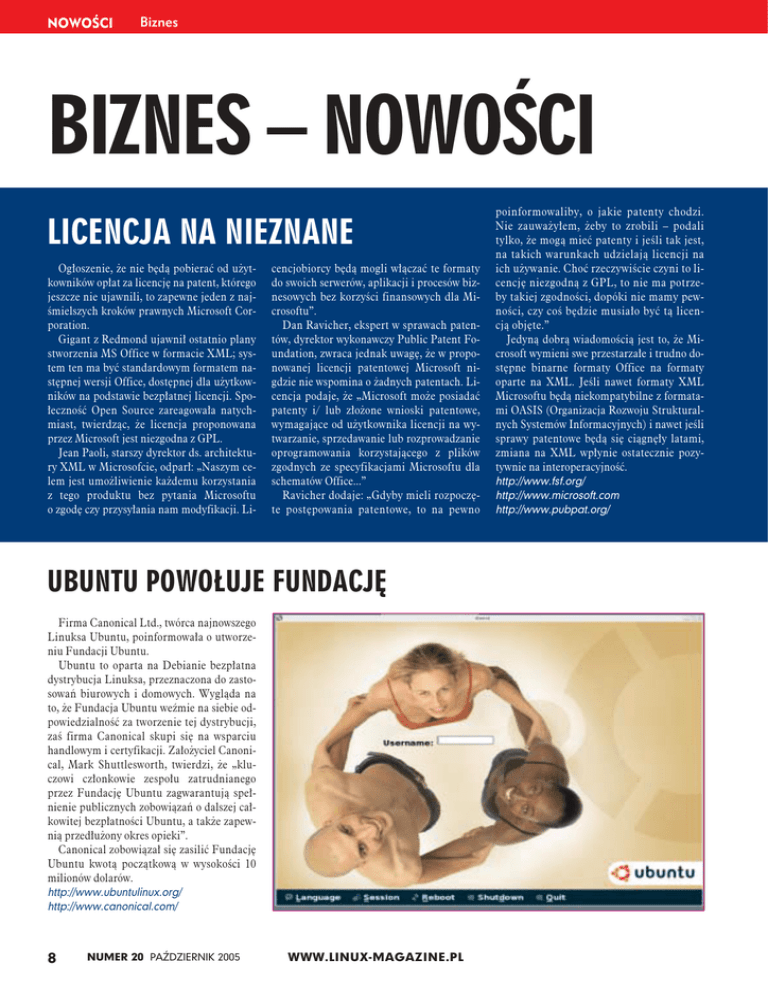 NOWOŚCI Biznes BIZNES – NOWOŚCI LICENCJA NA NIEZNANE Ogłoszenie, że nie będą pobierać od użytkowników opłat za licencję na patent, którego jeszcze nie ujawnili, to zapewne jeden z najśmielszych kroków prawnych Microsoft Corporation. Gigant z Redmond ujawnił ostatnio plany stworzenia MS Office w formacie XML; system ten ma być standardowym formatem następnej wersji Office, dostępnej dla użytkowników na podstawie bezpłatnej licencji. Społeczność Open Source zareagowała natychmiast, twierdząc, że licencja proponowana przez Microsoft jest niezgodna z GPL. Jean Paoli, starszy dyrektor ds. architektury XML w Microsofcie, odparł: „Naszym celem jest umożliwienie każdemu korzystania z tego produktu bez pytania Microsoftu o zgodę czy przysyłania nam modyfikacji. Li- cencjobiorcy będą mogli włączać te formaty do swoich serwerów, aplikacji i procesów biznesowych bez korzyści finansowych dla Microsoftu”. Dan Ravicher, ekspert w sprawach patentów, dyrektor wykonawczy Public Patent Foundation, zwraca jednak uwagę, że w proponowanej licencji patentowej Microsoft nigdzie nie wspomina o żadnych patentach. Licencja podaje, że „Microsoft może posiadać patenty i/ lub złożone wnioski patentowe, wymagające od użytkownika licencji na wytwarzanie, sprzedawanie lub rozprowadzanie oprogramowania korzystającego z plików zgodnych ze specyfikacjami Microsoftu dla schematów Office...” Ravicher dodaje: „Gdyby mieli rozpoczęte postępowania patentowe, to na pewno UBUNTU POWOŁUJE FUNDACJĘ Firma Canonical Ltd., twórca najnowszego Linuksa Ubuntu, poinformowała o utworzeniu Fundacji Ubuntu. Ubuntu to oparta na Debianie bezpłatna dystrybucja Linuksa, przeznaczona do zastosowań biurowych i domowych. Wygląda na to, że Fundacja Ubuntu weźmie na siebie odpowiedzialność za tworzenie tej dystrybucji, zaś firma Canonical skupi się na wsparciu handlowym i certyfikacji. Założyciel Canonical, Mark Shuttlesworth, twierdzi, że „kluczowi członkowie zespołu zatrudnianego przez Fundację Ubuntu zagwarantują spełnienie publicznych zobowiązań o dalszej całkowitej bezpłatności Ubuntu, a także zapewnią przedłużony okres opieki”. Canonical zobowiązał się zasilić Fundację Ubuntu kwotą początkową w wysokości 10 milionów dolarów. http://www.ubuntulinux.org/ http://www.canonical.com/ 8 NUMER 20 PAŹDZIERNIK 2005 WWW.LINUX-MAGAZINE.PL poinformowaliby, o jakie patenty chodzi. Nie zauważyłem, żeby to zrobili – podali tylko, że mogą mieć patenty i jeśli tak jest, na takich warunkach udzielają licencji na ich używanie. Choć rzeczywiście czyni to licencję niezgodną z GPL, to nie ma potrzeby takiej zgodności, dopóki nie mamy pewności, czy coś będzie musiało być tą licencją objęte.” Jedyną dobrą wiadomością jest to, że Microsoft wymieni swe przestarzałe i trudno dostępne binarne formaty Office na formaty oparte na XML. Jeśli nawet formaty XML Microsoftu będą niekompatybilne z formatami OASIS (Organizacja Rozwoju Strukturalnych Systemów Informacyjnych) i nawet jeśli sprawy patentowe będą się ciągnęły latami, zmiana na XML wpłynie ostatecznie pozytywnie na interoperacyjność. http://www.fsf.org/ http://www.microsoft.com http://www.pubpat.org/ Biznes NOWOŚCI EUROPA ODRZUCA PATENTY NA OPROGRAMOWANIE Długotrwałe usiłowania mające na celu objęcie oprogramowania ochroną patentową w Europie dobiegły (chyba) wreszcie końca 6 lipca, kiedy Parlament Europejski większością głosów zdecydował o odrzuceniu tej propozycji. 648 z 729 posłów głosowało przeciwko rozwiązaniu, które miałoby zbliżyć europejski system patentowy do stosowanego w USA. Patenty na oprogramowanie były tylko jednym z aspektów nowego systemu, ale ich sprawa stała się najbardziej kontrowersyjną częścią całej debaty. Przedstawiciele społeczności Open Source prowadzili zaciekłą kampanię przeciwko temu posunięciu, które, ich zdaniem, umożliwiłoby korporacjom z dużym budżetem prawnym zastraszanie konkurencji i ograniczanie innowacji. Stali czytelnicy tej rubryki i śledzący wiadomości ze świata techniki wiedzą, że europejska propozycja w sprawie patentów, przerzucana między Komisją Europejską a Parlamentem Europejskim, przeszła już kilka rund działań rządowych. Możliwe, że ta sama lub podobna propozycja znów powróci, choć niektórzy komisarze europejscy informowali na początku tego roku, że jeżeli zostanie odrzucona przez Parlament, nie będą występować z nią ponownie. http://www.europarl.eu.int IDZIE W GÓRĘ Dochody Red Hata w pierwszym kwartale 2005 roku przekroczyły o 46% kwotę z zeszłego roku. Zyski także idą w górę, sięgając 12,4 miliona dolarów, podczas gdy rok temu wyniosły 10,9 miliona. Liczby te zdają się potwierdzać sukces modelu sprzedaży Red Hata, opartego na sub- skrypcjach. Oparte na GPL systemy operacyjne Red Hata są w zasadzie dostępne za darmo, przez projekt Fedora lub od takich organizacji jak CentOS, która rozprowadza darmowe pełne wersje Red Hat Enterprise Linux. Niemniej jednak Red Hatowi udało się zarobić na tych systemach. Firma sprze- dała w tym kwartale 190 000 subskrypcji Linuksa – ponad dwukrotnie więcej niż w roku ubiegłym. http://www.redhat.com MANDRIVA DALEJ SIĘ ŁĄCZY Mandriva poinformowała o podpisaniu umowy na nabycie „części udziałów” Lycoris, twórców dystrybucji Lycoris Desktop/ LX. Lycoris to dystrybucja biurkowa, przeznaczona głównie do zastosowań domowych, zaś Mandriva sama jest owocem połączenia firm linuksowych Mandrakesoft i Conectiva. Połączenie z Lycoris da Mandrivie przewagę na powstającym rynku Linuksa dla użytkowników domowych. Lycoris jest znany z takich innowacji jak edycja Pocket PC, a najcenniejszym dla Mandrivy produktem Lycoris może być Iris Software Gallery, sieciowe narzędzie instalacji oprogramowania, które umożliwi Mandrivie stawanie w szranki z podobnym narzędziami ta