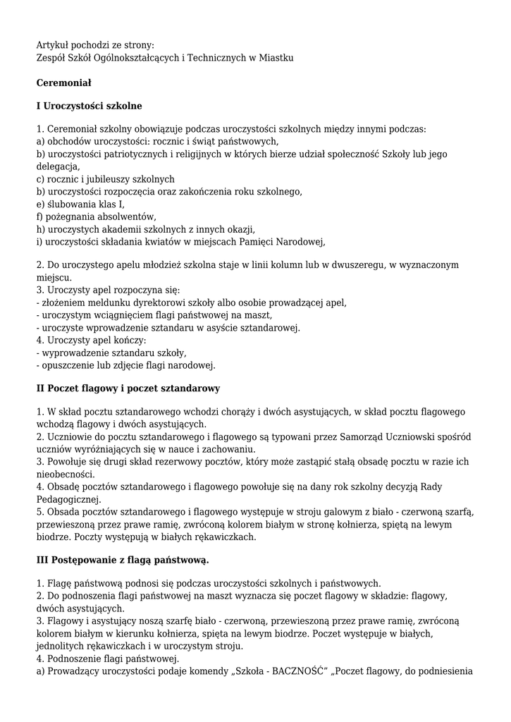 Artykuł pochodzi ze strony: Zespół Szkół Ogólnokształcących i Technicznych w Miastku Ceremoniał I Uroczystości szkolne 1. Ceremoniał szkolny obowiązuje podczas uroczystości szkolnych między innymi podczas: a) obchodów uroczystości: rocznic i świąt państwowych, b) uroczystości patriotycznych i religijnych w których bierze udział społeczność Szkoły lub jego delegacja, c) rocznic i jubileuszy szkolnych b) uroczystości rozpoczęcia oraz zakończenia roku szkolnego, e) ślubowania klas I, f) pożegnania absolwentów, h) uroczystych akademii szkolnych z innych okazji, i) uroczystości składania kwiatów w miejscach Pamięci Narodowej, 2. Do uroczystego apelu młodzież szkolna staje w linii kolumn lub w dwuszeregu, w wyznaczonym miejscu. 3. Uroczysty apel rozpoczyna się: - złożeniem meldunku dyrektorowi szkoły albo osobie prowadzącej apel, - uroczystym wciągnięciem flagi państwowej na maszt, - uroczyste wprowadzenie sztandaru w asyście sztandarowej. 4. Uroczysty apel kończy: - wyprowadzenie sztandaru szkoły, - opuszczenie lub zdjęcie flagi narodowej. II Poczet flagowy i poczet sztandarowy 1. W skład pocztu sztandarowego wchodzi chorąży i dwóch asystujących, w skład pocztu flagowego wchodzą flagowy i dwóch asystujących. 2. Uczniowie do pocztu sztandarowego i flagowego są typowani przez Samorząd Uczniowski spośród uczniów wyróżniających się w nauce i zachowaniu. 3. Powołuje się drugi skład rezerwowy pocztów, który może zastąpić stałą obsadę pocztu w razie ich nieobecności. 4. Obsadę pocztów sztandarowego i flagowego powołuje się na dany rok szkolny decyzją Rady Pedagogicznej. 5. Obsada pocztów sztandarowego i flagowego występuje w stroju galowym z biało - czerwoną szarfą, przewieszoną przez prawe ramię, zwróconą kolorem białym w stronę kołnierza, spiętą na lewym biodrze. Poczty występują w białych rękawiczkach. III Postępowanie z flagą państwową. 1. Flagę państwową podnosi się podczas uroczystości szkolnych i państwowych. 2. Do podnoszenia flagi państwowej na maszt wyznacza się poczet flagowy w składzie: flagowy, dwóch asystujących. 3. Flagowy i asystujący noszą szarfę biało - czerwoną, przewieszoną przez prawe ramię, zwróconą kolorem białym w kierunku kołnierza, spięta na lewym biodrze. Poczet występuje w białych, jednolitych rękawiczkach i w uroczystym stroju. 4. Podnoszenie flagi państwowej. a) Prowadzący uroczystości podaje komendy „Szkoła - BACZNOŚĆ” „Poczet flagowy, do podniesienia flagi państwowej - MASZEROWAĆ”. b) Poczet występuje i maszeruje w kierunku masztu. c) Flagowy, po dojściu do masztu, trzyma flagę, a jeden asystujący przymocowuje ją do linki. d) Prowadzący uroczystość podaje polecenie „Do hymnu państwowego”. (Wciąganie flagi państwowej powinno trwać do momentu zakończenia hymnu narodowego). e) Prowadzący uroczystość wydaje komendę „Poczet flagowy ODMASZEROWAĆ, Szkoła SPOCZNIJ”. 5. Opuszczenie flagi. a) Opuszczenie i zdjęcie flagi państwowej odbywa się po zakończeniu uroczystości. b) Opuszczenie flagi odbywa się w asyście pocztu flagowego. c) Prowadzący apel wydaje polecenie: „Szkoła -BACZNOŚĆ! Poczet flagowy do opuszczenia flagi państwowej, MASZEROWAĆ!”. d) Poczet maszeruje do masztu, flagowy opuszcza flagę. e) Asystujący składa flagę i układa na rękach flagowego. f) Po złożeniu flagi prowadzący uroczystość podaje komendę „Poczet flagowy – WSTĄP”, a po zajęciu miejsca przez poczet komendę „Szkoła - SPOCZNIJ”. IV Sztandar szkoły 1. Zespół Szkół Ponadgimnazjalnych w Miastku posiada własny sztandar, poświęcony w dniu 04.09.2006 r. 2. Sztandar jest symbolem tradycji polskiej szkoły, miłości do Ojczyzny i idei zawartych w Statucie Szkoły. 3. Uczniowie, ich rodzice i nauczyciele otaczają sztandar szacunkiem, oddając mu należne honory. 4. W przypadku żałoby narodowej lub na wniosek Dyrektora szkoły, na drzewcu sztandaru przypina się od strony godła państwowego kokardę z czarnej wstążki. V Postępowanie ze sztandarem Szkoły 1. Wprowadzenie sztandaru a) Prowadzący uroczystość szkolną wydaje polecenie „Szkoła - BACZNOŚĆ, poczet sztandarowy, sztandar szkoły – WPROWADZIĆ”, b) Sztandar wprowadzany jest w postawie „Na ramię”, c) po zajęciu wyznaczonego miejsca przez poczet sztandarowy prowadzący uroczystość podaje komendę „szkoła - SPOCZNIJ”. 2. Odprowadzanie sztandaru Szkoły. a) Przed zakończeniem uroczystości prowadzący wydaje komendę „Szkoła - BACZNOŚĆ, poczet sztandarowy, sztandar szkoły - ODPROWADZIĆ”. b) Poczet sztandarowy odprowadza sztandar do miejsca przechowania. c) Po opuszczeniu placu miejsca apelu przez poczet prowadzący uroczystość podaje komendę „Szkoła – SPOCZNIJ”. 3. Postępowanie w czasie ślubowania: a) Prowadzący podaje komendę „Szkoła - BACZNOŚĆ, poczet sztandarowy do ślubowania - WYSTĄP” b) Poczet zajmuje wyznaczone miejsce, a flagowy wykonuje chwyt do nogi. c) Prowadzący uroczystość podaje komendę „Uczniowie delegowani do ślubowania - WYSTĄP. d) Delegowani uczniowie podchodzą do sztandaru szkoły i zajmują wyznaczone miejsca. e) Prowadzący uroczystość podaje komendę "Do - ŚLUBOWANIA", poczet sztandarowy opuszcza sztandar jak do salutowania, po czym następuje odczytanie rotę ślubowania. f) Po zakończeniu ślubowania prowadzący uroczystość wydaje komendy „Delegowani uczniowie – WSTĄP”, „Poczet sztandarowy – WSTĄP”, „Szkoła - SPOCZNIJ” VI Chwyty sztandarem 1. W postawie zasadniczej sztandarowy trzyma sztandar przy prawej nodze, na wysokości czubka buta, postawiony na ,,stopce'' drzewca. Drzewce przytrzymuje prawą ręką na wysokości pasa. 2. Sztandarem wykonuje się następujące chwyty: A. "Na ramię", B. "Prezentuj", C. "Do nogi". 3. Wykonując chwyt "Na ramię", chorąży prawą ręką (pomagając sobie lewą) kładzie drzewce na p