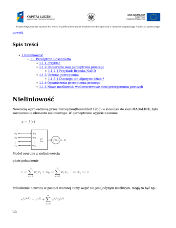 powrót Spis treści 1 Nieliniowość 1.1 Perceptron Rosenblatta 1.1.1 Przykład 1.1.2 Dobieranie wag perceptronu prostego 1.1.2.1 Przykład: Bramka NAND 1.1.3 Uczenie perceptronu 1.1.3.1 Dlaczego ten algorytm działa? 1.1.4 Ograniczenia perceptronu prostego 1.1.5 Nowe możliwości: wielowarstwowe sieci perceptronów prostych Nieliniowość Nowością wprowadzoną przez Perceptron(Rosenblatt 1958) w stosunku do sieci MADALINE, było zastosowanie elementu nieliniowego. W perceptronie wyjście neuronu: Model neuronu z nieliniowością gdzie pobudzenie Pobudzenie neuronu w postaci ważonej sumy wejść nie jest jedynym możliwym, mogą to być np.: lub Dla własności neuronu największe znaczenie ma jednak forma nieliniowości . Perceptron Rosenblatta Najprostsza pojęciowo postać nieliniowości: Nieliniowa funkcja aktywacji w perceptronie Rosenblatta Interpretacja geometryczna: perceptron prosty działa jak dyskryminator liniowy. Obszar, w którym perceptron zwraca 1 — podejmuje decyzję tak jest ograniczony tworem o równaniu: Dla n = 2 jest to prosta, dla n = 3 płaszczyzna, w ogólności rozmaitość liniowa stopnia n − 1 hiperpłaszczyzna. Przykład Rozważmy perceptron z trzema wagami pobudzenie neuronu: Podział przestrzeni wejść na podprzestrzenie odpowiadające klasyfikacji jako "0" bądź "1" We właściwej przestrzeni wejść(tzn. równaniu: ) hiperpowierzchnia podejmowania decyzji jest prostą o Obcięty wektor wag jest prostopadły do prostej podejmowania decyzji. Wektor wag jest skierowany w stronę, gdzie y = 1. Dobieranie wag perceptronu prostego Wagi perceptronu prostego można dobrać na dwa sposoby: możemy obliczyć wagi neuronów lub znaleźć je w procesie iteracyjnego uczenia. Obliczanie Korzystamy z tego, że wektor w jest ortogonalny do hiperpłaszczyzny podejmowania decyzji, zatem musi spełniać równanie: także "obcięty" wektor wag jest ortogonalny do "obciętych" wektorów wejściowych bo: zatem Aby powyższa równość zachodziła musi zachodzić: Przykład: Bramka NAND Obliczmy wagi perceptronu realizującego funkcję logiczną NAND. Jej tabela wartości logicznych jest następująca: 0011 0101 1110 Spójrzmy na reprezentację graficzną: Reprezentacja graficzna funkcji NAND Można zaproponować następującą prostą podejmowania decyzji: wektor wag jest prostopadły do tej prostej i skierowany w stronę gdzie , więc: i wybieramy . Ostatecznie Uczenie perceptronu Algorytm uczenia perceptronu jest formalnie bardzo podobny do algorytmu spadku gradientowego. Mamy ciąg uczący: Ilustracja zmiany wag perceptronu zgodnie z regułą "delta" i regułę zmiany wag po zaprezentowaniu j-tego przykładu (reguła ta nazywana jest "regułą delta"): gdzie jest błędem perceptronu dla j-tego przykładu: Istotną różnicę stanowi fakt, że: , a co za tym idzie błąd może przyjmować tylko wartości dyskretne: Dlaczego ten algorytm działa? Ponieważ wejścia i wyjścia mogą przyjmować tylko kilka wartości możemy prześledzić wszystkie przypadki. Są tylko 4 możliwości zmiany wag: wkład do pobudzenia od i-tej współrzędnej po korekcie wag 0 0 0 (dobrze) 0 bez zmian 1 1 0 (dobrze) 0 bez zmian 0 1 -1 (odpowiedź za duża) 1 0 1 (odpowiedź za mała) Widać, że zawsze zmiana wagi (o ile nie jest zbyt duża) prowadzi w taką stronę aby po ponownym podaniu tego samego przykładu odpowiedź była bliższa pożądanej. Kod symulujący przykładowy perceptron prosty # -*- coding: utf-8 -*import numpy as np import pylab as py import matplotlib.animation as animation class Perceptron(object): """Perceptron Rosenblatta""" def __init__(self, w, w0): self.w = np.array(w) self.w0 = np.array(w0) self.first_plot = True def ucz(self, X, Z, eta): delta = Z - self.licz(X) self.w += eta*delta*X self.w0 += eta*delta return delta def licz(self, X): e = np.sum(self.w*X) + self.w0 if e >= : y = 1 else: y= return y def rysuj(data): linia.set_ydata(data) return linia, def licz_wynik(): global p, x, X, Z delta=1 y = np.zeros(len(x)) #while delta > 0: delta = for j in range(len(X)): d = p.ucz( X[j,:], Z[j], eta) # uczymy neuron j-tego elementu w ciagu uczacym delta += np.abs(d) # sumujemy wartosci bezwzgledne bladow y[] = (-p.w[]*x[] - p.w0) / p.w[1] y[1] = (-p.w[]*x[1] - p.w0) / p.w[1] print 'zla klasyfikacja ' +str(delta) +' na '+ str(len(Z)) + ' punktow ' yield y p = Perceptron(w = [0.1, 0.6], w0 = -0.4 ) eta=0.1 X=np.array([[1, 1], [3, 3],[4,1],[2, 3], [3, 4], [1.2, 3.2]]) Z=np.array([1, 1,1, , , , ]) xmin=-5 xmax=5 red = np.where( Z> ) blue = np.where( Z<=) fig1 = py.figure(1) py.plot(X[blue,], X[blue,1],'bo' , X[red, ], X[red,1] ,'ro') py.xlim([xmin-2, xmax+2]) py.ylim([-2,5+2]) x = np.array([xmin, xmax]) y = (-p.w[]*x - p.w0) / p.w[1] linia, = py.plot(x,y) line_ani = animation.FuncAnimation(fig1, rysuj, licz_wynik, blit=True,repeat=False) interval=100)#, py.show() Ograniczenia perceptronu prostego Ograniczeniem perceptronu prostego jest fakt, że za jego pomocą można rozwiązać tylko problemy separowalne liniowo. Co to oznacza zobaczmy na poniższym przykładzie: Ilustracja problemu, który jest (AND) i nie jest (XOR) separowalny liniowo Nowe możliwości: wielowarstwowe sieci perceptronów prostych Co dwie warstwy neuronów nieliniowych to nie jedna :-) Jedna warstwa perceptronów prostych na swoim wyjściu prezentuje zestaw podziałów przestrzeni hiperpłaszczyznami - każdy neuron jeden podział. Co się stanie jeśli wyjście tej warstwy wpuścimy na wejście następnej warstwy? Przykładowe rozwiązanie problemu XOR przez dwie warstwy perceptronów prostych Problem znalezienia wag w ogólności nie jest tu prosty. Dla XOR można go zapisać następująco: