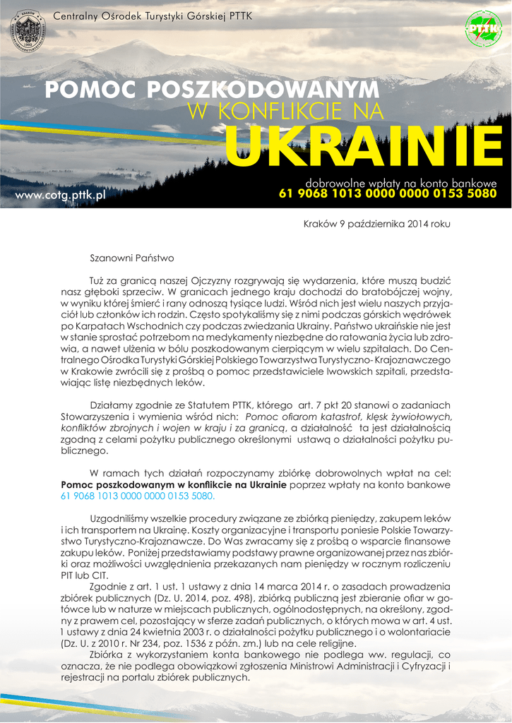 ‚ Centralny Osrodek Turystyki Górskiej PTTK pomoc poszkodowanym w konflikcie na UKRAINIE www.cotg.pttk.pl dobrowolne wpłaty na konto bankowe 61 9068 1013 0000 0000 0153 5080 Kraków 9 października 2014 roku Szanowni Państwo Tuż za granicą naszej Ojczyzny rozgrywają się wydarzenia, które muszą budzić nasz głęboki sprzeciw. W granicach jednego kraju dochodzi do bratobójczej wojny, w wyniku której śmierć i rany odnoszą tysiące ludzi. Wśród nich jest wielu naszych przyjaciół lub członków ich rodzin. Często spotykaliśmy się z nimi podczas górskich wędrówek po Karpatach Wschodnich czy podczas zwiedzania Ukrainy. Państwo ukraińskie nie jest w stanie sprostać potrzebom na medykamenty niezbędne do ratowania życia lub zdrowia, a nawet ulżenia w bólu poszkodowanym cierpiącym w wielu szpitalach. Do Centralnego Ośrodka Turystyki Górskiej Polskiego Towarzystwa Turystyczno- Krajoznawczego w Krakowie zwrócili się z prośbą o pomoc przedstawiciele lwowskich szpitali, przedstawiając listę niezbędnych leków. Działamy zgodnie ze Statutem PTTK, którego art. 7 pkt 20 stanowi o zadaniach Stowarzyszenia i wymienia wśród nich: Pomoc ofiarom katastrof, klęsk żywiołowych, konfliktów zbrojnych i wojen w kraju i za granicą, a działalność ta jest działalnością zgodną z celami pożytku publicznego określonymi ustawą o działalności pożytku publicznego. W ramach tych działań rozpoczynamy zbiórkę dobrowolnych wpłat na cel: Pomoc poszkodowanym w konflikcie na Ukrainie poprzez wpłaty na konto bankowe 61 9068 1013 0000 0000 0153 5080. Uzgodniliśmy wszelkie procedury związane ze zbiórką pieniędzy, zakupem leków i ich transportem na Ukrainę. Koszty organizacyjne i transportu poniesie Polskie Towarzystwo Turystyczno-Krajoznawcze. Do Was zwracamy się z prośbą o wsparcie finansowe zakupu leków. Poniżej przedstawiamy podstawy prawne organizowanej przez nas zbiórki oraz możliwości uwzględnienia przekazanych nam pieniędzy w rocznym rozliczeniu PIT lub CIT. Zgodnie z art. 1 ust. 1 ustawy z dnia 14 marca 2014 r. o zasadach prowadzenia zbiórek publicznych (Dz. U. 2014, poz. 498), zbiórką publiczną jest zbieranie ofiar w gotówce lub w naturze w miejscach publicznych, ogólnodostępnych, na określony, zgodny z prawem cel, pozostający w sferze zadań publicznych, o których mowa w art. 4 ust. 1 ustawy z dnia 24 kwietnia 2003 r. o działalności pożytku publicznego i o wolontariacie (Dz. U. z 2010 r. Nr 234, poz. 1536 z późn. zm.) lub na cele religijne. Zbiórka z wykorzystaniem konta bankowego nie podlega ww. regulacji, co oznacza, że nie podlega obowiązkowi zgłoszenia Ministrowi Administracji i Cyfryzacji i rejestracji na portalu zbiórek publicznych. Nazwa naszej zbiorki: Pomoc poszkodowanym w konflikcie na Ukrainie Sposób zbiórki: dobrowolne wpłaty na konto bankowe 61 9068 1013 0000 0000 0153 5080 Nasz adres: Centralny Ośrodek Turystyki Górskiej PTTK ul. Jagiellońska 6 31-010 Kraków Darowizny od osób fizycznych: Zapisy Ustawy o podatku od osób fizycznych (art. 26 ust. 1 pkt 9) dotyczące możliwości odliczenia darowizny od podatku dochodowego (od 01.01.2004 r.) określają, iż można odliczyć darowizny: 1. przekazane na cele zawierające się w sferze zadań publicznych (określone w art. 4 ustawy z dnia 24 kwietnia 2003 r. o działalności pożytku publicznego i wolontariacie), - organizacjom, (m.in. stowarzyszeniom i fundacjom), o których mowa w art. 3 ust. 2 i 3 tej ustawy, - prowadzącym działalność pożytku publicznego w sferze zadań publicznych (niekoniecznie posiadającym status organizacji pożytku publicznego) określonych w tej ustawie. 2. przekazane na cele kultu religijnego Od podstawy opodatkowania można odliczyć darowizny w kwocie nie wyższej niż 6% uzyskanego dochodu. Należy pamiętać, iż w przypadku gdy przedmiotem darowizny są pieniądze, to powinna ona być udokumentowana dowodem wpłaty na rachunek bankowy obdarowanej organizacji. Zaś w przypadku darowania rzeczy lub usług - dokumentem potwierdzającym przekazanie tej darowizny oraz dokumentami potwierdzającymi faktyczne wydatki związane z tą darowizną. Darowizny od osób prawnych: Zapisy ustawy o podatku dochodowym od osób prawnych (art. 18 ust 1 pkt 1 i 7) dotyczące możliwości odliczenia darowizny od podatku dochodowego (od 01.01.2004 r.) określają, iż można odliczyć darowizny: 1. przekazane na cele zawierające się w sferze zadań publicznych (określone w art. 4 ustawy z dnia 24 kwietnia 2003 r. o działalności pożytku publicznego i wolontariacie), - organizacjom, (m.in. stowarzyszeniom i fundacjom) o których mowa w art. 3 ust. 2 i 3 tej ustawy, - prowadzącym działalność pożytku publicznego w sferze zadań publicznych określonych w tej ustawie. 2. przekazane na cele kultu religijnego Od podstawy opodatkowania można odliczyć darowizny w kwocie nie wyższej niż 10% uzyskanego dochodu. Należy pamiętać, iż w przypadku gdy przedmiotem darowizny są pieniądze, to powinna ona być udokumentowana dowodem wpłaty na rachunek bankowy obdarowanej organizacji. Zaś w przypadku darowania rzeczy lub usług - dokumentem potwierdzającym przekazanie tej darowizny oraz dokumentami potwierdzającymi faktyczne wydatki związane z tą darowizną.