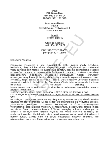 Firma: P.H. Nowa Fala NIP: 929 114 84 84 REGON: 971 299 300 Dane kontaktowe: X-SIDE Drzonków, ul. Rydwanowa 1 66-004 Racula −E Obsługa Klienta: +48 534 96 55 62 U E-mail: [email protected] DNI I GODZINY PRACY: pon-pt 9:00 – 16:00 Szanowni Państwo, X− SI DE Czerpiemy inspirację z ulic europejskich stolic świata mody Londynu, Mediolanu, Paryża i Barcelony. Współpracujemy z oficjalnymi dystrybutorami wielu europejskich marek, co gwarantuje państwu legalne pochodzenie i jakość produktów podaną w najnowszych światowych trendach. Ponieważ jesteśmy bezpośrednim importerem większości oferowanych marek, oferujemy atrakcyjne ceny kolekcji. Nasze ubrania są starannie wyselekcjonowane przez stylistów, dzięki czemu są zawsze na czasie. Dzięki naszym ubraniom będziesz wyglądał modnie i nie jak każdy. Oferujemy Ci nie tylko ubrania ale i gotowe inspiracje do ciekawych stylizacji. Nasza propozycja to coś więcej niż ubrania, to najnowsza europejska moda w zasięgu Twojej ręki... Jesteśmy pasjonatami mody, jesteśmy X-SIDE. Stań się jednym z nas. Do każdego zamówienia dołączamy paragon fiskalny lub na życzenie fakturę VAT. Na aukcjach podajemy dokładne wymiary rzeczy – orientacyjny obwód można uzyskać mnożąc szerokość x2. Na każdej aukcji znajdują się wszystkie zdjęcia, jakie otrzymujemy wraz z towarem. Ze względu na różne charakterystyki wyświetlania obrazu przez monitory komputerowe, pokazywane zdjęcia mogą się nieco różnić odcieniem koloru. Różnice pomiędzy kolorem widzianym na ekranie a rzeczywistym kolorem wyrobu nie może stanowić podstawy do reklamacji wyrobu. Kontaktując się z nami prosimy podać swój nick Allegro i numer aukcji. Zależy nam na 100% satysfakcji naszych klientów. Nie odpowiadamy na smsy. Nie przyjmujemy przesyłek pobraniowych. −E U Wysyłka towaru: Towar jest wysyłany niezwłocznie po zaksięgowaniu wpłaty na naszym koncie. Maksymalnie do 3 dni roboczych od momentu księgowania zapłaty. Jednak w przypadku zaistnienia nieprzewidzianych zdarzeń losowych zastrzegamy sobie prawo do wysyłki towaru w ciągu 5 dni roboczych. Niestety z przyczyn logistycznych nie można odebrać towaru osobiście. Przesyłki są odbierane przez kuriera od poniedziałku do piątku do godziny 14.00. !!!Ważne: przy odbiorze przesyłki należy w przypadku widocznego uszkodzenia/ np. naruszenia opakowania, przemoczenia itp./ opakowania zatrzymać kuriera w celu sporządzenia przez niego protokołu szkody. Przesyłki powinny dotrzeć do państwa w stanie nienaruszonym zazwyczaj w następnym dniu roboczym po dniu nadania. Zamówienia są wysyłane na adres klienta podany w serwisie Allegro. Zmianę adresu wysyłki proszę podać w „Formularzu Opcji Dostawy” i w treści przelewu. Koszt przesyłki : 1 przedmiot 12zł, więcej niż jeden przedmiot w jednej przesyłce 12zł do 5kg, pobranie 19zł do 5 kg. Płatności: DE Wszelkie ceny podane na naszych aukcjach są cenami brutto i zawierają podatek VAT. SI Płatność przelewem na konto: Aby uniknąć zwielokrotnionych kosztów przesyłki prosimy przesłać jeden łączny przelew powiększony o koszt przesyłki zależny od ilości zakupionych sztuk towarów. Prosimy nie przesyłać płatności za inne aukcje w osobnych przelewach bez kosztów przesyłki - każdy przelew musi zawierać koszt przesyłki. X− !!!WAŻNE:w treści przelewu proszę podać numer aukcji oraz nick Allegro. Brak tych danych może spowodować opóźnienie w realizacji zamówienia. Dane do przelewu: Bank BPH S.A. 65-10600076-0000330000661511 P.H. Nowa Fala ul. X. Dunikowskiego 28 65-140 Zielona Góra Na wpłaty czekamy do 7 dni kalendarzowych. Upływ tego terminu wiąże się z koniecznością wystąpienia przez X-SIDE do Allegro o zwrot pobranej prowizji za sprzedany a nieopłacony towar. Wysyłka płatna przy odbiorze (za pobraniem): Wybierając ten sposób zapłaty za przesyłkę zapłacicie państwo przy odbiorze kurierowi. W przypadku gdy kurier nie zastanie nikogo pod wskazanym adresem powinien pozostawić awizo do odbioru przesyłki lub skontaktować się z państwem telefonicznie. Przy wyborze tej opcji dostawy prosimy o informację przesłaną do nas na maila [email protected]. Uwaga! Za pobraniem wysyłamy jeśli nabywca posiada min. 15 pozytywów. Zwrot U Zastrzegamy sobie przyjęcia zwrotu towaru wyłącznie z zakupów dokonanych przez „ Kup Teraz”. Zakupiony towar można zwrócić w ciągu 10 dni d dnia otrzymania przesyłki bez podawania przyczyny. Zwracany towar oraz opakowanie muszą być w identycznym stanie jak przy otrzymaniu przesyłki. Aby zwrócić towar należy odesłać go Pocztą Polską lub wybraną przez siebie firmą kurierską opłacając wysyłkę „z góry” na dane: −E P.H. Nowa Fala Drzonków, ul. Rydwanowa 1 66-004 Racula z dopiskiem X-SIDE Formularz zwrotu.jpg Formularz zwrotu.pdf DE wraz z wypełnionym i załączonym do przesyłki formularzem zwrotu oraz dokumentem zakupu (paragon/faktura). X− SI Zwroty wynikające z różnicy w wyglądzie towarów zamówionych z otrzymanymi, która wynika z ustawień parametrów monitora komputerowego nie będą uwzględniane. Towary używane i zakupione w drodze licytacji nie podlegają zwrotowi. Zwrot pieniędzy realizowany jest niezwłocznie w terminie do 14 dni roboczych od daty otrzymania przesyłki (podstawa prawna: Ustawa o ochronie niektórych praw konsumentów oraz o odpowiedzialności za szkodę wyrządzoną przez produkt niebezpieczny z dnia 2 marca 2000r. Dz.U.Nr 22 poz 217 z późniejszymi zmianami). Zastrzegamy sobie prawo do odrzucenia zwrotów wysłanych po ustalonym terminie lub zwrotów towaru, które nie są w takim samym stanie jak przy ich otrzymaniu tj. nowe, nieużywane, z kompletem metek, zapakowane w sposób w jakim zostały dostarczone dot. opakowania firmowego producenta. Reklamacje Reklamacje towaru: Podstawą wszczęcia procedury reklamacyjnej jest przesłanie do nas czystego reklamowanego towar