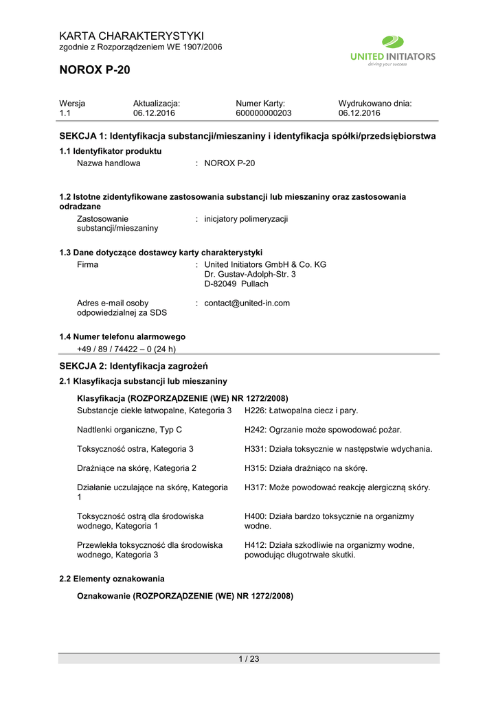 KARTA CHARAKTERYSTYKI zgodnie z Rozporządzeniem WE 1907/2006 NOROX P-20 Wersja 1.1 Aktualizacja: 06.12.2016 Numer Karty: 600000000203 Wydrukowano dnia: 06.12.2016 SEKCJA 1: Identyfikacja substancji/mieszaniny i identyfikacja spółki/przedsiębiorstwa 1.1 Identyfikator produktu Nazwa handlowa : NOROX P-20 1.2 Istotne zidentyfikowane zastosowania substancji lub mieszaniny oraz zastosowania odradzane Zastosowanie : inicjatory polimeryzacji substancji/mieszaniny 1.3 Dane dotyczące dostawcy karty charakterystyki Firma : United Initiators GmbH & Co. KG Dr. Gustav-Adolph-Str. 3 D-82049 Pullach Adres e-mail osoby odpowiedzialnej za SDS : [email protected] 1.4 Numer telefonu alarmowego +49 / 89 / 74422 – 0 (24 h) SEKCJA 2: Identyfikacja zagrożeń 2.1 Klasyfikacja substancji lub mieszaniny Klasyfikacja (ROZPORZĄDZENIE (WE) NR 1272/2008) Substancje ciekłe łatwopalne, Kategoria 3 H226: Łatwopalna ciecz i pary. Nadtlenki organiczne, Typ C H242: Ogrzanie może spowodować pożar. Toksyczność ostra, Kategoria 3 H331: Działa toksycznie w następstwie wdychania. Drażniące na skórę, Kategoria 2 H315: Działa drażniąco na skórę. Działanie uczulające na skórę, Kategoria 1 H317: Może powodować reakcję alergiczną skóry. Toksyczność ostrą dla środowiska wodnego, Kategoria 1 H400: Działa bardzo toksycznie na organizmy wodne. Przewlekła toksyczność dla środowiska wodnego, Kategoria 3 H412: Działa szkodliwie na organizmy wodne, powodując długotrwałe skutki. 2.2 Elementy oznakowania Oznakowanie (ROZPORZĄDZENIE (WE) NR 1272/2008) 1 / 23 KARTA CHARAKTERYSTYKI zgodnie z Rozporządzeniem WE 1907/2006 NOROX P-20 Wersja 1.1 Aktualizacja: 06.12.2016 Numer Karty: 600000000203 Piktogramy określające rodzaj zagrożenia : Hasło ostrzegawcze : Niebezpieczeństwo Zwroty wskazujące rodzaj zagrożenia : H226 H242 H315 H317 H331 Łatwopalna ciecz i pary. Ogrzanie może spowodować pożar. Działa drażniąco na skórę. Może powodować reakcję alergiczną skóry. Działa toksycznie w następstwie wdychania. Działa bardzo toksycznie na organizmy wodne, powodując długotrwałe skutki. H410 Zwroty wskazujące środki ostrożności : Wydrukowano dnia: 06.12.2016 Zapobieganie: P210 P220 P233 P235 P260 P261 P262 P273 P280 Reagowanie: P315 P333 + P313 P362 + P364 Przechowywać z dala od źródeł ciepła, gorących powierzchni, iskrzenia, otwartego ognia i innych źródeł zapłonu. Palenie wzbronione. Trzymać/przechowywać z dala od odzieży/ kwasów, zasad, soli metali ciężkich i substancji redukujących /materiałów zapalnych. Przechowywać pojemnik szczelnie zamknięty. Przechowywać w chłodnym miejscu. Nie wdychać pyłu/ dymu/ gazu/ mgły/ par/ rozpylonej cieczy. Unikać wdychania pyłu/ dymu/ gazu/ mgły/ par/ rozpylonej cieczy. Nie wprowadzać do oczu, na skórę lub na odzież. Unikać uwolnienia do środowiska. Stosować rękawice ochronne/ odzież ochronną/ ochronę oczu/ ochronę twarzy. Natychmiast zasięgnąć porady/ zgłosić się pod opiekę lekarza. W przypadku wystąpienia podrażnienia skóry lub wysypki: Zasięgnąć porady/ zgłosić się pod opiekę lekarza. Zanieczyszczoną odzież zdjąć i wyprać przed ponownym użyciem. Magazynowanie: P403 + P235 Przechowywać w dobrze wentylowanym miejscu. Przechowywać w chłodnym miejscu. Usuwanie: P501 Zawartość/ pojemnik usuwać do autoryzowanego zakładu utylizacji odpadów. 2 / 23 KARTA CHARAKTERYSTYKI zgodnie z Rozporządzeniem WE 1907/2006 NOROX P-20 Wersja 1.1 Aktualizacja: 06.12.2016 Numer Karty: 600000000203 Wydrukowano dnia: 06.12.2016 Niebezpieczne składniki muszą być wymienione na etykiecie: Nadbenzoesan butylu trzeciorzędowego (Nr CAS 614-45-9) 2.3 Inne zagrożenia Ta substancja/mieszanina nie zawiera składników uważanych albo za trwałe, podlegające bioakumulacji i toksyczne, albo bardzo trwałe i podlegające bardzo silnej bioakumulacji (vPvB) na poziomie 0,1% bądź powyżej. Pary mogą tworzyć z powietrzem mieszaninę wybuchową. SEKCJA 3: Skład/informacja o składnikach 3.2 Mieszaniny Typ związku : Nadtlenek organiczny Mieszanina w postaci ciekłej Składniki niebezpieczne Nazwa Chemiczna Nadbenzoesan butylu trzeciorzędowego Acetyloaceton Nr CAS Nr WE Numer rejestracji 614-45-9 210-382-2 01-2119513317-46 123-54-6 204-634-0 01-2119458968-15 Klasyfikacja Stężenie (% w/w) Org. Perox. C; H242 Acute Tox. 4; H332 Skin Irrit. 2; H315 Skin Sens. 1A; H317 Aquatic Acute 1; H400 Aquatic Chronic 3; H412 Flam. Liq. 3; H226 Acute Tox. 4; H302 Acute Tox. 3; H331 Acute Tox. 3; H311 >= 75 - < 80 >= 20 - < 25 Wyjaśnienia skrótów znajdują się w sekcji 16. SEKCJA 4: Środki pierwszej pomocy 4.1 Opis środków pierwszej pomocy Informacje ogólne : Usunąć z zagrożonej strefy. Przedstawić lekarzowi dołączoną Kartę Charakterystyki Substancji Niebezpiecznej. Nie pozostawiać osoby poszkodowanej bez opieki. Objawy mogą się pojawić dopiero w kilka godzin po zatruciu. Nie stosować sztucznego oddychania usta-usta lub usta-nos. Stosować odpowiedni aparat. Natychmiast powiadomić lekarza. Zabezpieczenie dla udzielającego pierwszej pomocy : Osoby udzielające pierwszej pomocy powinny zwracać uwagę na własną ochronę osobistą i nosić odzież ochronną W przypadku wdychania : Natychmiast wezwać lekarza lub powiadomić centrum zatruć. Osobie nieprzytomnej zapewnić wygodną pozycję i zasięgnąć 3 / 23 KARTA CHARAKTERYSTYKI zgodnie z Rozporządzeniem WE 1907/2006 NOROX P-20 Wersja 1.1 Aktualizacja: 06.12.2016 Numer Karty: 600000000203 Wydrukowano dnia: 06.12.2016 porady medycznej. Zachować drożność dróg oddechowych. Natychmiast powiadomić lekarza. Jeżeli osoba poszkodowana oddycha, przenieść na świeże powietrze. Skontaktować się z centrum zatruć. W przypadku kontaktu ze skórą : W razie kontaktu, niezwłocznie spłukiwać skórę dużą ilością wody przez co najmniej 15 minut przy zdjętym zanieczyszczonym ubraniu i obuwiu. Uprać skażone ubranie przed ponownym użyciem.