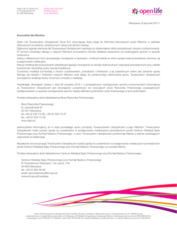 Open Life TU Życie S.A. ul. Przyokopowa 33 01-208 Warszawa infolinia 801 222 333 [email protected] www.openlife.pl Warszawa, 9 stycznia 2017 r. Komunikat dla Klientów Open Life Towarzystwo Ubezpieczeń Życie S.A. przywiązuje dużą wagę do informacji kierowanych przez Klientów w zakresie oferowanych produktów, świadczonych usług oraz jakości obsługi. Zgłoszone sygnały stanowią dla Towarzystwa Ubezpieczeń inspirację do doskonalenia oferty produktowej i obszaru funkcjonowania. W ramach otwartego dialogu z naszymi Klientami prowadzimy również działania nastawione na rozstrzyganie sporów w sposób polubowny. Jedną z efektywnych form powyższego rozwiązania w sprawach, w których każda ze stron wyraża wolę prowadzenia rozmowy, są postępowania mediacyjne. Naturą mediacji jest poszukiwanie satysfakcjonującego rozwiązania na drodze dobrowolnych negocjacji prowadzonych przy udziale bezstronnej i neutralnej osoby trzeciej (mediatora). Uczestnicy mediacji rozmawiają o swoich oczekiwaniach, potrzebach i interesach, a jej zasadniczym celem jest zawarcie ugody. Kierując się dobrem i interesem naszych Klientów oraz dążąc do polubownego zakończenia sporu, Towarzystwo Ubezpieczeń szczegółowo analizuje każdy otrzymany wniosek o mediację. Wypełniając obowiązek Ustawy z dnia 09 września 2016 r. o pozasądowym rozwiązywaniu sporów konsumenckich informujemy, że Towarzystwo Ubezpieczeń jest obowiązane uczestniczyć we wszczętych przez Rzecznika Finansowego pozasądowych postępowaniach w sprawie rozwiązywania sporów między klientami podmiotów rynku finansowego a tymi podmiotami. Poniżej wskazujemy dane teleadresowe Biura Rzecznika Finansowego: Biuro Rzecznika Finansowego Al. Jerozolimskie 87 02-001 Warszawa tel.+48 22 333-73-26; +48 22 333-73-27 fax +48 22 333-73-29 www.rfgov.pl Jednocześnie informujemy, że w razie powstałego sporu pomiędzy Towarzystwem Ubezpieczeń a jego Klientem, Towarzystwo Ubezpieczeń może wyrazić zgodę na uczestnictwo w postępowaniu mediacyjnym prowadzonym przed Centrum Mediacji Sądu Polubownego przy Komisji Nadzoru Finansowego, o czym Towarzystwo Ubezpieczeń poinformuje Klienta w piśmie zawierającym odpowiedź na reklamację. Niezależnie od powyższego Towarzystwo Ubezpieczeń wyraża zgodę na uczestnictwo w postępowaniu mediacyjnym prowadzonym przed Centrum Mediacji Sądu Polubownego przy Komisji Nadzoru Finansowego na wniosek Klienta. Poniżej wskazujemy dane teleadresowe Centrum Mediacji Sądu Polubownego przy Komisji Nadzoru Finansowego: Centrum Mediacji Sądu Polubownego przy Komisji Nadzoru Finansowego Pl. Powstańców Warszawy 1 skr. poczt. 419 00-950 Warszawa tel. +48 22 262-48-56 email: [email protected] www.knf.gov.pl/mediacje Open Life Towarzystwo Ubezpieczeń Życie Spółka Akcyjna z siedzibą w Warszawie przy ul. Przyokopowej 33, 01-208 Warszawa, zarejestrowana w Sądzie Rejonowym dla m.st. Warszawy, XII Wydział Gospodarczy Krajowego Rejestru Sądowego pod numerem KRS 0000292551, posiadająca numer REGON 141186640 i numer NIP 107-00-08-220, kapitał zakładowy zarejestrowany i w całości wpłacony wynosi 95 500 000 zł.