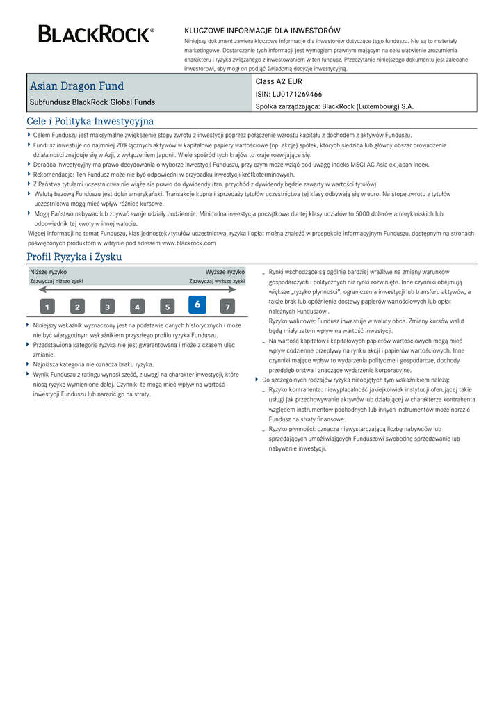 KLUCZOWE INFORMACJE DLA INWESTORÓW Niniejszy dokument zawiera kluczowe informacje dla inwestorów dotyczące tego funduszu. Nie są to materiały marketingowe. Dostarczenie tych informacji jest wymogiem prawnym mającym na celu ułatwienie zrozumienia charakteru i ryzyka związanego z inwestowaniem w ten fundusz. Przeczytanie niniejszego dokumentu jest zalecane inwestorowi, aby mógł on podjąć świadomą decyzję inwestycyjną. Class A2 EUR Asian Dragon Fund ISIN: LU0171269466 Subfundusz BlackRock Global Funds Spółka zarządzająca: BlackRock (Luxembourg) S.A. Cele i Polityka Inwestycyjna Celem Funduszu jest maksymalne zwiększenie stopy zwrotu z inwestycji poprzez połączenie wzrostu kapitału z dochodem z aktywów Funduszu. Fundusz inwestuje co najmniej 70% łącznych aktywów w kapitałowe papiery wartościowe (np. akcje) spółek, których siedziba lub główny obszar prowadzenia działalności znajduje się w Azji, z wyłączeniem Japonii. Wiele spośród tych krajów to kraje rozwijające się. Doradca inwestycyjny ma prawo decydowania o wyborze inwestycji Funduszu, przy czym może wziąć pod uwagę indeks MSCI AC Asia ex Japan Index. Rekomendacja: Ten Fundusz może nie być odpowiedni w przypadku inwestycji krótkoterminowych. Z Państwa tytułami uczestnictwa nie wiąże sie prawo do dywidendy (tzn. przychód z dywidendy będzie zawarty w wartości tytułów). Walutą bazową Funduszu jest dolar amerykański. Transakcje kupna i sprzedaży tytułów uczestnictwa tej klasy odbywają się w euro. Na stopę zwrotu z tytułów uczestnictwa mogą mieć wpływ różnice kursowe. Mogą Państwo nabywać lub zbywać swoje udziały codziennie. Minimalna inwestycja początkowa dla tej klasy udziałów to 5000 dolarów amerykańskich lub odpowiednik tej kwoty w innej walucie. Więcej informacji na temat Funduszu, klas jednostek/tytułów uczestnictwa, ryzyka i opłat można znaleźć w prospekcie informacyjnym Funduszu, dostępnym na stronach poświęconych produktom w witrynie pod adresem www.blackrock.com Profil Ryzyka i Zysku Niższe ryzyko Zazwyczaj niższe zyski Wyższe ryzyko Zazwyczaj wyższe zyski Niniejszy wskaźnik wyznaczony jest na podstawie danych historycznych i może nie być wiarygodnym wskaźnikiem przyszłego profilu ryzyka Funduszu. Przedstawiona kategoria ryzyka nie jest gwarantowana i może z czasem ulec zmianie. Najniższa kategoria nie oznacza braku ryzyka. Wynik Funduszu z ratingu wynosi sześć, z uwagi na charakter inwestycji, które niosą ryzyka wymienione dalej. Czynniki te mogą mieć wpływ na wartość inwestycji Funduszu lub narazić go na straty. Rynki wschodzące są ogólnie bardziej wrażliwe na zmiany warunków gospodarczych i politycznych niż rynki rozwinięte. Inne czynniki obejmują większe „ryzyko płynności”, ograniczenia inwestycji lub transferu aktywów, a także brak lub opóźnienie dostawy papierów wartościowych lub opłat należnych Funduszowi. - Ryzyko walutowe: Fundusz inwestuje w waluty obce. Zmiany kursów walut będą miały zatem wpływ na wartość inwestycji. - Na wartość kapitałów i kapitałowych papierów wartościowych mogą mieć wpływ codzienne przepływy na rynku akcji i papierów wartościowych. Inne czynniki mające wpływ to wydarzenia polityczne i gospodarcze, dochody przedsiębiorstwa i znaczące wydarzenia korporacyjne. Do szczególnych rodzajów ryzyka nieobjętych tym wskaźnikiem należą: - Ryzyko kontrahenta: niewypłacalność jakiejkolwiek instytucji oferującej takie usługi jak przechowywanie aktywów lub działającej w charakterze kontrahenta względem instrumentów pochodnych lub innych instrumentów może narazić Fundusz na straty finansowe. - Ryzyko płynności: oznacza niewystarczającą liczbę nabywców lub sprzedających umożliwiających Funduszowi swobodne sprzedawanie lub nabywanie inwestycji. - Opłaty Wnoszone opłaty służą pokryciu kosztów działania Funduszu, w tym kosztów marketingu i dystrybucji. Opłaty te zmniejszają potencjalny wzrost inwestycji. Podawana jest zawsze maksymalna wartość opłat za subskrypcję i umorzenie. W niektórych przypadkach możliwe jest zmniejszenie opłaty. Aby poznać dokładne wartości opłat za subskrypcję i umorzenie, prosimy skontaktować się z doradcą finansowym lub dystrybutorem. *Podlega opłacie w wysokości do 2%, wpłacanej do Funduszu, w którym menedżer podejrzewa nadmierny obrót ze strony inwestora. Wysokość opłat bieżących określana jest na podstawie wydatków za okres dwunastu miesięcy zakończony na dzień 31 grudnia 2016. Kwota ta może ulegać zmianie co roku. Wyłączenie stanowią koszty portfelowe związane z obrotem, z wyjątkiem kosztów opłat dla powiernika oraz kosztów opłat za subskrypcję/umorzenie realizowanych na rzecz odpowiedniego planu zbiorowego (jeśli istnieje). ** W zakresie, w jakim Fundusz podejmuje się pożyczania papierów wartościowych w celu redukcji kosztów, Fundusz będzie otrzymywał 62,5% uzyskanego przychodu, a pozostałe 37,5% będzie przekazywane spółce BlackRock z tytułu świadczenia usług pożyczania papierów wartościowych. Podział przychodu z tytułu pożyczania papierów wartościowych nie został ujęty w ramach opłat bieżących ze względu na to, że nie powoduje on wzrostu kosztu prowadzenia Funduszu. Opłaty jednorazowe pobierane przed lub po dokonaniu inwestycji. Opłata za subskrypcję. 5.00% Opłata za umorzenie. Brak* Jest to maksymalna kwota, jaka może zostać pobrana z Państwa środków przed ich zainwestowaniem lub przed wypłaceniem zysków z inwestycji. Opłaty pobierane z Funduszu w ciągu roku Opłaty bieżące. 1.84%** Opłaty pobierane z Funduszu w określonych warunkach Opłata za wyniki Brak Wyniki Osiągnięte w Przeszłości Wyniki osiągnięte w przeszłości nie stanowią wskazówek odnośnie przyszłych wyników. Wykres przedstawia roczne wyniki Funduszu w EUR dla każdego pełnego roku kalendarzowego w okresie przedstawionym na wykr