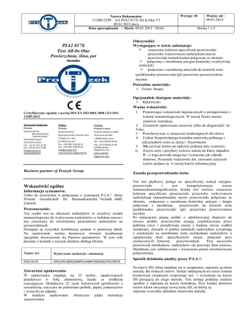 Nazwa Dokumentu: 1110012290 AA PIA2 817S All in One V1 09.01.2015.docx Data sporządzenia / Skrót: 09.01.2015 / MAG Wersja: 01 Ważny od : 09.01.2015 Strona 1 z 3 Odczynniki: Występujące w teście substancje: oznaczone kolorem specyficzne przeciwciało PIA2 817S Test All-In One Powierzchnia, ślina, pot przeciwko wykrywanym narkotykom (mysie przeciwciała monoklonalne połączone ze złotem) połączony z membraną antygen kontrolny (wykrywany narkotyk) połączone z membraną antyciało do kontroli testu (poliklonalne przeciwciała IgG przeciwko przeciwciałom mysim) Potrzebne materiały: Ewent. Stoper Opcjonalnie dostępne materiały: Rękawiczki Ważne wskazówki: Certyfikowany zgodnie z normą DIN EN ISO 9001:2008 i EN ISO 13485:2012 Szwajcaria Niemiecka Protzek Geselschaft für Biomedizinische Technik GmbH Heulenlochweg 6 CH-4133 Pratteln Tel.: +41 61 751 57 83 Fax: +41 61 751 57 84 [email protected] www.protzek.ch Niemcy Protzek Gesellschaft für Biomedizinische Technik mbH Tülinger Str. 36 a D-79539 Lörrach Tel.: +49 7621 578 95 17 Fax: +49 7621 578 95 20 [email protected] www.protzek-diagnostik.de Francja Protzek France Produits Médicaux SARL 24 avenue de Bâle F-68300 Saint Louis Tél.: +33 3 89 69 29 68 Fax: +33 3 89 69 21 90 [email protected] www.protzekdiagnostic.com Business partner of Protzek Group Wskazówki ogólne Informacja systemowa: Tylko do stosowania w połączeniu z systemami P.I.A.2 firmy Protzek Gesellschaft für Biomedizinische Technik mbH, Lörrach. Przeznaczenie: Ten szybki test na obecność narkotyków to wrażliwy środek immunologiczny do wykrywania narkotyków w ludzkim moczu i jest stosowany do stwierdzenia pozostałości narkotyków na powierzchniach. Dostępne są wszystkie kombinacje podane w poniższej tabeli. Na zamówienie można dostarczyć również kombinacje specjalnie dostosowane do Państwa parametrów. W tym celu prosimy o kontakt z naszym działem obsługi klienta. Numer art. Wykrywane narkotyki / substancje PIA2 817S OPI/COC/BZO/AMP/mAMP/MDMA/THC/MTD Zawartość opakowania: W opakowaniu znajduje się 25 testów, zapakowanych pojedynczo w folię aluminiową, każdy ze środkiem osuszającym. Dodatkowo 25 rurek buforowych (probówek) z zawartością, naczynia do pobierania próbek, pipety jednorazowe i woreczki na odpady. W każdym opakowaniu zbiorczym jedna instrukcja zastosowania. Przestrzegać wskazówek higienicznych w postępowaniu z testami immunologicznymi. W naszej firmie można zamówić instrukcję. 2. Zawartość opakowania stosować tylko do diagnostyki InVitro. 3. Przechowywać w miejscach niedostępnych dla dzieci. 4. Unikać bezpośredniego kontaktu materiału próbnego i odczynników testu ze skórą i śluzówkami. 5. Nie używać testów po upływie podanej daty ważności. 6. Zużyte testy i przybory testowe należą do klasy odpadów B i z tego powodu mogą być wyrzucane jak odpady domowe. Pozostałe wskazówki dot. usuwania zużytych testów podane są w naszej karcie informacyjnej. 1. Zasada przeprowadzania testu: Ten test płytkowy polega na specyficznej reakcji antygenprzeciwciało i jest kompetytywnym testem immunochromatograficznym. Każdy test zawiera oznaczone kolorem specyficzne przeciwciała przeciwko wykrywanym narkotykom (monoklonalne mysie przeciwciała połączone ze złotem), połączony z membraną kontrolny antygen i drugie połączone z membraną przeciwciało do kontroli testu (poliklonalne przeciwciało IgG przeciwko przeciwciałom mysim). Po naniesieniu pipetą próbki o zdefiniowanej objętości do otworu próbki, przeciwciała zostają zmobilizowane przez pobraną ciecz i przepływają razem z badaną cieczą wzdłuż membrany. Zawarte w próbce molekuły narkotyków rywalizują z ustalonymi na membranie testu molekułami narkotyków o ograniczoną ilość specyficznych miejsc połączeń przy zaznaczonych kolorem przeciwciałach. Przy nasyceniu przeciwciał molekułami narkotyków nie powstaje linia testowa. Membrana jest zablokowana i wysuszona przed niewłaściwymi połączeniami. Sposób działania analizy przez P.I.A.2: Na karcie SD, która znajduje się w urządzeniu, zapisane są różne metody dla różnych testów. Dzięki naklejonym na teście kodom kreskowym urządzenie rozpoznaje test i wyszukuje na karcie SD pasującej do niego metody. Test zostaje poddany analizie zgodnie z zapisaną na karcie instrukcją. Przy każdej dostawie testów klient otrzymuje nową kartę SD, na której są zapisane wszystkie aktualnie stosowane metody. Nazwa Dokumentu: 1110012290 AA PIA2 817S All in One V1 09.01.2015.docx Data sporządzenia / Skrót: 09.01.2015 / MAG Przez pole kontrolne, nadrukowany powyżej otworu na pipetę czarny kwadrat, system rozpoznaje, czy kaseta została prawidłowo włożona. Dzięki wewnętrznej kontroli (linia kontrolna) sprawdzane jest, czy test przebiegł prawidłowo. Występowanie kontroli wewnętrznej jest sprawdzane bezpośrednio z urządzenia przed każdym pomiarem. Jeżeli taka kontrola nie występuje to urządzenie podaje komunikat „nieważne" i testu nie można dalej używać . 3. 4. 5. Jest to opis skrócony. Szczegółowy opis znajduje się w instrukcji firmy P.I.A.2. 6. Informacje dotyczące używania 7. Pobieranie próbek: Pobieranie próbek odbywa się zasadniczo przy użyciu dostarczonego urządzenia do pobierania (pałeczki do wymazu). Należy postępować zgodnie z poniższą szczegółową instrukcją obsługi. Przechowywanie testów i próbek: Testy przechowywać tylko w oryginalnych opakowaniach i w temperaturze pokojowej (+ 2 do + 30°C). Unikać bezpośredniego nasłonecznienia. Nie zamrażać testów! Przeprowadzenie testu: 1) 2) 3) Pole kontrolne do kontroli prawidłowego położenia w szufladzie Otwory na pipetę Legenda do wykrywanych narkotyków 1.Wyjąć potrzebny test z opakowania bezpośrednio przed wykonaniem testu. Urządzenie do pobierania wymazu wyjąć z zamkniętej torebki. Powierzchnia/pot: Końcówką przetrzeć kilka razy potencjal