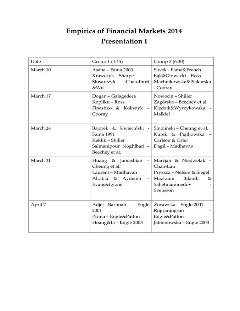Empirics of Financial Markets 2014 Presentation I Date Group 1 (4.45) Group 2 (6.30) March 10 Asaba – Fama 2003 Krawczyk – Sharpe Ślusarczyk – Chaudhuri &Wu Siwek - Fama&French Bąk&Głowacki – Ross Machnikowska&Piekarska - Cooray March 17 Dogan – Galagedera Nowocin – Shiller Kopliku – Ross Zagórska – Beechey et al. Finashko & Kolisnyk – Kledzik&Wyrzykowska Cooray Malkiel March 24 Bajorek & Kwieciński - Smoliński – Cheung et al. Fama 1991 Kurek & Piątkowska – Keklik – Shiller Carlson & Osler Salmanipour Noghlbari – Dagil – Madhavan Beechey et al. March 31 Huang & Jamashian – Marcjan & Niedzielak – Cheung et al. Chan-Lau Laurent – Madhavan Pryszcz – Nelson & Siegel Alrabia & Aydemir – Mazloum Bilandi & Evans&Lyons Sahetmammedov Svensson April 7 Adjei Barimah – Engle 2001 Prima – Engle&Patton Hoang&Li – Engle 2003 Żurawska – Engle 2001 Rujirarangsan – Engle&Patton Jabłonowska – Engle 2003