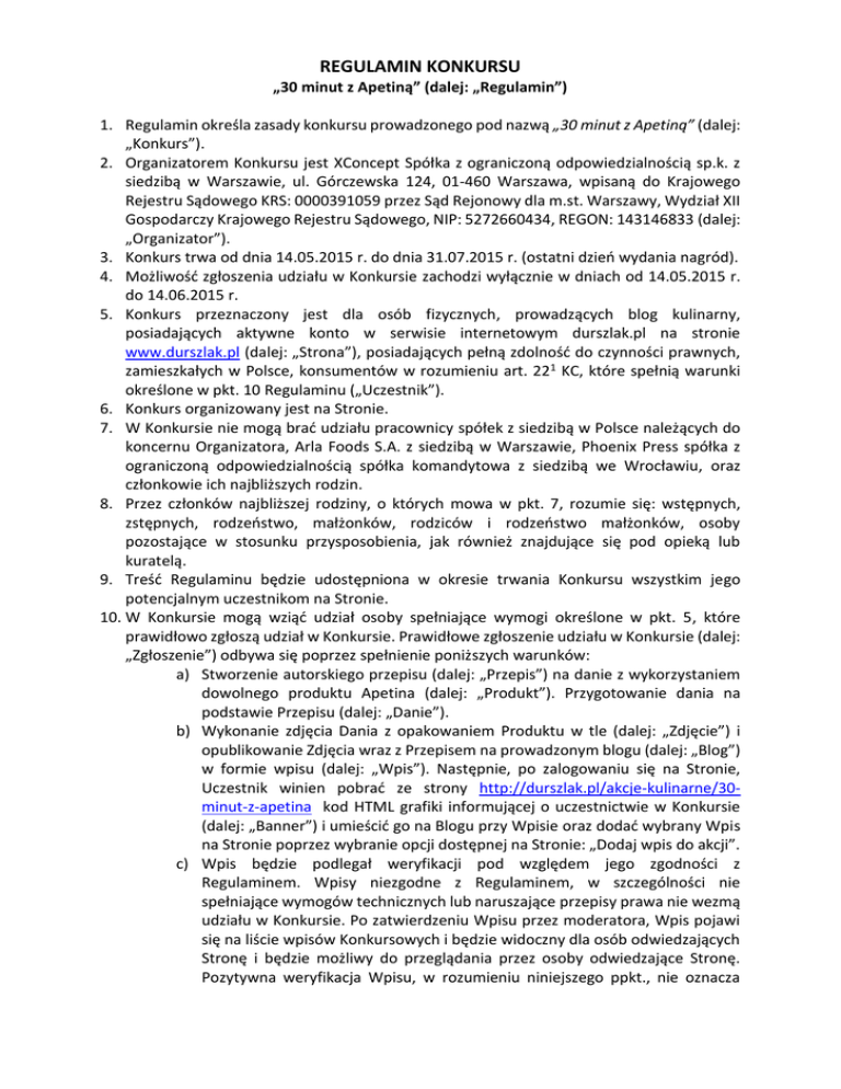 REGULAMIN KONKURSU „30 minut z Apetiną” (dalej: „Regulamin”) 1. Regulamin określa zasady konkursu prowadzonego pod nazwą „30 minut z Apetiną” (dalej: „Konkurs”). 2. Organizatorem Konkursu jest XConcept Spółka z ograniczoną odpowiedzialnością sp.k. z siedzibą w Warszawie, ul. Górczewska 124, 01-460 Warszawa, wpisaną do Krajowego Rejestru Sądowego KRS: 0000391059 przez Sąd Rejonowy dla m.st. Warszawy, Wydział XII Gospodarczy Krajowego Rejestru Sądowego, NIP: 5272660434, REGON: 143146833 (dalej: „Organizator”). 3. Konkurs trwa od dnia 14.05.2015 r. do dnia 31.07.2015 r. (ostatni dzień wydania nagród). 4. Możliwość zgłoszenia udziału w Konkursie zachodzi wyłącznie w dniach od 14.05.2015 r. do 14.06.2015 r. 5. Konkurs przeznaczony jest dla osób fizycznych, prowadzących blog kulinarny, posiadających aktywne konto w serwisie internetowym durszlak.pl na stronie www.durszlak.pl (dalej: „Strona”), posiadających pełną zdolność do czynności prawnych, zamieszkałych w Polsce, konsumentów w rozumieniu art. 221 KC, które spełnią warunki określone w pkt. 10 Regulaminu („Uczestnik”). 6. Konkurs organizowany jest na Stronie. 7. W Konkursie nie mogą brać udziału pracownicy spółek z siedzibą w Polsce należących do koncernu Organizatora, Arla Foods S.A. z siedzibą w Warszawie, Phoenix Press spółka z ograniczoną odpowiedzialnością spółka komandytowa z siedzibą we Wrocławiu, oraz członkowie ich najbliższych rodzin. 8. Przez członków najbliższej rodziny, o których mowa w pkt. 7, rozumie się: wstępnych, zstępnych, rodzeństwo, małżonków, rodziców i rodzeństwo małżonków, osoby pozostające w stosunku przysposobienia, jak również znajdujące się pod opieką lub kuratelą. 9. Treść Regulaminu będzie udostępniona w okresie trwania Konkursu wszystkim jego potencjalnym uczestnikom na Stronie. 10. W Konkursie mogą wziąć udział osoby spełniające wymogi określone w pkt. 5, które prawidłowo zgłoszą udział w Konkursie. Prawidłowe zgłoszenie udziału w Konkursie (dalej: „Zgłoszenie”) odbywa się poprzez spełnienie poniższych warunków: a) Stworzenie autorskiego przepisu (dalej: „Przepis”) na danie z wykorzystaniem dowolnego produktu Apetina (dalej: „Produkt”). Przygotowanie dania na podstawie Przepisu (dalej: „Danie”). b) Wykonanie zdjęcia Dania z opakowaniem Produktu w tle (dalej: „Zdjęcie”) i opublikowanie Zdjęcia wraz z Przepisem na prowadzonym blogu (dalej: „Blog”) w formie wpisu (dalej: „Wpis”). Następnie, po zalogowaniu się na Stronie, Uczestnik winien pobrać ze strony http://durszlak.pl/akcje-kulinarne/30minut-z-apetina kod HTML grafiki informującej o uczestnictwie w Konkursie (dalej: „Banner”) i umieścić go na Blogu przy Wpisie oraz dodać wybrany Wpis na Stronie poprzez wybranie opcji dostępnej na Stronie: „Dodaj wpis do akcji”. c) Wpis będzie podlegał weryfikacji pod względem jego zgodności z Regulaminem. Wpisy niezgodne z Regulaminem, w szczególności nie spełniające wymogów technicznych lub naruszające przepisy prawa nie wezmą udziału w Konkursie. Po zatwierdzeniu Wpisu przez moderatora, Wpis pojawi się na liście wpisów Konkursowych i będzie widoczny dla osób odwiedzających Stronę i będzie możliwy do przeglądania przez osoby odwiedzające Stronę. Pozytywna weryfikacja Wpisu, w rozumieniu niniejszego ppkt., nie oznacza przejęcia przez Organizatora odpowiedzialności za treść Wpisu, naruszającą przepisy prawa. d) Jeden Uczestnik może zgłosić do Konkursu maksymalnie 6 Wpisów, jednakże każdy Wpis musi dotyczyć innego rodzaju Produktu. e) Każdy z elementów Wpisu, tj. Przepis, Danie i Zdjęcie powinny być wynikiem indywidualnej twórczości Uczestnika i nie mogą naruszać praw osób trzecich. Możliwe jest dodanie Wpisów stworzonych wyłącznie na potrzeby Konkursu. Wpis nie może przedstawiać innych marek i produktów niż produkty Arla Apetina. Wpisy nie mogą zawierać przekazów obraźliwych, ani jakichkolwiek określeń uznawanych za wulgarne, obrażających/naruszających prawa innych osób lub deprecjonujących inne osoby lub firmy lub ich produkty. 11. Uczestnikom Konkursu nie przysługuje prawo do zastrzeżenia szczególnych właściwości nagrody, ani do otrzymania ekwiwalentu pieniężnego za rzeczową część nagrody. 12. Nagrodami w Konkursie są: a) Nagroda Główna: Robot Kuchenny Kenwood KM094 o wartości 3600 zł brutto wraz z nagrodą pieniężną w wysokości 400 zł przeznaczoną na refundację podatku od nagrody. Łączna wartość Nagrody wynosi 4000 zł. b) Nagroda II rzędu: Blender ręczny Kenwood z nowoczesną technologią trzech ostrzy „Triblade” o wartości 200 zł brutto. 13. Nagrody zostaną wydane zgodnie z obowiązującymi przepisami podatkowymi. W przypadku Nagrody Głównej zostanie ona wydana po odjęciu kwoty w wysokości 10% łącznej wartości nagrody. Organizator odprowadzi należny podatek od nagrody, zatem uczestnik otrzyma jedynie element rzeczowy nagrody. 14. Pula dostępnych Nagród:  1 x Nagroda Główna  10 x Nagroda II rzędu 15. Jeden Uczestnik Konkursu może otrzymać tylko jedną Nagrodę, Organizator zastrzega, iż jedną Nagrodę może otrzymać wyłącznie jeden z Laureatów należących do wspólnego gospodarstwa domowego. Kryterium oceny przynależności do danego gospodarstwa domowego stanowi wspólny adres Laureatów określony w pkt. 17 a). 16. Kryterium przyznania nagrody będzie swobodna ocena Komisji Konkursowej powołanej przez Organizatora przysłanych Wpisów, a w szczególności Zdjęć, dokonana zgodnie z art. 921 § 2 KC, pozwalająca uznać je za najbardziej pomysłowe, oryginalne i nietuzinkowe, zgodnie z następującą procedurą:  W ciągu 14 dni po zakończeniu Konkursu zostanie stworzona Lista Laureatów (dalej: „Lista Laureatów”). Na Listę Laureatów zostanie wpisanych 11 Laureatów, których Wpisy zostały najwyżej ocenione 