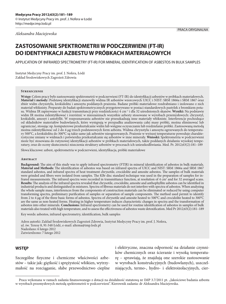 Medycyna Pracy 2012;63(2):181–189 © Instytut Medycyny Pracy im. prof. J. Nofera w Łodzi http://medpr.imp.lodz.pl PRACA ORYGINALNA Aleksandra Maciejewska ZASTOSOWANIE SPEKTROMETRII W PODCZERWIENI (FT-IR) DO IDENTYFIKACJI AZBESTU W PRÓBKACH MATERIAŁOWYCH APPLICATION OF INFRARED SPECTROMETRY (FT-IR) FOR MINERAL IDENTIFICATION OF ASBESTOS IN BULK SAMPLES Instytut Medycyny Pracy im. prof. J. Nofera, Łódź Zakład Środowiskowych Zagrożeń Zdrowia Streszczenie Wstęp: Celem pracy było zastosowanie spektrometrii w podczerwieni (FT-IR) do identyfikacji azbestów w próbkach materiałowych. Materiał i metody: Podstawę identyfikacji stanowiły widma IR azbestów wzorcowych UICC i NIST: SRM 1866a i SRM 1867 oraz zbiór widm chryzotylu, krokidolitu i amosytu poddanych prażeniu. Badane próbki materiałowe rozdrabniano i izolowano z nich materiał włóknisty. Preparaty do badań spektrometrycznych przygotowywano w postaci standardowych pastylek z bromkiem potasu. Widma IR zapisywano w funkcji transmitancji przy rozdzielczości 4 cm–1 i dla 32 uśrednionych skanów. Wyniki: Na podstawie widm IR można zidentyfikować i rozróżnić w mieszaninach wszystkie azbesty stosowane w wyrobach przemysłowych: chryzotyl, krokidolit, amosyt i antofyllit. W rozpoznawaniu azbestów nie przeszkadzają inne materiały włókniste. Interferencje pochodzące od składników materiałów budowlanych, które występują w przypadku analizowania całej masy próbki, można eliminować lub ograniczać, stosując np. komputerowe przekształcanie widm lub wstępne oczyszczanie lub rozdzielanie próbki. Zastosowaną metodą można zidentyfikować od 2 do 4 μg trzech podstawowych form azbestu. Widma chryzotylu i amosytu ogrzewanych do temperatury 500°C, a krokidolitu do 300°C są takie same jak azbestów nieogrzewanych. Prażenie w wyższej temperaturze powoduje charakterystyczne zmiany w widmach i potwierdza przekształcanie się azbestów w inne minerały. Wnioski: Spektrometria w podczerwieni może być stosowana do rutynowej identyfikacji azbestów w próbkach materiałowych, także poddanych działaniu wysokiej temperatury, oraz do oceny skuteczności niszczenia struktury azbestów w procesach ich unieszkodliwiania. Med. Pr. 2012;63(2):181–189 Słowa kluczowe: azbest, spektrometria w podczerwieni, identyfikacja, próbki materiałowe Abstract Background: The aim of this study was to apply infrared spectrometry (FTIR) in mineral identification of asbestos in bulk materials. Material and Methods: The identification of asbestos was based on infrared spectra of UICC and NIST: SRM 1866a and SRM 1867 standard asbestos, and infrared spectra of heat treatment chrysotile, crocidolite and amosite asbestos. The samples of bulk materials were grinded and fibers were isolated from samples. The KBr disc standard technique was used in the preparation of samples for infrared measurements. The infrared spectra were recorded in transmittance function, at resolution of 4 cm1 and for 32 averaged scans. Results: The analysis of the infrared spectra revealed that chrysotile, crocidolite, amosite and anthophyllite asbestos can be identified in industrial products and distinguished in mixtures. Spectra of fibrous materials do not interfere with spectra of asbestos. When analyzing the whole sample mass, interferences from the components of construction materials can be eliminated or reduced by using computer transforming spectra, preliminary purification of samples or separation of sample components. The method used permit to identify from 2 to 4 μg of the three basic forms of asbestos. Spectra of chrysotile and amosite heated to 500°C and crocidolite heated to 300°C are the same as non-heated forms. Heating in higher temperature induces characteristic changes in spectra and the transformation of asbestos into other minerals. Conclusions: Infrared spectrometry can be used for routine identification of asbestos in samples of bulk materials also treated with high temperature, and to assess the effectiveness of asbestos waste detoxification. Med Pr 2012;63(2):181–189 Key words: asbestos, infrared spectrometry, identification, bulk samples Adres autorki: Zakład Środowiskowych Zagrożeń Zdrowia, Instytut Medycyny Pracy im. prof. J. Nofera, ul. św. Teresy 8, 91-348 Łódź, e-mail: [email protected] Nadesłano: 6 lutego 2012 Zatwierdzono: 7 lutego 2012 WSTĘP Szczególne fizyczne i chemiczne właściwości azbestów – takie jak: giętkość i sprężystość włókien, wytrzymałość na rozciąganie, słabe przewodnictwo cieplne i elektryczne, znaczna odporność na działanie czynników chemicznych oraz ścieranie i wysoką temperaturę – sprawiają, że znajdują one szerokie zastosowanie w wyrobach konstrukcyjnych (budowlanych), uszczelniających, termo-, hydro- i elektroizolacyjnych, cier- Praca wykonana w ramach zadania finansowanego z dotacji na działalność statutową nr IMP 3.7/2011 pt. „Jakościowe badania azbestu w wyrobach przemysłowych metodą spektrometrii w podczerwieni”. Kierownik zadania: dr Aleksandra Maciejewska. 182 A. Maciejewska nych, ogniotrwałych, filtracyjnych, dźwiękochłonnych i innych. Niestety, wszechstronności w stosowaniu tych minerałów towarzyszy ich szkodliwe działanie na organizm człowieka, szczególnie zwłókniające i rakotwórcze. Wydana w 1997 roku ustawa o zakazie stosowania wyrobów zawierających azbest (1) oraz ustanowiony przez Radę Ministrów „Program Oczyszczania Kraju z Azbestu na lata 2009–2032” (2,3) mają na celu eliminację i unieszkodliwienie wyrobów azbestowych, a jednocześnie zminimalizowanie negatywnych skutków zdrowotnych oraz likwidację niekorzystnego oddziaływania na środowisko. Szacuje się, że w Polsce do usunięcia pozostaje jeszcze około 15 mln ton wyrobów azbestowych, z czego co najmniej 95% stanowią materiały budowlane – głównie płyty azbestowo-cementowe (3). Wymagany prawem plan prac związanych z zabezpieczaniem i us