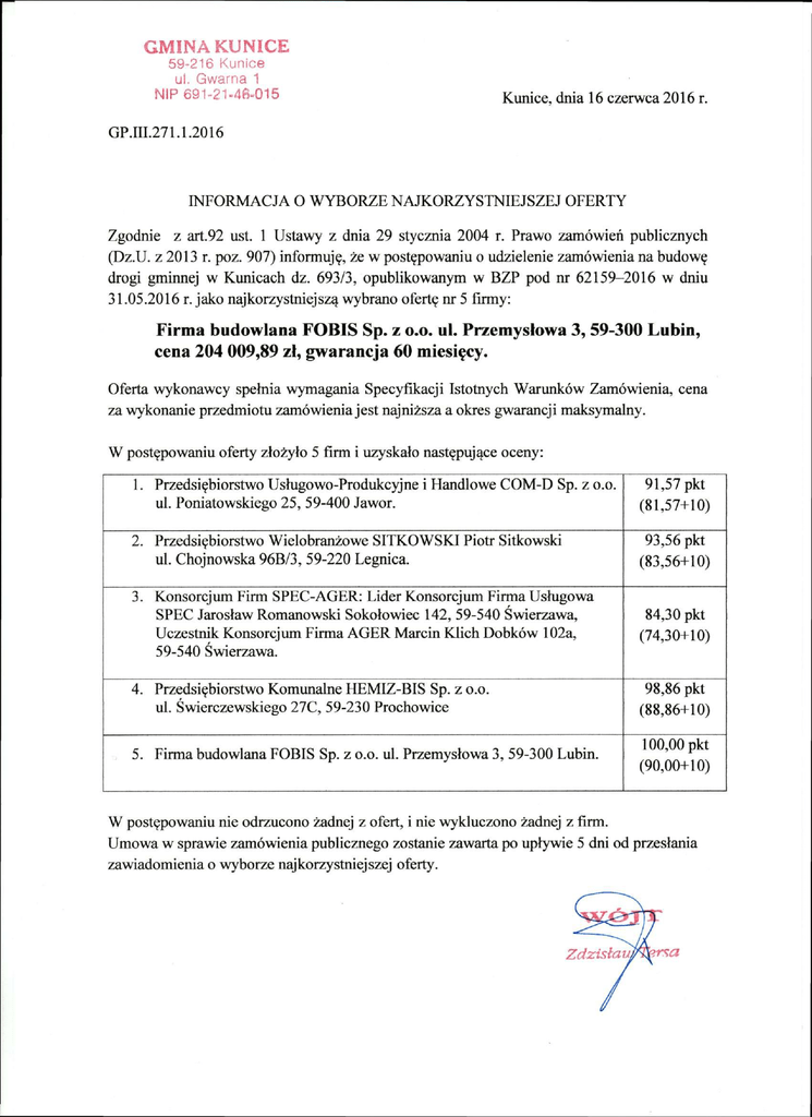 GMINA K U N I C E 59-216 Kunice ul. Gwarna 1 NIP 691-21-46-015 Kunice, dnia 16 czerwca 2016 r. GP.HL271.1.2016 INFORMACJA O WYBORZE NAJKORZYSTNIEJSZEJ OFERTY Zgodnie z art.92 ust. 1 Ustawy z dnia 29 stycznia 2004 r. Prawo zamówień publicznych (Dz.U. z 2013 r. poz. 907) informuję, że w postępowaniu o udzielenie zamówienia na budowę drogi gminnej w Kunicach dz. 693/3, opublikowanym w BZP pod nr 62159-2016 w dniu 31.05.2016 r. jako najkorzystniejszą wybrano ofertę nr 5 firmy: Firma budowlana FOBIS Sp. z o.o. ul. Przemysłowa 3,59-300 Lubin, cena 204 009,89 zł, gwarancja 60 miesięcy. Oferta wykonawcy spełnia wymagania Specyfikacji Istotnych Warunków Zamówienia, cena za wykonanie przedmiotu zamówienia jest najniższa a okres gwarancji maksymalny. W postępowaniu oferty złożyło 5 firm i uzyskało następujące oceny: 1. Przedsiębiorstwo Usługowo-Produkcyjne i Handlowe COM-D Sp. z o.o. ul. Poniatowskiego 25, 59-400 Jawor. 91,57 pkt (81,57+10) 2. Przedsiębiorstwo Wielobranżowe SITKOWSKI Piotr Sitkowski ul. Chojnowska 96B/3, 59-220 Legnica. 93,56 pkt (83,56+10) 3. Konsorcjum Firm SPEC-AGER: Lider Konsorcjum Firma Usługowa SPEC Jarosław Romanowski Sokołowiec 142, 59-540 Świerzawa, Uczestnik Konsorcjum Firma AGER Marcin Klich Dobków 102a, 59-540 Świerzawa. 84,30 pkt (74,30+10) 4. Przedsiębiorstwo Komunalne HEMIZ-BIS Sp. z o.o. ul. Świerczewskiego 27C, 59-230 Prochowice 98,86 pkt (88,86+10) 5. Firma budowlana FOBIS Sp. z o.o. ul. Przemysłowa 3, 59-300 Lubin. 100,00 pkt (90,00+10) W postępowaniu nie odrzucono żadnej z ofert, i nie wykluczono żadnej z firm. Umowa w sprawie zamówienia publicznego zostanie zawarta po upływie 5 dni od przesłania zawiadomienia o wyborze najkorzystniejszej oferty. Zdzisła rsa