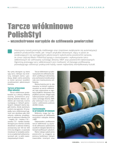 N A R Z Ę D Z I A WWW.4WOODI.PL I A K C E S O R I A Tarcze włókninowe PolishStyl – wszechstronne narzędzie do szlifowania powierzchni Intensywny rozwój przemysłu meblowego oraz stopniowe zwiększanie się automatyzacji polskich producentów mebli, jak i innych artykułów drzewnych, idący w parze ze zwiększającymi się wymaganiami jakościowymi wykończenia powierzchni sprawia, że coraz częściej klienci PolishStyl pytają o zastosowanie i wykorzystanie tarcz włókninowych do szlifowania surowego drewna, MDF oraz powierzchni lakierowanych. Ogromną przewagą tarcz włókninowych jest możliwość ich łatwego profilowania, pozwalającego odtworzyć praktycznie każdy, nawet najbardziej skomplikowany kształt. Tarcze arkuszowe (flap wheels) Tarcze włókninowe produkowane są z arkuszy włókniny ściernej, promieniście przyklejonej dookoła rdzenia i podobnie jak materiały ścierne występują w różnych granulacjach, rodzajach ziarna (węglik krzemu, tlenek aluminium, cyrkon) oraz gęstości. W przypadku tarcz włókninowych gęstość jest określana jako ilość arkuszy włókniny przyklejonych na jednostce obwodu (C6 – miękka, C8 – średnia, C10 – twarda, C12 – bardzo twarda). Dostępna jest również szeroka dowolność w zakresie średnicy zewnętrznej (od 100 do 500 mm) oraz długości, co pozwala instalować te narzędzia zarówno na urządzeniach półautomatycznych, jak i w pełni zautomatyzowanych liniach. Tarcze włókninowe są wykorzystywane do szlifowania płaskich i profilowych elementów, przy zachowaniu kształtu przez cały czas trwania procesu szlifowania. Ważną kwestią jest to, aby maszyny, na których wykorzystywane są tarcze włókninowe, były wyposażone w regulację prędkości obrotowej oraz prędkości posuwu. Długie wały wykorzystywane są przy szlifowaniu surowego drewna, MDF, płyt wiórowych oraz w szlifowaniu i polerowaniu podczas obróbki metalu. Fot. PolishStyl Na rynku dostępne są różne typy tarcz, różniące się strukturą, rodzajem ziarna i gradacją, dzięki czemu jesteśmy w stanie sprostać wszelkim oczekiwaniom jakościowym klientów. Zastosowanie w przemyśle drzewnym Włókniny mogą być wykorzystywane do szlifowania wszystkich rodzajów drewna i MDF. Odpowiednio profilowane tarcze włókninowe są używane do szlifowania i polerowania wszelkich rodzajów lakierów na listwach profilowych i płaskich. Różne rodzaje wykończenia powierzchni są osiągane za pomocą kombinacji różnych materiałów ściernych oraz 1 (33) 2015 r. MASZYNY W PRZEMYŚLE DRZEWNYM 43 N A R Z Ę D Z I A I A K C E S O R I A gradacji. Tarcze są montowane na agregatach szlifierskich i sukcesywnie profilowane aż do osiągnięcia właściwego kształtu. Dzięki możliwości zmiany prędkości obrotowej wrzeciona oraz dostosowania prędkości posuwu mamy możliwość dostosować proces szlifowania tak, aby osiągnąć WWW.WYDAWNICTWOFAKTOR.PL Tarcze arkuszowe mieszane (mixed flap wheels) oczekiwane rezultaty. Tarcze włókninowe mogą pracować współbieżnie lub przeciwbieżnie, a więc nie ma znaczenia, jak instalujemy tarcze na wrzecionie. Długie wały włókninowe często montowane są na szlifierkach szerokotaśmowych jako ostateczne wykończenie powierzchni po taśmie ściernej. Fot. PolishStyl Podobnie jak tradycyjne tarcze włókninowe produkowane są z arkuszy włókniny promieniście przyklejonych do rdzenia, naprzemiennie z papierem lub płótnem ściernym. W przypadku tych tarcz ze względu na wszystkie rodzaje włóknin oraz wielość materiałów ściernych o elastycznym podłożu do zaaferowania jest gama tarcz o różnych właściwościach, nadająca się do każdego rodzaju pracy. Stosunek pomiędzy liczbą arkuszy włókniny i materiału ściernego (papieru lub płótna) jest dobierany tak, aby zapewnić największą skuteczność szlifowania. Tarcze arkuszowe z papierem ściernym (mixed paper flap wheels) Odpowiednio dobrane i wyprofilowane tarcze z papierem ściernym są zalecane do szlifowania lakierów podkładowych do ram profilowych, paneli, jak i w całym przemyśle meblowym. Rekomendowana prędkość obrotowa to 15-30 m/s. W zależności od rodzaju pracy i wymaganego wykończenia można zmieniać stosunek ilości włókniny do papieru na obwodzie tarczy. Tarcze arkuszowe z płótnem ściernym (mixed cloth flap wheels) Głównie są zalecane do polerowania i satynowania metali o wysokim stopniu wykończenia. Zalecana prędkość obwodowa to 20-30 m/s. Podobnie jak w tarczach z papierem stosunek ilości włókniny do płótna na obwodzie tarczy można zmieniać. Convoluted wheels Tarcze włókninowe nawijane są produkowane poprzez spiralne zawijanie przy jednoczesnym ściskaniu włóknino44 MASZYNY W PRZEMYŚLE DRZEWNYM 1 (33) 2015 r. wego materiału ściernego oraz włókna nylonu wokół centralnego rdzenia w celu uzyskania bardzo kompaktowej struktury. Podobnie jak tradycyjne tarcze włókninowe występują w różnych granulacjach oraz rodzajach materiału ściernego (tlenek aluminium, węglik krzemu). Wydajność oraz żywotność tarcz nawijanych jest odpowiednio dłuższa od tradycyjnych tarcz włókninowych ze względu na większe zagęszczenie włókninowego materiału ściernego. Te tarcze mogą być łatwo profilowane i pracują dobrze nawet na najbardziej skomplikowanych profilach. Zastosowanie w przemyśle drzewnym Podobnie jak „arkuszowe” tarcze włókninowe nawijane wykorzystywane są do wszelkiego rodzaju profili drewnianych i fornirowanych, a także do wszelkich rodzajów MDF. Mogą być również stosowane do szlifowania lakierów PU i UV także w przypadku, gdy nakładane są dwie lub więcej warstw lakieru. Profilowanie Istotnym czynnikiem wpływającym na osiągnięcie zadowalających rezultatów ze stosowania tarcz włókninowych jest właściwe przygotowanie maszyn do pracy, ustawienie parametrów obróbki, a także odpowiednie przygotowanie narzędzia, a więc dopasowanie (profi