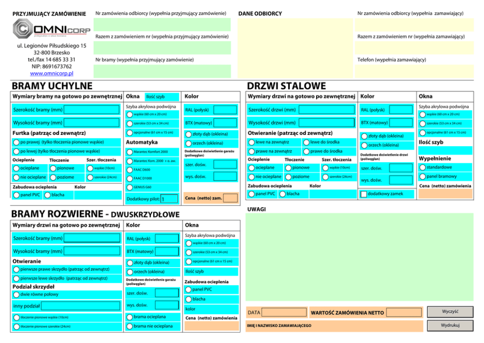 Nr zamówienia odbiorcy (wypełnia przyjmujący zamówienie) PRZYJMUJĄCY ZAMÓWIENIE ul. Legionów Piłsudskiego 15 32-800 Brzesko tel./fax 14 685 33 31 NIP: 8691673762 www.omnicorp.pl Razem z zamówieniem nr (wypełnia zamawiający) Nr bramy (wypełnia przyjmujący zamówienie) Telefon (wypełnia zamawiający) DRZWI STALOWE Wymiary bramy na gotowo po zewnętrznej Okna Ilość szyb Szyba akrylowa podwójna Szerokość bramy (mm) wąskie (60 cm x 20 cm) Wysokość bramy (mm) szerokie (53 cm x 34 cm) Furtka (patrząc od zewnątrz) opcjonalne (61 cm x 15 cm) po prawej (tylko tłoczenia pionowe wąskie) po lewej (tylko tłoczenia pionowe wąskie) Szer. tłoczenia Tłoczenie Automatyka Marantec Kom. 2000 + o. aw. pionowe wąskie (10cm) FAAC D600 nie ocieplane poziome szerokie (24cm) FAAC D1000 panel PVC Kolor blacha Kolor Wymiary drzwi na gotowo po zewnętrznej Kolor RAL (połysk) Szerokość drzwi (mm) RAL (połysk) BTX (matowy) Wysokość drzwi (mm) BTX (matowy) złoty dąb (okleina) orzech (okleina) Marantec Komfort 2000 ocieplane Zabudowa ocieplenia Dodatkowe doświetlenie garażu (poliwęglan) szer. dośw. wys. dośw. Dodatkowy pilot: Wymiary drzwi na gotowo po zewnętrznej Kolor Szerokość bramy (mm) RAL (połysk) Wysokość bramy (mm) BTX (matowy) Otwieranie pierwsze prawe skrzydło (patrząc od zewnątrz) pierwsze lewe skrzydło (patrząc od zewnątrz) dwie równe połowy inny podział Otwieranie (patrząc od zewnątrz) lewe na zewnątrz lewe do środka prawe na zewnątrz prawe do środka Ocieplenie 1 Cena (netto) zam. złoty dąb (okleina) orzech (okleina) Dodatkowe doświetlenie garażu (poliwęglan) szer. dośw. Szer. tłoczenia Tłoczenie ocieplane pionowe wąskie (10cm) nie ocieplane poziome szerokie (24cm) Zabudowa ocieplenia GENIUS G60 panel PVC Kolor blacha złoty dąb (okleina) orzech (okleina) Dodatkowe doświetlenie drzwi (poliwęglan) szer. dośw. wys. dośw. Okna Szyba akrylowa podwójna wąskie (60 cm x 20 cm) szerokie (53 cm x 34 cm) opcjonalne (61 cm x 15 cm) Ilość szyb Wypełnienie standardowe panel bramowy Cena (netto) zamówienia dodatkowy zamek UWAGI BRAMY ROZWIERNE - DWUSKRZYDŁOWE Podział skrzydeł Nr zamówienia odbiorcy (wypełnia zamawiający) Razem z zamówieniem nr (wypełnia przyjmujący zamówienie) BRAMY UCHYLNE Ocieplenie DANE ODBIORCY Okna Szyba akrylowa podwójna wąskie (60 cm x 20 cm) szerokie (53 cm x 34 cm) opcjonalne (61 cm x 15 cm) Ilość szyb Zabudowa ocieplenia panel PVC blacha wys. dośw. tłoczenie pionowe wąskie (10cm) brama ocieplana tłoczenie pionowe szerokie (24cm) brama nie ocieplana kolor Cena (netto) zamówienia DATA WARTOŚĆ ZAMÓWIENIA NETTO IMIĘ I NAZWISKO ZAMAWIAJĄCEGO Wyczyść Wydrukuj