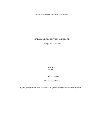 EUROPEJSKI TRYBUNAŁ PRAW CZŁOWIEKA SPRAWA BRONIOWSKI p. POLSCE (Skarga nr 31443/96) WYROK (UGODA) STRASBOURG 28 września 2005 r. Wyrok jest prawomocny, ale może być poddany poprawkom redakcyjnym. WYROK BRONIOWSKI p. POLSCE (UGODA) 1 W sprawie Broniowski p. Polsce, Europejski Trybunał Praw Człowieka zasiadając jako Wielka Izba składająca się z: Pan L. WILDHABER, Przewodniczący, Pan J.-P. COSTA, Pan G. RESS, Pan Nicolas BRATZA, Pani E. PALM, Pan L. CAFLISCH, Pani V. STRÁŽNICKÁ, Pan V. BUTKEVYCH, Pan B.M. ZUPANČIČ, Pan J. HEDIGAN, Pan M. PELLONPÄÄ, Pani H.S. GREVE, Pan A.B. BAKA, Pan R. MARUSTE, Pan M. UGREKHELIDZE, Pan S. PAVLOVSCHI, Pan L. GARLICKI, sędziowie, oraz Pana P.J. MAHONEY, Kanclerz. Obradując na posiedzeniu zamkniętym 19 września 2005 r. Wydaje następujący wyrok, który został przyjęty w tym dniu: POSTĘPOWANIE 1. Sprawa wywodzi się ze skargi (nr 31443/96) przeciwko Rzeczypospolitej Polskiej wniesionej 12 marca 1996 r. do Europejskiej Komisji Praw Człowieka („Komisja”) na podstawie dawnego art. 25 Konwencji o ochronie praw człowieka i podstawowych wolności („Konwencja”) przez polskiego obywatela – pana Jerzego Broniowskiego („Skarżący”). W postępowaniu przed Komisją Skarżący początkowo występował pod inicjałami J. B., a następnie zgodził się na ujawnienie swojego nazwiska. 2. Skarżący, któremu przyznano pomoc prawną, był reprezentowany przez pana Z. Cichonia, adwokata praktykującego w Krakowie oraz pana W. Hermelińskiego, adwokata praktykującego w Warszawie. Polski Rząd („Rząd”) był reprezentowany przez pełnomocnika pana J. Wołąsiewicza z Ministerstwa Spraw Zagranicznych. 2 WYROK BRONIOWSKI p. POLSCE (UGODA) 3. W wyroku z 22 czerwca 2004 r. (“wyrok główny”) Trybunał (Wielka Izba) stwierdził, że doszło do naruszenia artykułu 1 Protokołu 1 do Kowencji. Trybunał uznał, że naruszenie wywodzi się z systemowego problemu związanego z nieprawidłowym funkcjonowaniem polskiego ustawodawstwa i praktyki, spowodowanego zaniechaniem ustanowienia skutecznego mechanizmu realizacji „prawa zaliczania” osób uprawnionych do ekwiwalentu za mienie zabużańskie (zob. trzeci paragraf sentencji wyroku głównego), w konsekwencji czego nie tylko Skarżący w swoim indywidualnym przypadku, ale cała grupa osób była i nadal jest pozbawiona możliwości spokojnego korzystania z mienia (zob. Broniowski p. Polsce [WI], nr 31443/96, ECHR 2004-V, § 189). W związku z tym, Trybunał uznał, że pozwane państwo winno, poprzez stosowne środki prawne oraz praktyki administracyjne, zapewnić realizację wymienionego wyżej prawa majątkowego w stosunku do pozostałych osób uprawnionych do ekwiwalentu za mienie zabużańskie, albo przyznać im w zamian równorzędne zadośćuczynienie, zgodnie z zasadami ochrony praw własnościowych wynikającymi z art. 1 Protokołu nr 1 (zob. czwarty paragraf sentencji wyroku głównego). Odnośnie kwestii przyznania skarżącemu świadczenia za jakiekolwiek szkody materialne i niematerialne wynikające ze stwierdzonego w niniejszej sprawie naruszenia, Trybunał uznał, że kwestia zastosowania art. 41 nie jest jeszcze gotowa do rozstrzygnięcia i wobec tego pozostawił wymienioną wyżej kwestię do późniejszego rozpoznania w całości zwracając się do Rządu i Skarżącego o przedłożenie, w terminie sześciu miesięcy od daty zawiadomienia o wyroku, pism procesowych w tej kwestii, a w szczególności o poinformowanie Trybunału o ewentualnym porozumieniu ugodowym (zob. paragraf 5 sentencji wyroku). W szczególności w odniesieniu do artykułu 41 Trybunał uznał, że kwestię tę należy rozstrzygnąć nie tylko mając na uwadze ewentualne porozumienie ugodowe jakie może zostać zawarte pomiędzy pozwanym Rządem i Skarżącym, ale też biorąc pod uwagę indywidualne lub ogólne środki, jakie mogą zostać podjęte przez pozwane państwo w trakcie wykonania wyroku. Do czasu wprowadzenia w życie stosownych środków o charakterze ogólnym, Trybunał odracza rozpatrywanie skarg mających swe źródło w tej samej ogólnej przyczynie (zob. Broniowski, cytowany powyżej, § 198). Ostatecznie, Trybunał przyznał skarżącemu 12.000 euro w odniesieniu do kosztów i wydatków poniesionych do ówczesnego momentu postępowania przed Trybunałem. 4. W powyżej wymienionym terminie sześciu miesięcy strony przedstawiły swoje obserwacje co do przyznania w niniejszej sprawie zadośćuczynienia w oparciu o artykuł 41. Rząd przedstawił obserwacje 31 stycznia 2005 r. Obserwacje skarżącego dotarły do Kancelarii Trybunału 14 lutego 2005 r. 5. Dnia 7 marca 2005 r. po wymianie pism procesowych stron, Rząd zwrócił się do Kancelarii o pomoc w negocjacjach pomiędzy stronami, których celem byłoby osiągnięcie porozumienia ugodowego w niniejszej WYROK BRONIOWSKI p. POLSCE (UGODA) 3 sprawie. W tym samym czasie Rząd przedstawił pisemną propozycję takiej ugody. 6. Zgodnie z instrukcjami Przewodniczącego Wielkiej Izby, przedstawiciele Kancelarii przeprowadzili spotkania ze stronami w Warszawie w dniach 23 i 24 czerwca 2005 r. Tego ostatniego dnia, strony, mając na uwadze m.in. postępy w pracach polskiego Parlamentu nad nową ustawą regulującą uprawnienia zabużańskie, postanowiły, że negocjacje ugodowe powinny być odroczone do czasu oczekiwanego uchwalenia w najbliższej przyszłości nowej ustawy (zob. paragrafy 12 i 13 poniżej). 7. Dnia 26 lipca 2005 r. Rząd poinformował Trybunał, że nowa ustawa regulująca tzw. uprawnienia zabużańskie została uchwalona przez Parlament 8 lipca 2005 r. (zob. także 13 poniżej). Rząd zwrócił się do Trybunału o podjęcie negocjacji ugodowych. 8. Na zakończenie drugiej tury negocjacji ugodowych w przeprowadzonych w Warszawie w dniach 5 i 6 września 2005 r., strony podpisały ugodę, której tekst zawarty jest poniżej w części wyroku dotyczącej “Prawa” (zob. paragraf 31 poniżej). FAKTY 9. Skarżący, pan Je