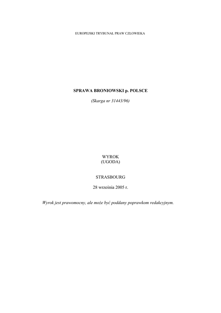 SPRAWA BRONIOWSKI p. POLSCE (Skarga nr 31443/96) WYROK