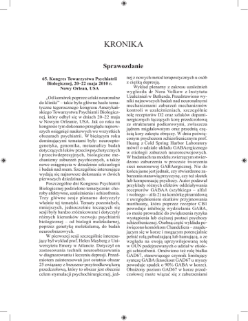 Kronika 759 Kronika Sprawozdanie 65. Kongres Towarzystwa Psychiatrii Biologicznej, 20–22 maja 2010 r. Nowy Orlean, USA „Od komórek poprzez szlaki neuronalne do kliniki” – takie było główne hasło tematyczne tegorocznego kongresu Amerykańskiego Towarzystwa Psychiatrii Biologicznej, który odbył się w dniach 20–22 maja w Nowym Orleanie, USA. Jak co roku na kongresie tym dokonano przeglądu najnowszych osiągnięć naukowych we wszystkich obszarach psychiatrii. W bieżącym roku dominującymi tematami były: neurooptogenetyka, genomika, metaanalizy badań dotyczących leków przeciwpsychotycznych i przeciwdepresyjnych, biologiczne mechanizmy zaburzeń psychicznych, a także nowe osiągnięcia w dziedzinie seksuologii i badań nad snem. Szczególnie interesujące wydają się najnowsze dokonania w dwóch pierwszych dziedzinach. Poszczególne dni Kongresu Psychiatrii Biologicznej podzielono tematycznie: choroby afektywne, uzależnienia i schizofrenia. Trzy główne sesje plenarne dotyczyły właśnie tej tematyki. Tematy pozostałych, mniejszych, jednocześnie toczących się sesji były bardzo zróżnicowane i dotyczyły różnych kierunków rozwoju psychiatrii biologicznej – od biologii molekularnej, poprzez genetykę molekularną, do badań neuroobrazowych. W pierwszej sesji szczególnie interesujący był wykład prof. Helen Mayberg z Uniwersytetu Emory w Atlancie. Dotyczył on zastosowania technik neuroobrazowania w diagnozowaniu i leczeniu depresji. Przedmiotem zainteresowań jest ostatnio obszar 25 związany z brzuszno-przyśrodkową korą przedczołową, który to obszar jest obecnie celem stymulacji psychochirurgicznej, jed- nej z nowych metod terapeutycznych u osób z ciężką depresją. Wykład plenarny z zakresu uzależnień wygłosiła dr Nora Volkow z Instytutu Uzależnień w Bethesda. Przedstawiono wyniki najnowszych badań nad neuronalnymi mechanizmami zaburzeń mechanizmów kontroli w uzależnieniach, szczególnie rolę receptorów D2 oraz szlaków dopaminergicznych łączących korę przedczołową ze strukturami podkorowymi, zwłaszcza jądrem migdałowatym oraz przednią częścią kory zakrętu obręczy. W dniu poświęconym psychozom schizofrenicznym prof. Huang z Cold Spring Harbor Laboratory mówił o udziale układu GABAergicznego w etiologii zaburzeń neurorozwojowych. W badaniach na modelu zwierzęcym stwierdzono zaburzenia w procesie tworzenia sieci neuronowej GABAergicznej. Nie do końca jasne jest jednak, czy stwierdzone zaburzenia stanowią przyczynę, czy też skutek lub kompensację psychozy. Autor podawał przykłady różnych efektów oddziaływania receptorów GABAA (szybkiego – alfa1 i wolnego – alfa 2) na komórkę piramidową z uwzględnieniem skutków przyjmowania marihuany, która poprzez receptor CB1 powoduje inhibicję wydzielania GABA, co może prowadzić do zwiększenia ryzyka wystąpienia lub cięższej postaci psychozy schizofrenicznej. Osobną część wykładu poświęcono komórkom Chandeliera – znajdującym się w korze i mogącym potencjalnie pełnić rolą pobudzającą lub hamującą, a ze względu na swoją uprzywilejowaną rolę w OUN podejrzewanych o udział w etiologii schizofrenii. Omówiono też rolę białka GAD67, stanowiącego czynnik limitujący syntezę GABA (knockout GAD67 u myszy powoduje spadek o 90% GABA w korze). Obniżony poziom GAD67 w korze przedczołowej może wiązać się z zaburzeniami 760 Kronika pamięci operacyjnej u osób ze schizofrenią. Zaprezentowane dane zapewne staną się w przyszłości przyczynkiem do poszukiwania nowych leków przeciwpsychotycznych o innych niż dotychczas mechanizmach działania. Wykład prof. Smalla z Columbia University dotyczył dysfunkcji hipokampa w schizofrenii, chorobie Alzheimera, depresji oraz „starzeniu poznawczym”. Metodami neuroobrazowania stwierdzono hipermetabolizm w obszarze hipokampa w schizofrenii oraz w okresie prodromalnym schizofrenii. O teorii glutamatergicznej schizofrenii mówił prof. Conn z Vanderbilt Medical Center w Nashville. Selektywne aktywatory receptorów glutamatergicznych (mGluR5) oraz receptorów muskarynowych (M1 i M4) są potencjalnymi lekami przeciwpsychotycznymi istotnie wpływającymi na funkcje poznawcze. Interesujący wykład na temat epidemiologii schizofrenii wygłosił prof. Robin Murray z Kings College w Londynie. Stwierdził, że najbardziej użytecznymi koncepcjami etiopatogenezy schizofrenii jest koncepcja dopaminergiczna oraz koncepcja neurorozwojowa. Podkreślał także, że trudno jest odnaleźć geny odpowiedzialne za wystąpienie schizofrenii z powodu licznych, niemożliwych aktualnie do zbadania interakcji geny-środowisko. Omówił wynikającą z genetyki populacyjnej zwiększoną częstość zachorowań na schizofrenię w niektórych rodzinach. Niestety, duże nadzieje wiązane z badaniami asocjacyjnymi całego genomu (GWAS) nie dały satysfakcjonujących odpowiedzi na pytanie, które geny są odpowiedzialne za patogenezę schizofrenii. Aktualnie podał listę 43 genów, które w „rankingach” ekspertów oceniane są jako mające największe znaczenie w rozwoju choroby. Zasadnicze problemy w badaniach genetycznych w psychiatrii to z jednej strony trudności w określeniu fenotypu choroby, z drugiej interakcje genów ze środowiskiem oraz niewielki wpływ każdego pojedynczego polimorfizmu na fenotyp i zjawisko plejotropowości. Przedstawione przez niego wyniki badań wskazują też na związek schizofrenii (ale nie ChAD) z występowaniem w dzieciństwie zaburzeń kognitywnych i neuromotorycznych, powikłaniami okołoporodowymi (szczególnie niedotlenieniem) oraz przyjmowaniem środków psychoaktywnych. Przedstawił też wyniki brytyjskiego badania AESOP nad społecznymi czynnikami ryzyka występowania schizofrenii. Wśród mniejszych równoległych sesji jednym z najbardziej interesujących było sympozjum związane z badaniami genetycznymi w schizofrenii. Przedstawiano prace dotyczące głównie 