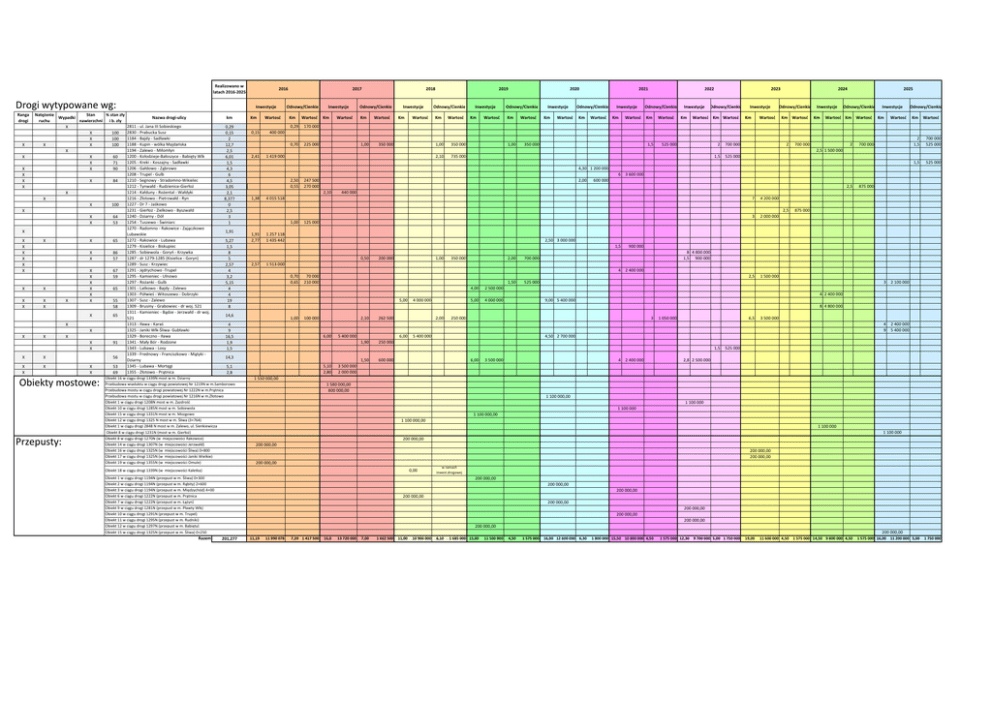 Realizowano w latach 2016-2025 Drogi wytypowane wg: Ranga drogi X X X X X X Natężenie Stan % stan zły Wypadki ruchu nawierzchni i b. zły X X 100 X 100 X X 100 X X 60 X 71 X 90 X 84 X X X 100 X X 64 53 X X X X X X X X X X X X X X X X X 65 X X 86 57 X X X X X X X 67 59 65 55 58 65 X X X X X X X X X X X X 56 X X Obiekty mostowe: Przepusty: 91 53 69 2016 Inwestycje Nazwa drogi-ulicy km 2811 - ul. Jana III Sobieskiego 2830 - Prabucka Susz 1184 - Bajdy - Sadławki 1188 - Kupin - wólka Majdańska 1194 - Zalewo - Miłomłyn 1200 - Kołodzieje-Bałoszyce - Babięty Wlk 1205 - Kreki - Koszajny - Sadławki 1206 - Gałdowo - Ząbrowo 1208 - Trupel - Gulb 1210 - Segnowy - Stradomno-Wikielec 1212 - Tynwałd - Rudzienice-Gierłoż 1214 - Kałduny - Rożental - Wałdyki 1216 - Złotowo - Pietrzwałd - Ryn 1227 - Dr 7 - Jaśkowo 1231 - Gierłoż - Zielkowo - Byszwałd 1240 - Dziarny - Dół 1254 - Tuszewo - Świniarc 1270 - Radomno - Rakowice - Zajączkowo Lubawskie 1272 - Rakowice - Lubawa 1279 - Kisielice - Biskupiec 1285 - Sobiewola - Goryń - Krzywka 1287 - dr 1279-1285 (Kisielice - Goryn) 1289 - Susz - Krzywiec 1291 - Jędrychowo -Trupel 1295 - Kamieniec - Ulnowo 1297 - Rożanki - Gulb 1301 - Latkowo - Bajdy - Zalewo 1303 - Półwieś - Witoszewo - Dobrzyki 1307 - Susz - Zalewo 1309 - Brusiny - Grabowiec - dr woj. 521 1311 - Kamieniec - Bądze - Jerzwałd - dr woj. 521 1313 - Iława - Karaś 1325 - Janiki Wlk-Śliwa- Gubławki 1329 - Boreczno - Iława 1341 - Mały Bór - Rodzone 1343 - Lubawa - Losy 1339 - Frednowy - Franciszkowo - Mątyki Dziarny 1345 - Lubawa - Mortęgi 1355 - Złotowo - Prątnica 0,29 0,15 2 12,7 2,5 6,01 1,5 4,3 6 4,5 3,05 2,1 8,377 0 2,5 3 1 1,91 5,27 1,5 8 5 2,57 4 3,2 5,15 4 4 19 8 Km 0,15 Wartosć 2017 Odnowy/Cienkie Km Wartosć 0,29 170 000 0,70 225 000 Inwestycje Km Wartosć Odnowy/Cienkie Km Wartosć Inwestycje Km 1,00 350 000 Odnowy/Cienkie Km 1,00 Wartosć Inwestycje Km Wartosć 2020 Odnowy/Cienkie Km Wartosć Inwestycje Km Wartosć 2021 Odnowy/Cienkie Km Wartosć Inwestycje Km Wartosć 2022 Odnowy/Cienkie Km Wartosć Inwestycje Km 2023 Odnowy/Cienkie Wartosć Km Wartosć Inwestycje Km Wartosć 2024 Odnowy/Cienkie Km Wartosć Inwestycje Km 2025 Odnowy/Cienkie Wartosć Km Wartosć Inwestycje Km Wartosć Odnowy/Cienkie Km Wartosć 350 000 1,00 350 000 1,5 525 000 2 700 000 2 700 000 2 2 1,5 700 000 525 000 1,5 525 000 1 575 000 16,00 11 200 000 5,00 1 750 000 700 000 2,5 1 500 000 2,41 1 419 000 2,10 735 000 1,5 525 000 4,30 1 200 000 6 3 600 000 2,50 0,55 247 500 270 000 2,00 1,38 600 000 2,5 2,10 4 015 518 7 4 200 000 3 2 000 000 2,5 1 500 000 2,5 1,00 1,91 2,77 875 000 125 000 1 257 118 1 435 442 2,50 3 000 000 1,5 0,50 2,57 875 000 440 000 200 000 1,00 350 000 2,00 900 000 8 4 800 000 1,5 900 000 700 000 1 513 000 4 2 400 000 0,70 0,65 70 000 210 000 1,50 4,00 525 000 3 2 100 000 4 9 2 400 000 5 400 000 2 500 000 4 2 400 000 5,00 4 000 000 5,00 4 000 000 9,00 5 400 000 8 4 800 000 1,00 100 000 4 9 16,5 1,9 1,5 2,10 6,00 262 500 5 400 000 2,00 6,00 1,90 250 000 1,50 600 000 250 000 3 5 400 000 1 050 000 6,5 5,10 2,80 5,1 2,8 3 500 000 4,50 2 700 000 1,5 14,3 6,00 3 500 000 4 2 400 000 525 000 2,8 2 500 000 3 500 000 2 000 000 1 550 000,00 1 580 000,00 800 000,00 1 100 000,00 1 100 000 1 100 000 1 100 000,00 1 100 000,00 1 100 000 1 100 000 200 000,00 200 000,00 200 000,00 200 000,00 200 000,00 0,00 Obiekt 18 w ciągu drogi 1339N (w miejscowości Kaletka) w ramach inwest.drogowej 200 000,00 Obiekt 1 w ciągu drogi 1194N (przepust w m. Śliwa) 0+300 Obiekt 2 w ciągu drogi 1194N (przepust w m. Rąbity) 2+600 Obiekt 3 w ciągu drogi 1194N (przepust w m. Międzychód) 4+00 Obiekt 6 w ciągu drogi 1222N (przepust w m. Prątnica Obiekt 7 w ciągu drogi 1222N (przepust w m. Łążyn) Obiekt 9 w ciągu drogi 1281N (przepust w m. Pławty Wlk) Obiekt 10 w ciągu drogi 1291N (przepust w m. Trupel) Obiekt 11 w ciągu drogi 1295N (przepust w m. Rudniki) Obiekt 12 w ciągu drogi 1297N (przepust w m. Babięty) Obiekt 15 w ciągu drogi 1325N (przepust w m. Śliwa) 0+250 Razem Wartosć 2019 400 000 14,6 Obiekt 16 w ciągu drogi 1339N most w m. Dziarny Przebudowa wiaduktu w ciągu drogi powiatowej Nr 1219N w m.Samborowo Przebudowa mostu w ciągu drogi powiatowej Nr 1222N w m.Prątnica Przebudowa mostu w ciągu drogi powiatowej Nr 1216N w m.Złotowo Obiekt 1 w ciągu drogi 1208N most w m. Zazdrość Obiekt 10 w ciągu drogi 1285N most w m. Sobiewola Obiekt 15 w ciągu drogi 1331N most w m. Mozgowo Obiekt 12 w ciągu drogi 1325 N most w m. Śliwa (3+764) Obiekt 1 w ciągu drogi 2848 N most w m. Zalewo, ul. Sienkiewicza Obiekt 8 w ciągu drogi 1231N (most w m. Gierłoż) Obiekt 8 w ciągu drogi 1270N (w miejscowości Rakowice) Obiekt 14 w ciągu drogi 1307N (w miejscowości Jerzwałd) Obiekt 16 w ciągu drogi 1325N (w miejscowości Śliwa) 0+800 Obiekt 17 w ciągu drogi 1325N (w miejscowości Janiki Wielkie) Obiekt 19 w ciągu drogi 1355N (w miejscowości Omule) 2018 200 000,00 200 000,00 200 000,00 200 000,00 200 000,00 200 000,00 200 000,00 200 000,00 200 000,00 201,277 11,19 11 990 078 7,39 1 417 500 16,0 13 720 000 7,00 1 662 500 11,00 10 900 000 6,10 1 685 000 15,00 11 500 000 4,50 1 575 000 16,00 12 600 000 6,30 1 800 000 15,50 10 800 000 4,50 1 575 000 12,30 9 700 000 5,00 1 750 000 19,00 11 600 000 4,50 1 575 000 14,50 9 800 000 4,50