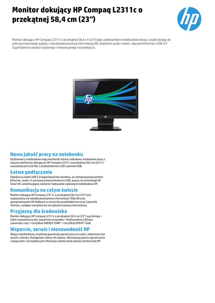 Monitor dokujący HP Compaq L2311c o przekątnej 58,4 cm (23") Monitor dokujący HP Compaq L2311c o przekątnej 58,4 cm (23") daje użytkownikom notebooków łatwy i szybki dostęp do pełnowymiarowego pulpitu z wbudowaną kamerą internetową HD, wejściami audio i wideo, złączami Ethernet i USB 3.0 SuperSpeed w postaci stylowego i innowacyjnego wyświetlacza. Nowa jakość pracy na notebooku Użytkownicy notebooków mają możliwość łatwej rozbudowy środowiska pracy z nowym monitorem dokującym HP Compaq L2311c o przekątnej 58,4 cm (23") z wyświetlaczem LCD HD, z podświetleniem LED i portami USB. Łatwe podłączanie Pojedynczy kabel USB 3.0 SuperSpeed do monitora, ze zintegrowanym portem Ethernet, audio i 4-portowym koncentratorem USB, oparty na technologii HP Smart AC umożliwiającej zasilanie i ładowanie wybranych notebooków HP. Komunikacja na całym świecie Monitor dokujący HP Compaq L2311c o przekątnej 58,4 cm (23") jest wyposażony we wbudowaną kamerę internetową 720p HD oraz oprogramowanie HP MyRoom w wersji dla przedsiębiorstw oraz Cyberlink YouCam, wydajne narzędzie do zarządzania kamerą internetową. Przyjazny dla środowiska Monitor dokujący HP Compaq L2311c o przekątnej 58,4 cm (23") wyróżniają: • Szkło wyświetlacza bez zawartości arszeniku • Podświetlenie LED bez zawartości rtęci • Certyfikat ENERGY STAR® • Certyfikat EPEAT® Gold Wsparcie, serwis i niezawodność HP Objęty standardową, trzyletnią gwarancją ograniczoną na części, robociznę oraz serwis u klienta. Dostępność zależy od regionu. Obowiązują pewne ograniczenia i wyłączenia. Szczegółowych informacji udziela dział pomocy technicznej HP. Monitor dokujący HP Compaq L2311c o przekątnej 58,4 cm (23") Rozmiar wyświetlacza (przekątna) 58,4 cm (23") Kąt podglądu 170° w poziomie; 160° w pionie Jasność 250 cd/m² Współczynnik kontrastu 1000:1 statyczny; 1000000:1 dynamiczny Poziom reakcji 5 ms (wł./wył.) Rozdzielczość własna 1920 x 1080 Współczynnik kształtu Szeroki ekran (16:9) Funkcje wyświetlacza Antyodblaskowy; Wybór języka; Funkcja Plug and Play (podłącz i pracuj); Ustawiane przez użytkownika; Menu ekranowe Sygnał wejściowy 1 port wyjściowy USB 3.0; 1 gniazdo VGA; Moc wyjściowa Napięcie wejściowe: 100–240 V Pobór mocy Zasilacz 55 W (maksymalnie), 38 W (typowy), <1 W (tryb oczekiwania) Wymiary Z podstawą: 55,15 x 24,94 x 46,7 cm Z podstawą: 55,51 x 4,95 x 33,42 cm Waga 6,55 kg Ergonomia Nachylenie: Od -5 do +30°; Obrót: ±180° Ochrona środowiska Temperatura pracy: Od 5 do 35°C Wilgotność podczas pracy: Wilgotność wzgl. 20–80% Gwarancja 3-letnia ograniczona gwarancja, obejmująca 3 lata gwarancji na części, robociznę i serwis u klienta. Obowiązują pewne ograniczenia i wyłączenia. Pełne zaangażowanie dzięki usługom finansowym HP Pełne zaangażowanie dzięki usługom finansowym HP ułatwia wdrażanie innowacyjnych technologii w celu zwiększenia wartości biznesowej i zapewnienia przewagi nad konkurencją. Więcej informacji pod adresem na www.hp.com/go/hpfs. © 2012 Hewlett-Packard Development Company L.P. Niniejsze informacje mogą ulec zmianie bez powiadomienia. Jedyne gwarancje, jakich udziela HP na produkty i usługi, są określone w oświadczeniach gwarancyjnych dostarczanych wraz z takimi produktami i usługami. Niniejszy dokument nie może być interpretowany jako dodatkowa gwarancja. HP nie ponosi odpowiedzialności za błędy techniczne lub redakcyjne oraz braki występujące w niniejszym dokumencie. Więcej informacji znajdziesz pod adresem www.hp.eu/monitors 4AA4-1558PLE, Lipiec 2013 Monitor dokujący HP Compaq L2311c o przekątnej 58,4 cm (23") Akcesoria i usługi (nie wchodzą w skład zestawu) Karta graficzna USB HP HP oferuje liczne opcjonalne produkty (każdy sprzedawany oddzielnie), które stanowią dopełnienie monitora i usprawniają korzystanie z komputera. Niewielki adapter HP USB Graphics Adapter umożliwia podłączenie nawet 6 monitorów oraz zwiększenie produktywności i wielozadaniowości dzięki obsłudze wielu aplikacji jednocześnie. Za pomocą jednego adaptera można połączyć notebook lub komputer biurkowy z drugim monitorem, a stosując kilka adapterów, można połączyć kilka monitorów. Obsługuje rozdzielczość do 1920 x 1080 (panoramiczny) lub 1600 x 1200 (tradycyjny). Numer produktu: NL571AA Serwis u klienta w następnym dniu roboczym przez 3 lata Jeśli problemu nie można rozwiązać zdalnie, naprawa komputera zostanie przeprowadzona z dojazdem na miejsce w następnym dniu roboczym przez specjalistę zakwalifikowanego przez HP. Numer produktu: U7935E © 2012 Hewlett-Packard Development Company L.P. Niniejsze informacje mogą ulec zmianie bez powiadomienia. Jedyne gwarancje, jakich udziela HP na produkty i usługi, są określone w oświadczeniach gwarancyjnych dostarczanych wraz z takimi produktami i usługami. Niniejszy dokument nie może być interpretowany jako dodatkowa gwarancja. HP nie ponosi odpowiedzialności za błędy techniczne lub redakcyjne oraz braki występujące w niniejszym dokumencie. Więcej informacji znajdziesz pod adresem www.hp.eu/hpoptions 4AA4-1558PLE, Lipiec 2013