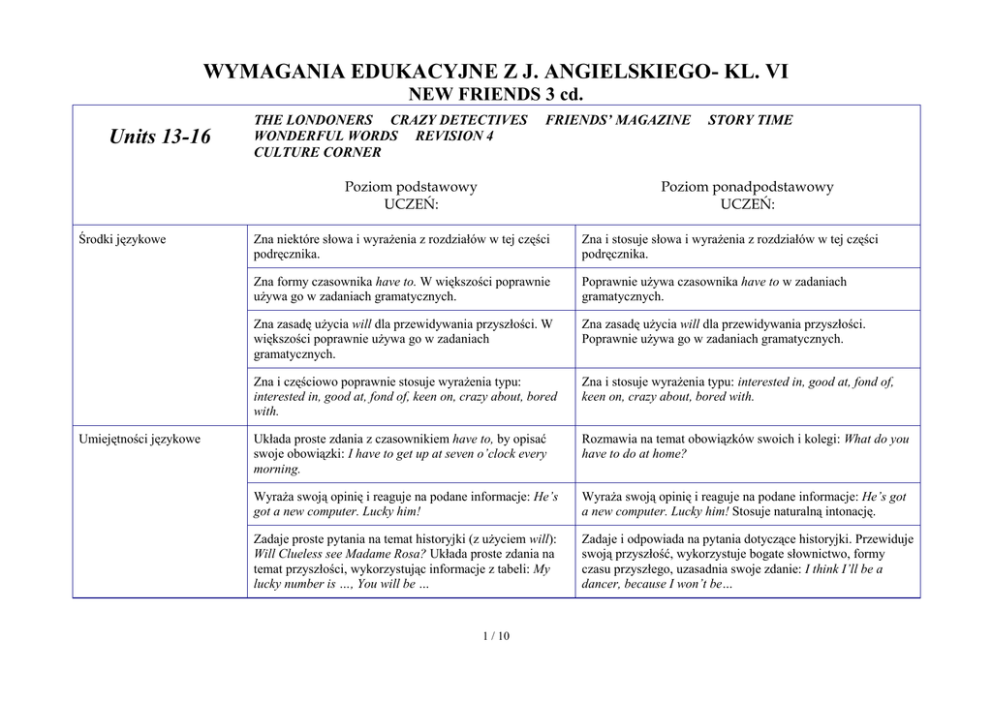 WYMAGANIA EDUKACYJNE Z J. ANGIELSKIEGO- KL. VI NEW FRIENDS 3 cd. Units 13-16 THE LONDONERS CRAZY DETECTIVES WONDERFUL WORDS REVISION 4 CULTURE CORNER FRIENDS’ MAGAZINE Poziom podstawowy UCZEŃ: Środki językowe Umiejętności językowe STORY TIME Poziom ponadpodstawowy UCZEŃ: Zna niektóre słowa i wyrażenia z rozdziałów w tej części podręcznika. Zna i stosuje słowa i wyrażenia z rozdziałów w tej części podręcznika. Zna formy czasownika have to. W większości poprawnie używa go w zadaniach gramatycznych. Poprawnie używa czasownika have to w zadaniach gramatycznych. Zna zasadę użycia will dla przewidywania przyszłości. W większości poprawnie używa go w zadaniach gramatycznych. Zna zasadę użycia will dla przewidywania przyszłości. Poprawnie używa go w zadaniach gramatycznych. Zna i częściowo poprawnie stosuje wyrażenia typu: interested in, good at, fond of, keen on, crazy about, bored with. Zna i stosuje wyrażenia typu: interested in, good at, fond of, keen on, crazy about, bored with. Układa proste zdania z czasownikiem have to, by opisać swoje obowiązki: I have to get up at seven o’clock every morning. Rozmawia na temat obowiązków swoich i kolegi: What do you have to do at home? Wyraża swoją opinię i reaguje na podane informacje: He’s got a new computer. Lucky him! Wyraża swoją opinię i reaguje na podane informacje: He’s got a new computer. Lucky him! Stosuje naturalną intonację. Zadaje proste pytania na temat historyjki (z użyciem will): Will Clueless see Madame Rosa? Układa proste zdania na temat przyszłości, wykorzystując informacje z tabeli: My lucky number is …, You will be … Zadaje i odpowiada na pytania dotyczące historyjki. Przewiduje swoją przyszłość, wykorzystuje bogate słownictwo, formy czasu przyszłego, uzasadnia swoje zdanie: I think I’ll be a dancer, because I won’t be… 1 / 10 WYMAGANIA EDUKACYJNE Z J. ANGIELSKIEGO- KL. VI NEW FRIENDS 3 cd. Pisze krótki e-mail, przedstawia się, pisze o swoich zainteresowaniach, stosuje wyrażenia typu: interested in. Pisze e-mail, szczegółowo opisuje swoje zainteresowania, prawidłowo stosuje wyrażenia typu: interested in, good at, fond of, keen on, crazy about, bored with. Prawidłowo zadaje pytania i odpowiada na nie dotyczące historyjki They came from Kitra 1. Swobodnie rozmawia na temat historyjki They came from Kitra 1, prawidłowo zadaje pytania i odpowiada na nie; wykorzystuje różnorodne konstrukcje gramatyczne i słownictwo. Zadaje kolegom i koleżankom pytania dotyczące użycia komputerów. Zadaje kolegom i koleżankom pytania dotyczące użycia komputerów. Krótko opisuje i przedstawia graficznie wyniki ankiety. Krótko opowiada o Kanadzie i jej mieszkańcach. Swobodnie rozmawia o Kanadzie i jej mieszkańcach, dokonuje porównania między Kanadą i Polską. Pisze krótki i prosty e-mail do kolegi z zimowiska w Kanadzie. Pisze e-mail do kolegi z zimowiska w Kanadzie. 2 / 10 WYMAGANIA EDUKACYJNE Z J. ANGIELSKIEGO- KL. VI NEW FRIENDS 3 cd. Units 17-20 THE LONDONERS CRAZY DETECTIVES WONDERFUL WORDS REVISION 5 READING CORNER FRIENDS’ MAGAZINE Poziom podstawowy UCZEŃ: Środki językowe Umiejętności językowe STORY TIME Poziom ponadpodstawowy UCZEŃ: Zna niektóre słowa i wyrażenia z rozdziałów w tej części podręcznika. Zna i stosuje słowa i wyrażenia z rozdziałów w tej części podręcznika. Zna niektóre wprowadzone formy past participle. Zna wprowadzone formy past participle. Zna formy czasu Present Perfect. Częściowo poprawnie stosuje ten czas w zadaniach gramatycznych. Używa czasu Present Perfect w zadaniach gramatycznych. Wskazuje w tekście zdania w czasie Present Perfect i Past Simple, rozumie różnicę w zastosowaniu tych czasów. Uzupełnia dialog czasownikami w czasie Present Perfect i Past Simple. Zna znaczenie wyrażeń: yet, just i already. Tworzy pojedyncze zdania i pytania w czasie Present Perfect z użyciem: yet, just i already oraz częściowo poprawnie używa ich w zadaniach gramatycznych. Poprawnie używa słów yet, just i already w zadaniach gramatycznych. Uzupełnia zdania zaimkami: somebody / somewhere / something / anybody / anything / anywhere / nobody / nothing / nowhere. Prawidłowo stosuje zaimki: some- / any- / no- w zadaniach gramatycznych. Potrafi wyrazić to samo znaczenie na dwa sposoby (np. nothing = not + anything). Uzupełnia informacje dotyczące Tessie (wiek, opis, historia lekarska). Swobodnie rozmawia na temat Tessie, zadaje pytania i odpowiada na nie: What colour is Tessie? She’s black and brown and white. 3 / 10 WYMAGANIA EDUKACYJNE Z J. ANGIELSKIEGO- KL. VI NEW FRIENDS 3 cd. Zadaje proste pytania dotyczące doświadczeń i potrafi na nie odpowiedzieć, używając czasu Present Perfect i słów ever/never: Have you ever seen a ghost? Yes, I have. Rozmawia na temat wydarzeń przeszłych, stosuje czasy: Present Perfect i Past Simple: Have you ever had an injection? Yes, I have., When was it? Nazywa hobby z obrazka. Krótko opowiada o swoim hobby. Swobodnie rozmawia na temat zainteresowań bohaterów przeczytanego tekstu, oraz zainteresowań własnych i swojej rodziny. Dość szczegółowo opisuje swoje hobby. Pisze krótki wywiad z kapitanem statku kosmicznego z przeczytanej historyjki. Pisze i prezentuje wywiad z kapitanem statku kosmicznego z przeczytanej historyjki: When did Spaceship Zeus disappear? Poprawnie stosuje indefinite pronouns. Prostymi słowami opisuje zwierzęta, które ma lub chciałby mieć, wypełnia ich kartę z danymi (Record Card). Dokładnie opisuje zwierzęta, które ma lub chciałby mieć; prawidłowo wypełnia kartę z danymi zwierzęcia (Record Card). Układa obrazki w porządku chronologicznym. Krótko i częściowo poprawnie opowiada historyjkę i wymyśla jej zakończenie. Opowiada historyjkę i przewiduje jej zakończenie; używa formy will: I think Henry and Marcel will go through the wall. Zapisuje zakończenie historyjki. 4 / 10 WYMAGANIA EDUKACYJNE Z J. AN